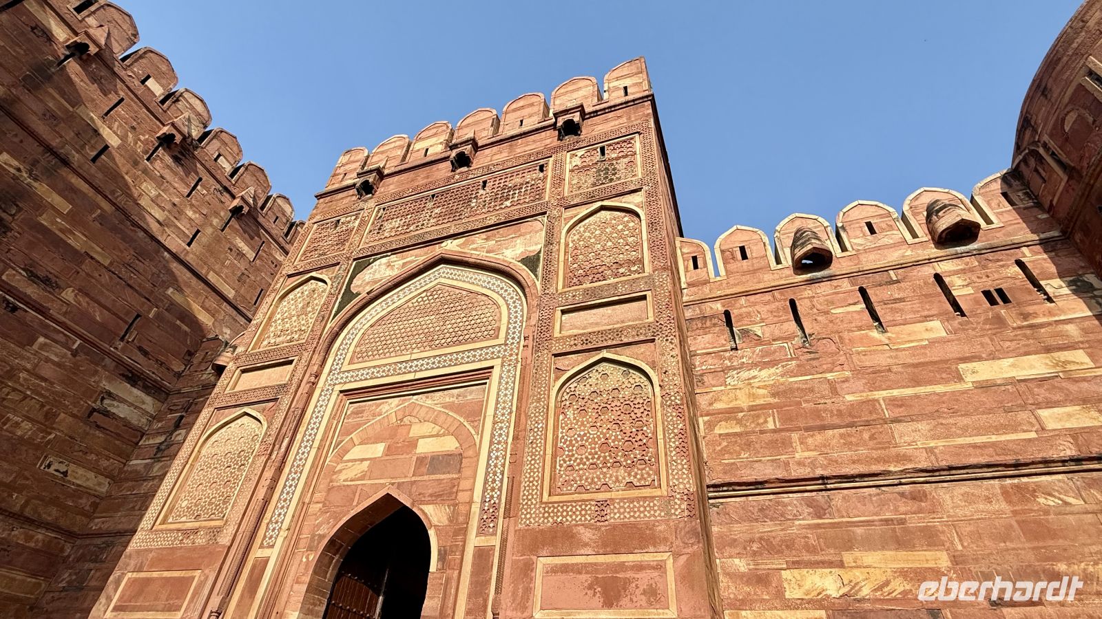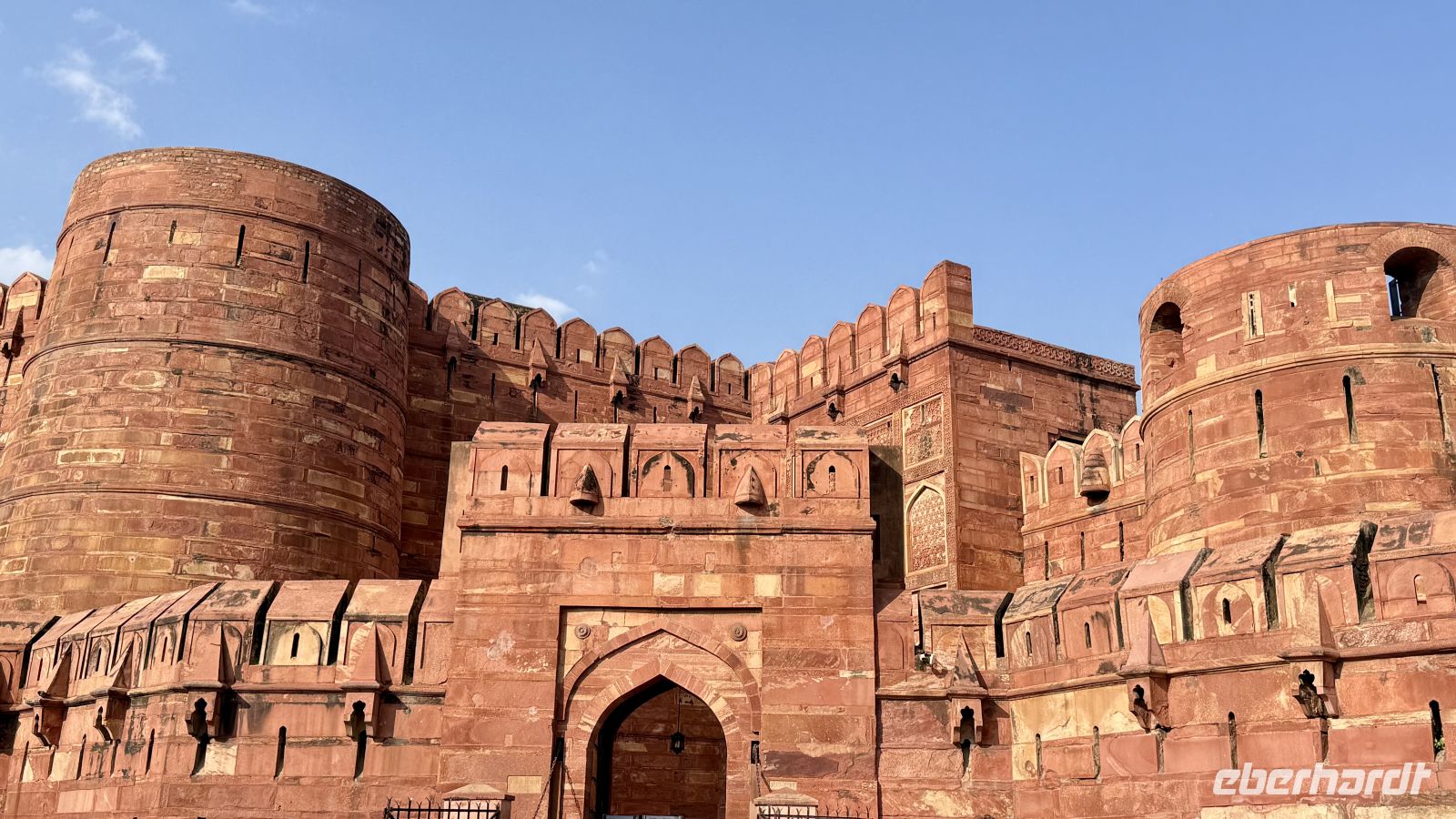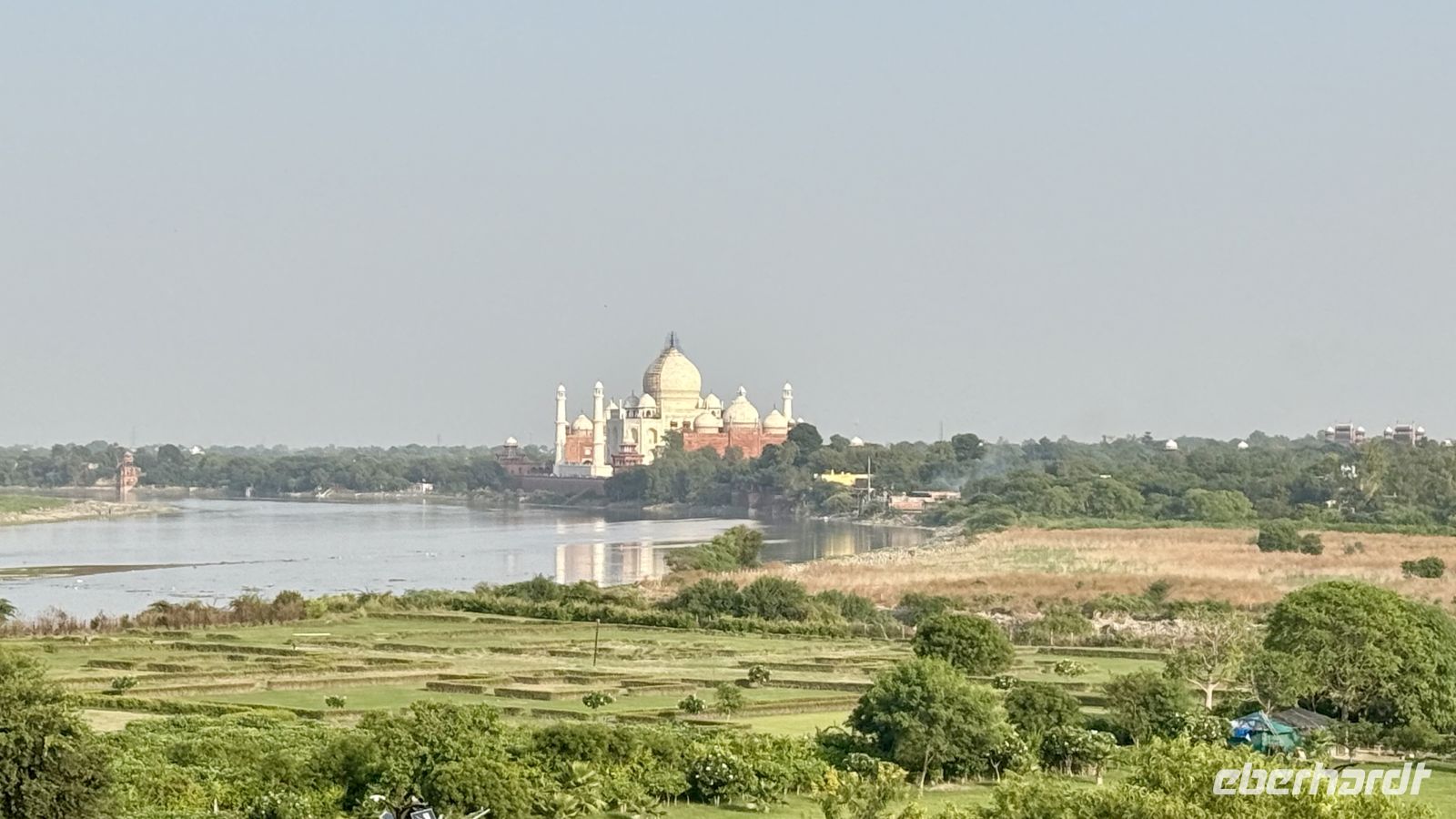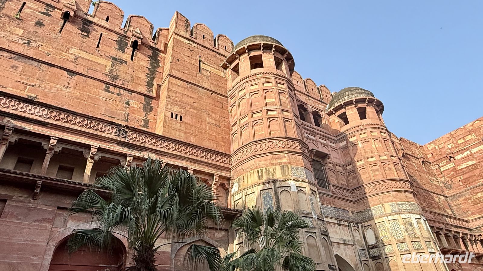 Am Nachmittag besuchten wir noch das Rote Fort von Agra, eine massive Festung aus rotem Sandstein, die ebenfalls zur Zeit der Mogulherrscher erbaut wurde. Innerhalb der mächtigen Mauern befinden sich prachtvolle Paläste, Moscheen und Gärten. Besonders beeindruckend war der Blick von den Bastionen des Forts – von dort aus konnte man in der Ferne das Taj Mahal erkennen.