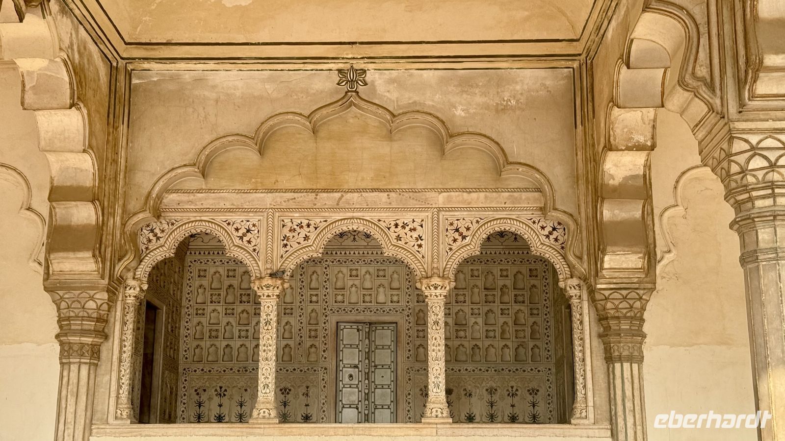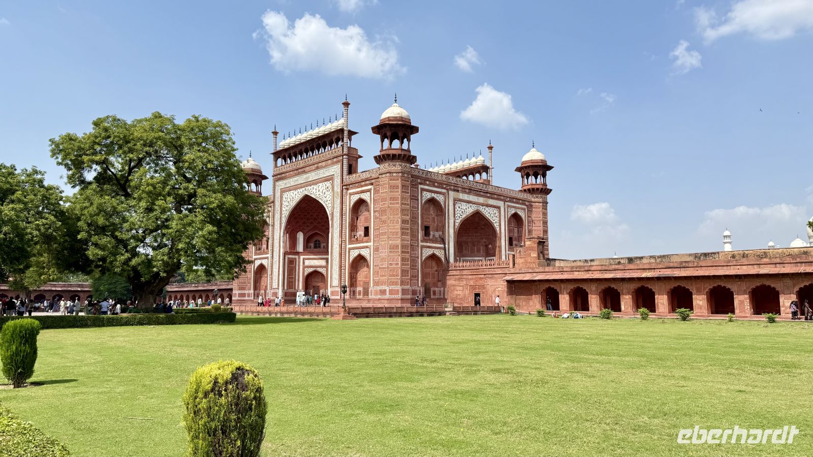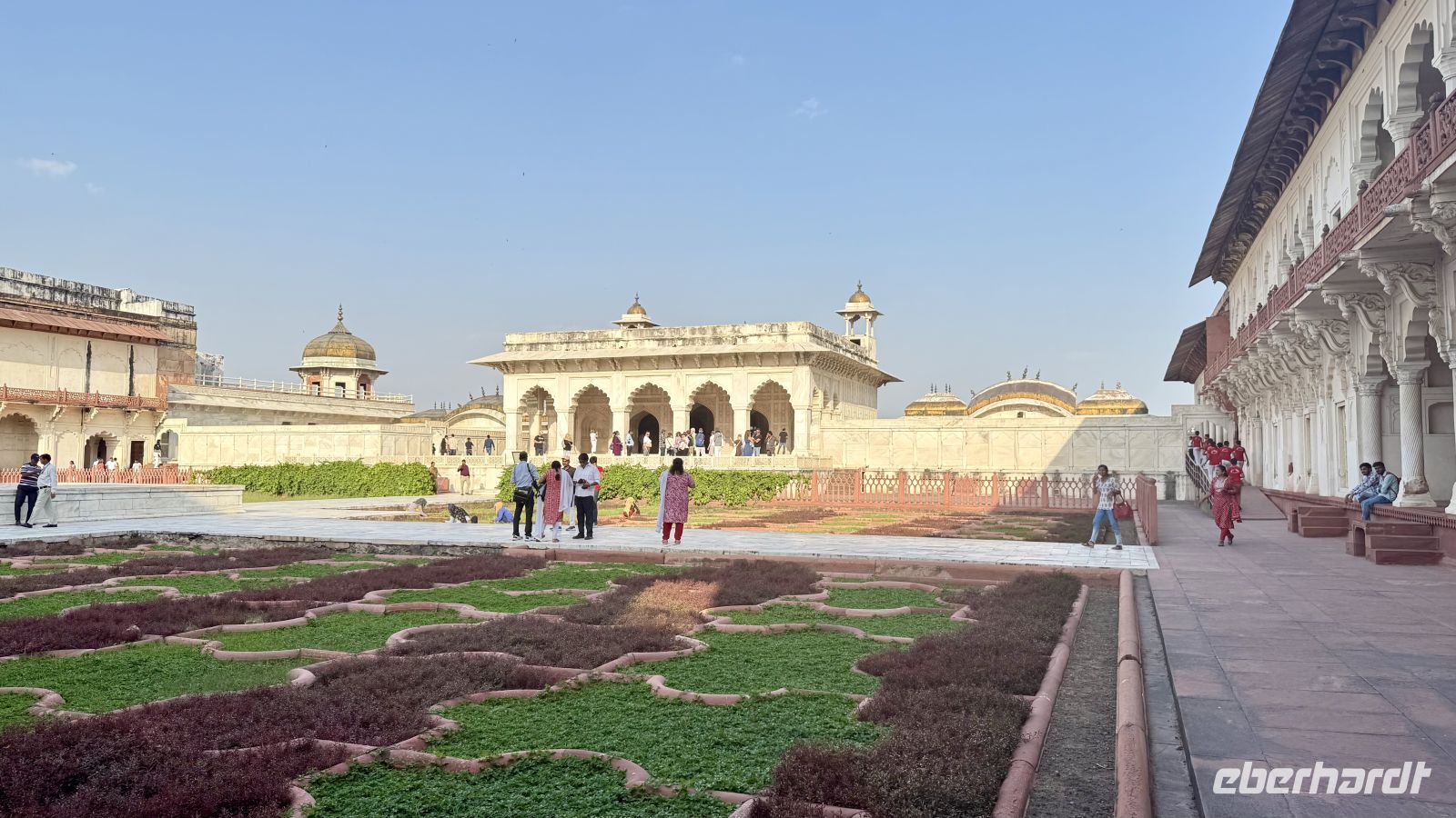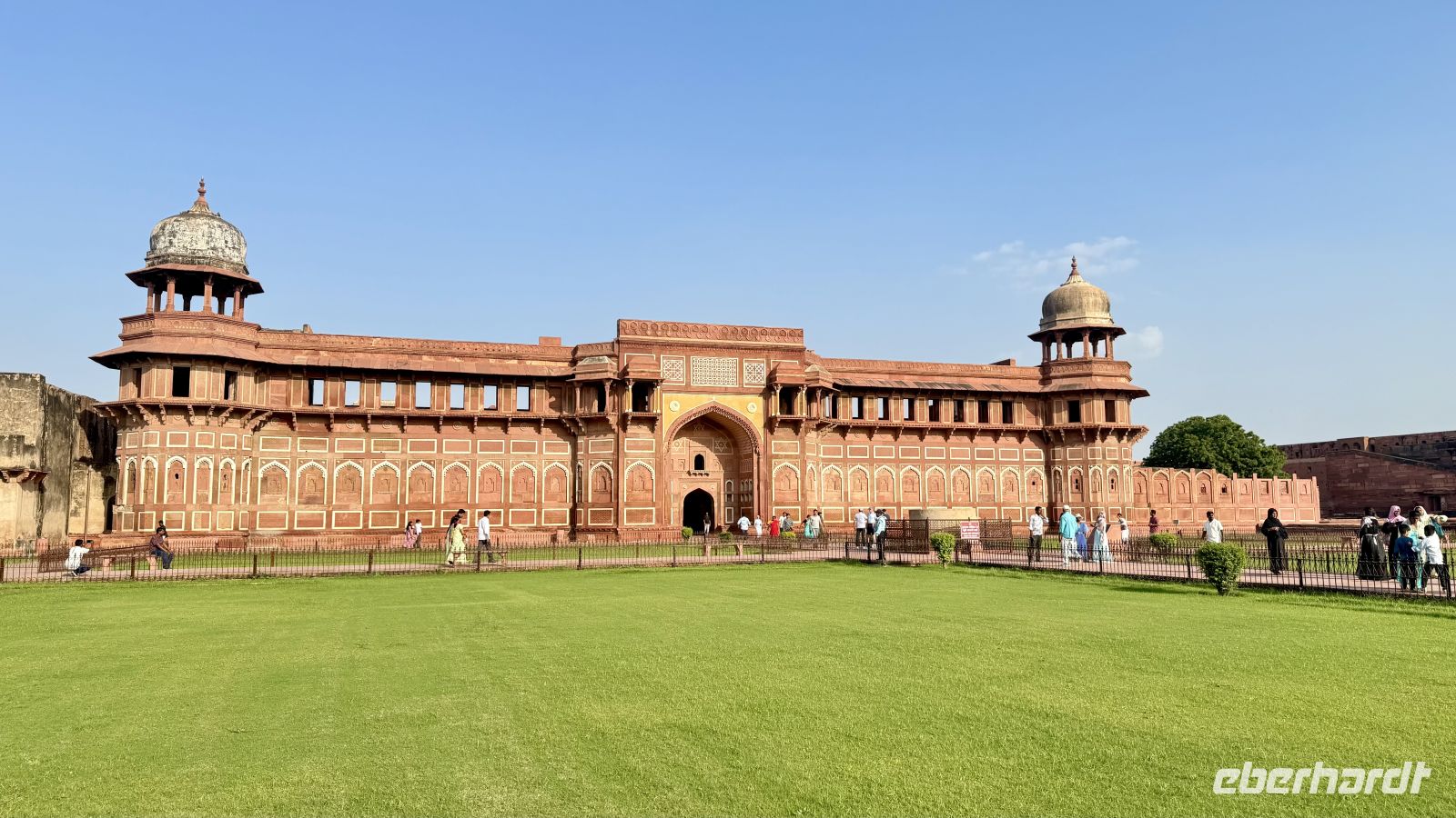Am Nachmittag besuchten wir noch das Rote Fort von Agra, eine massive Festung aus rotem Sandstein, die ebenfalls zur Zeit der Mogulherrscher erbaut wurde. Innerhalb der mächtigen Mauern befinden sich prachtvolle Paläste, Moscheen und Gärten. Besonders beeindruckend war der Blick von den Bastionen des Forts – von dort aus konnte man in der Ferne das Taj Mahal erkennen.