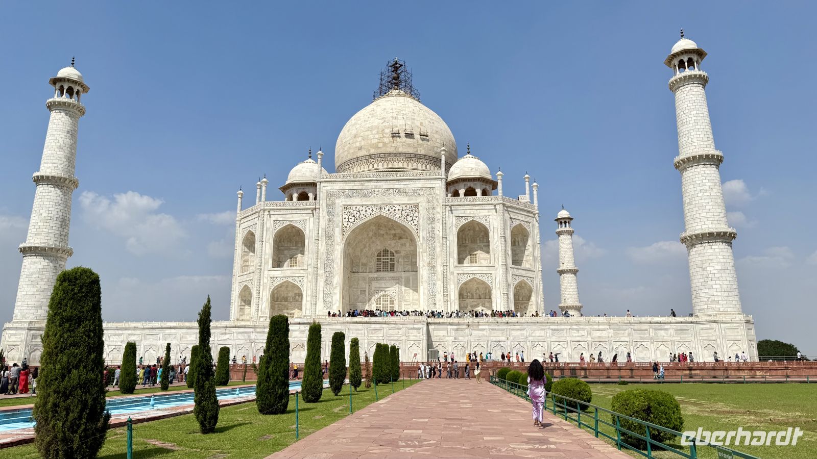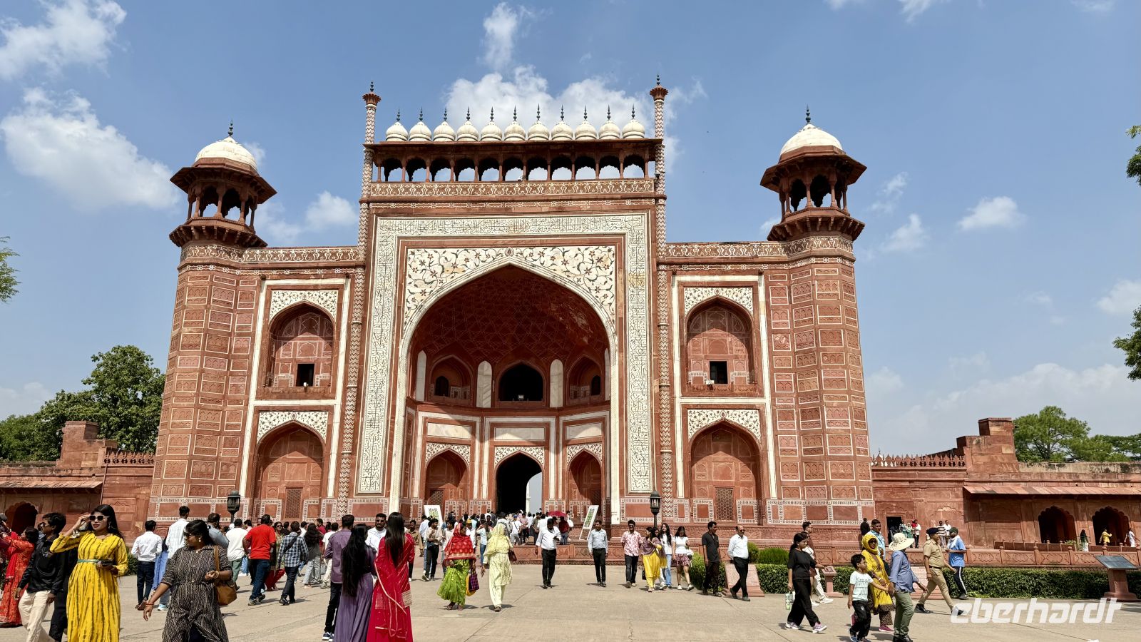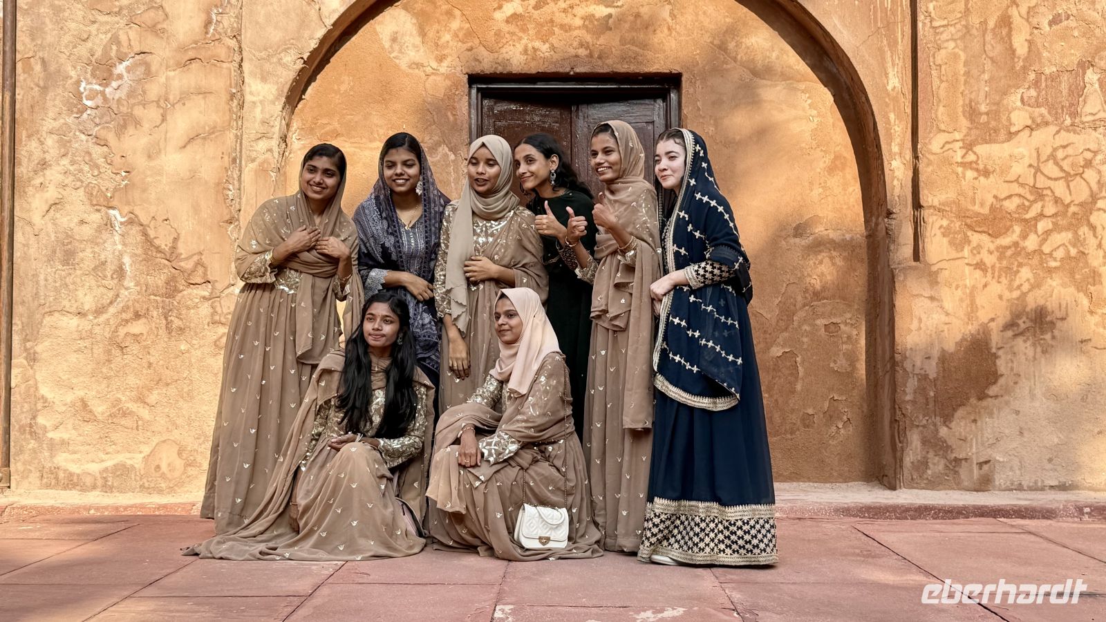 Kurz darauf erreichten wir schließlich Agra, eine historische Stadt am Ufer des Flusses Yamuna, die einst die Hauptstadt des Mogulreiches war. Hier erhebt sich das Taj Mahal, das von Mogulkaiser Shah Jahan im 17. Jahrhundert als Mausoleum für seine geliebte Frau Mumtaz Mahal erbaut wurde. Das Bauwerk besteht aus weißem Marmor und ist mit unzähligen Edelsteinen verziert. Besonders beeindruckend ist die Symmetrie der Anlage – alles, vom Eingangstor bis zur Kuppel, ist perfekt aufeinander abgestimmt. Wenn das Sonnenlicht auf das Marmorgewölbe trifft, verändert sich seine Farbe – morgens schimmert es rosa, mittags strahlend weiß und abends golden. Es war ein atemberaubender Anblick, und wir alle waren tief bewegt von der Schönheit und der Liebesgeschichte, die sich hinter diesem Bauwerk verbirgt.