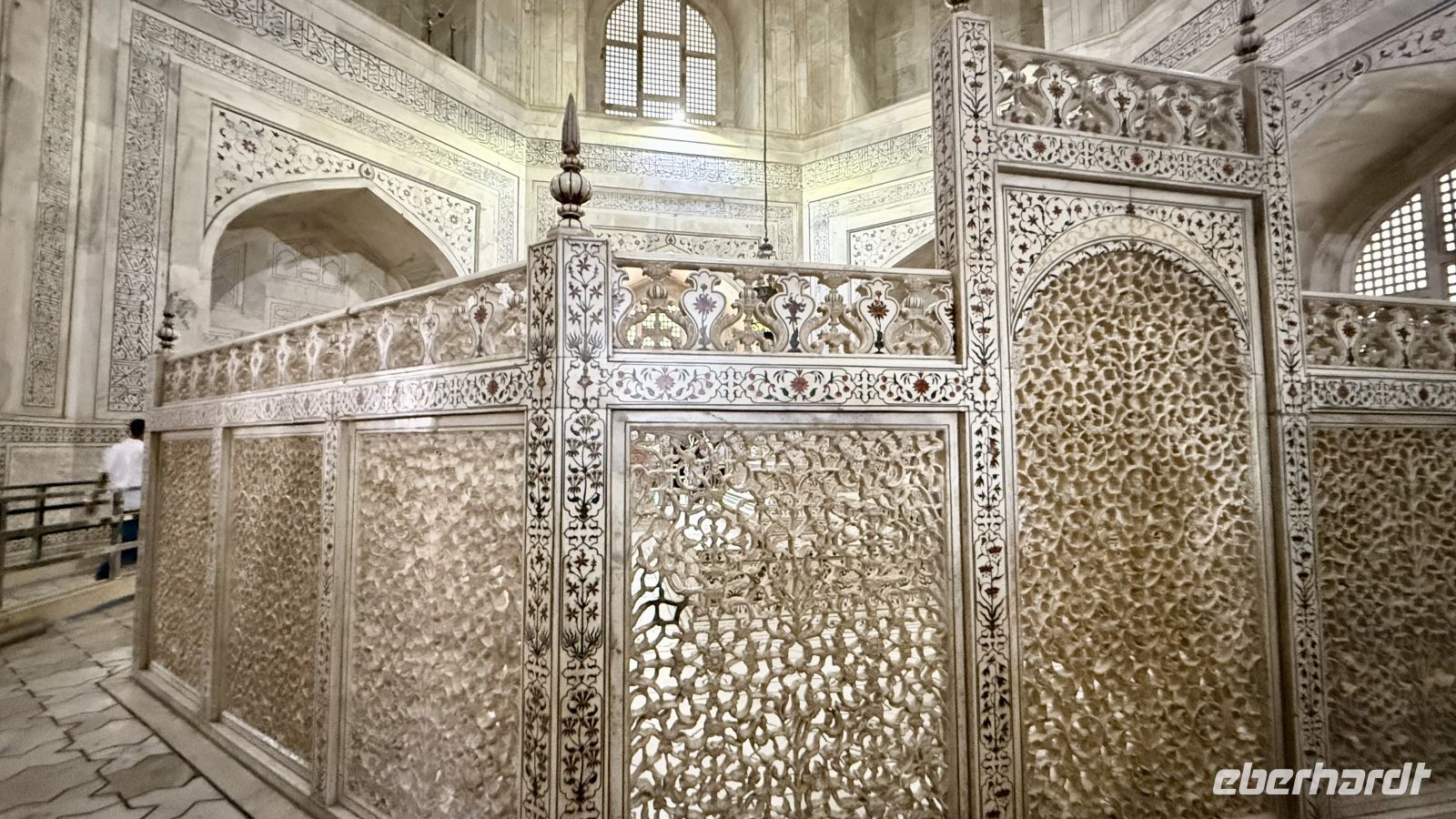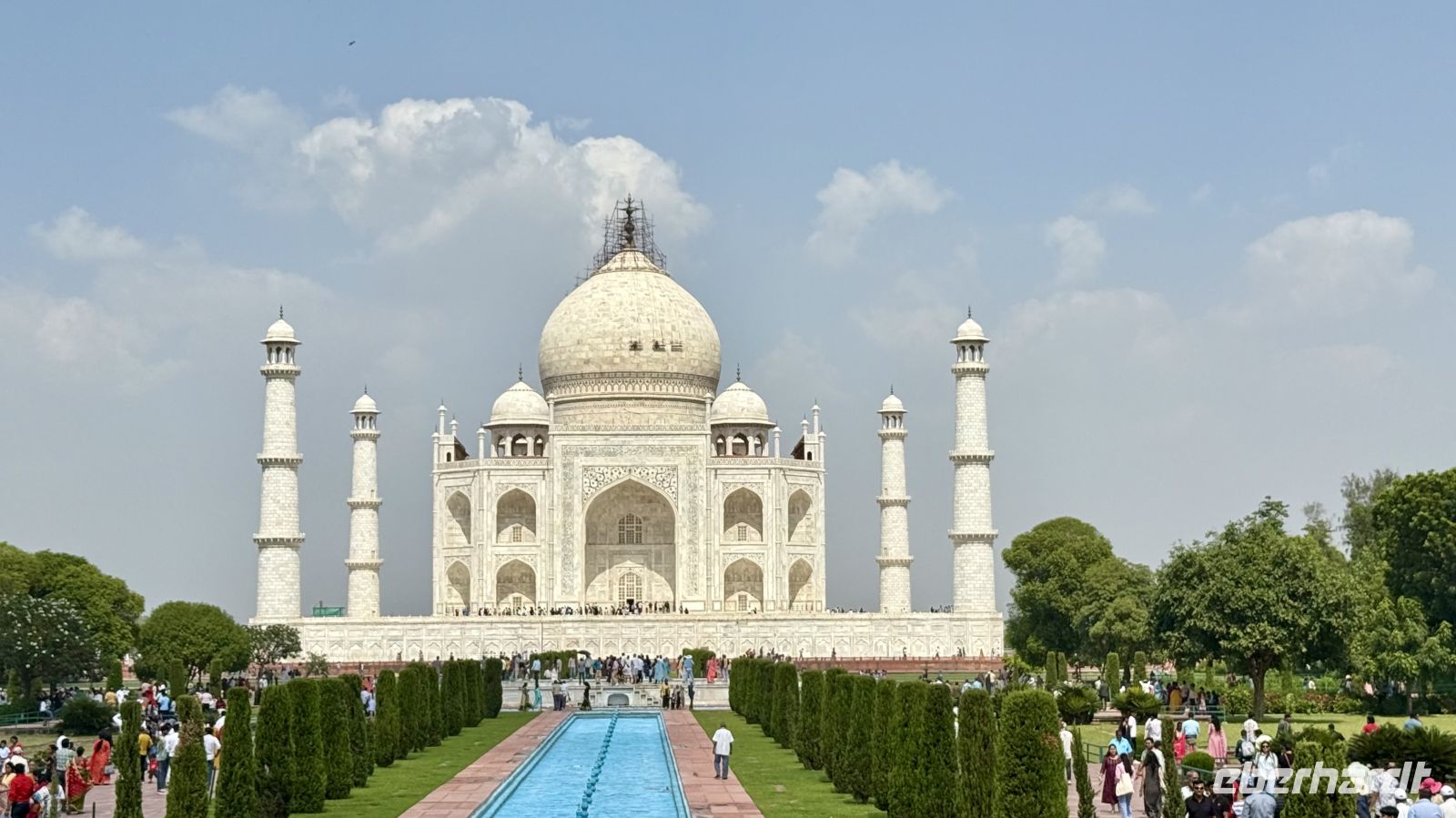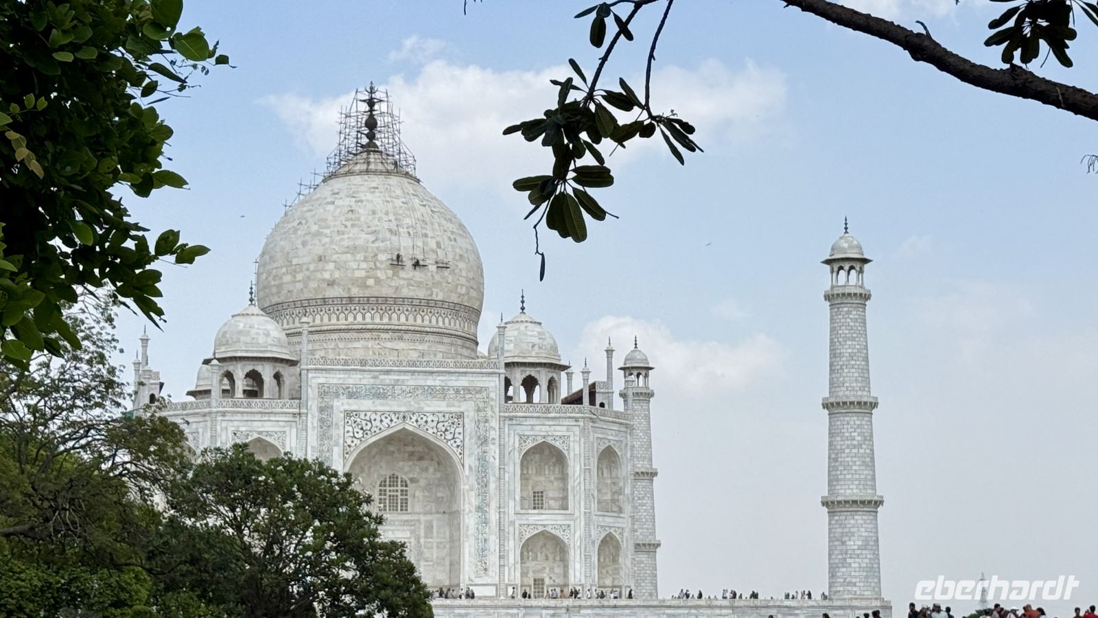 Kurz darauf erreichten wir schließlich Agra, eine historische Stadt am Ufer des Flusses Yamuna, die einst die Hauptstadt des Mogulreiches war. Hier erhebt sich das Taj Mahal, das von Mogulkaiser Shah Jahan im 17. Jahrhundert als Mausoleum für seine geliebte Frau Mumtaz Mahal erbaut wurde. Das Bauwerk besteht aus weißem Marmor und ist mit unzähligen Edelsteinen verziert. Besonders beeindruckend ist die Symmetrie der Anlage – alles, vom Eingangstor bis zur Kuppel, ist perfekt aufeinander abgestimmt. Wenn das Sonnenlicht auf das Marmorgewölbe trifft, verändert sich seine Farbe – morgens schimmert es rosa, mittags strahlend weiß und abends golden. Es war ein atemberaubender Anblick, und wir alle waren tief bewegt von der Schönheit und der Liebesgeschichte, die sich hinter diesem Bauwerk verbirgt.