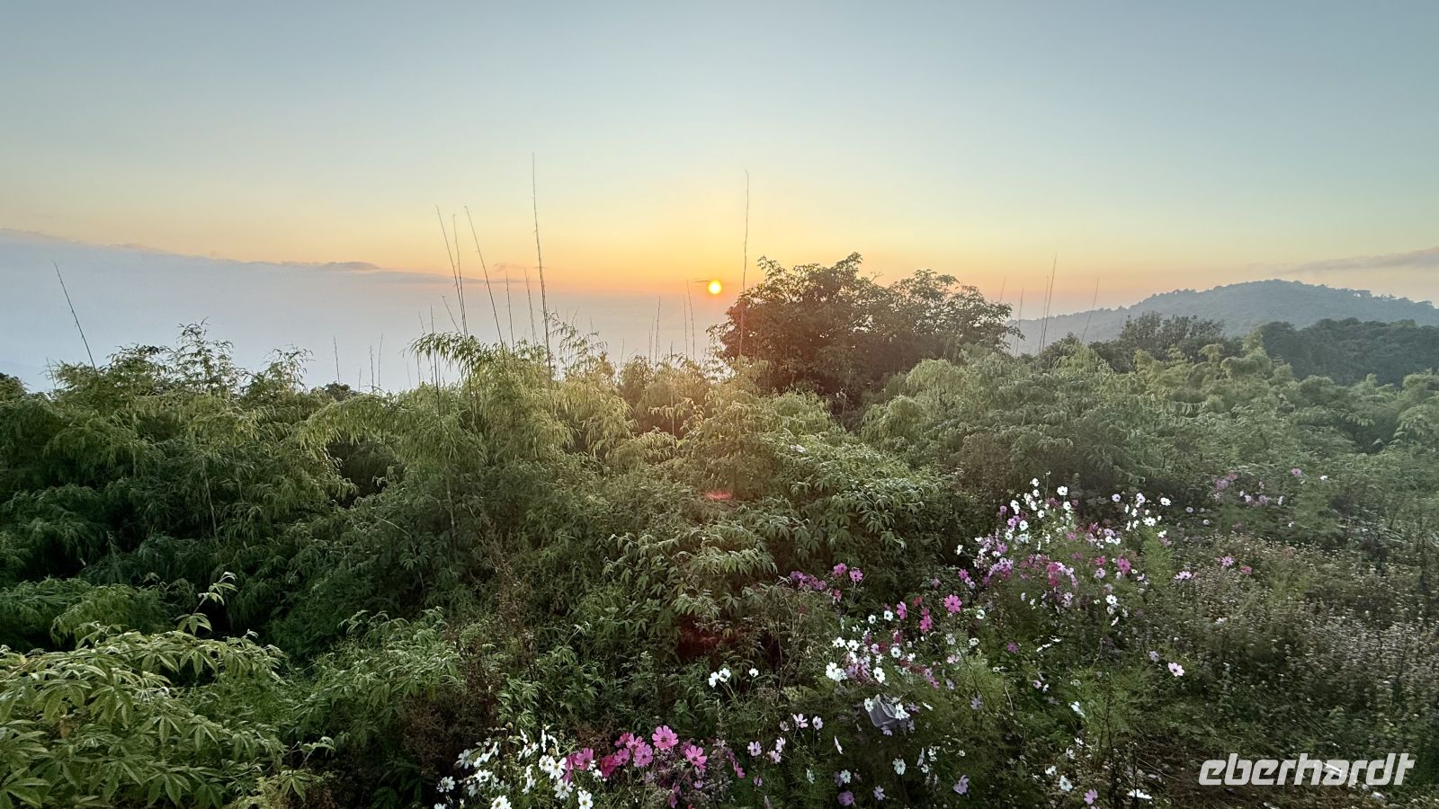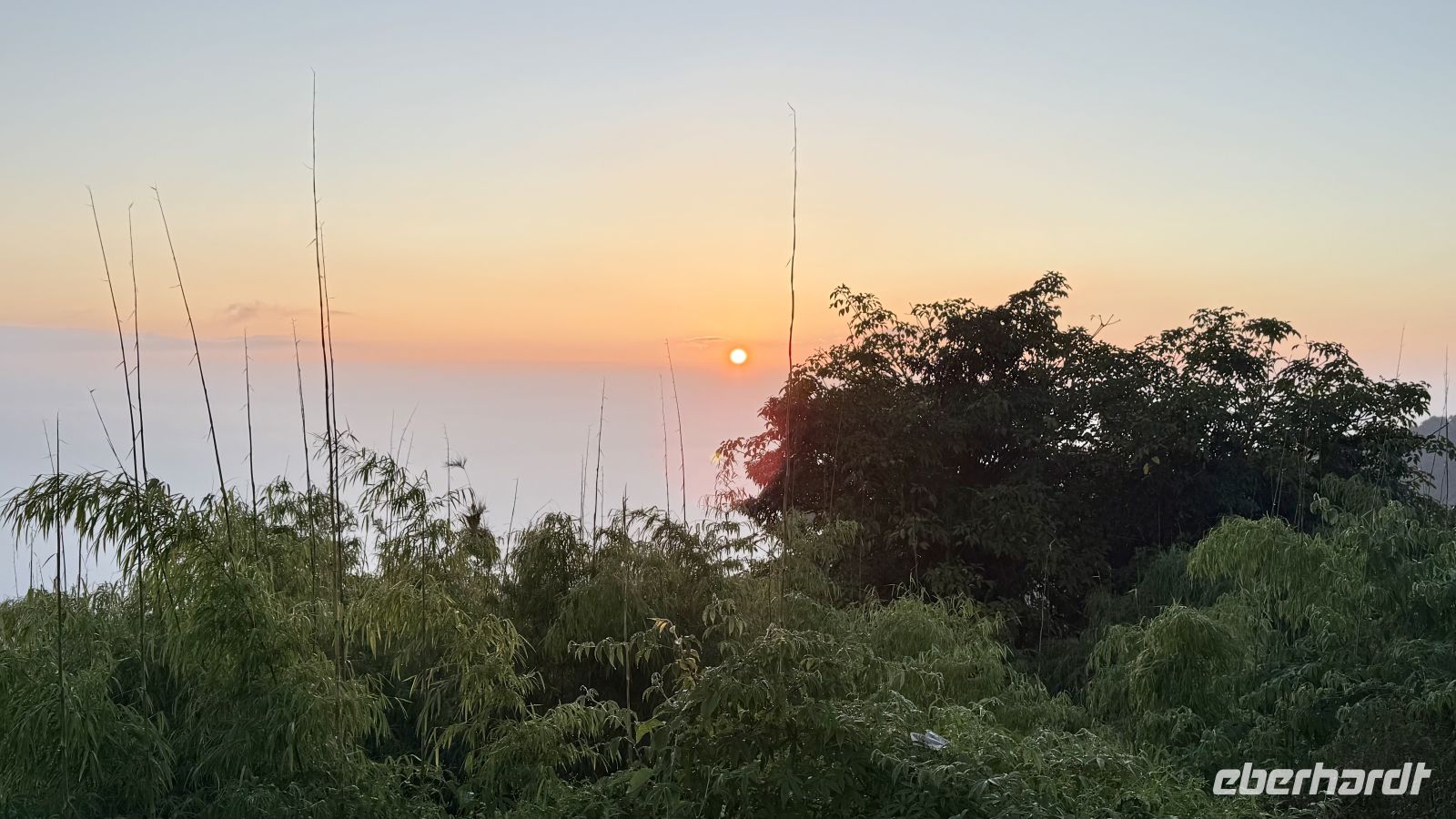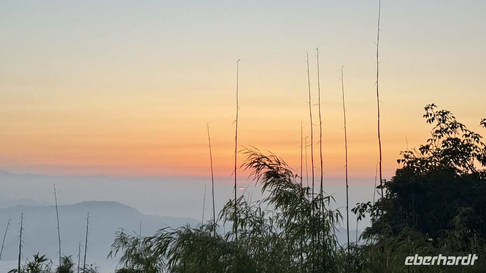 Leider schoben sich an diesem Morgen dichte Wolken über die Gebirgskette, sodass wir den erhofften Panoramablick nicht genießen konnten. Trotzdem wurden wir mit einem wunderschönen, stimmungsvollen Sonnenaufgang belohnt – die Wolken leuchteten in warmen Orange- und Rosatönen, und die frische Bergluft machte uns schnell munter. Danach freuten wir uns auf ein gemütliches Frühstück und eine heiße Tasse Kaffee oder Tee, die uns nach der morgendlichen Kälte besonders gut schmeckte.