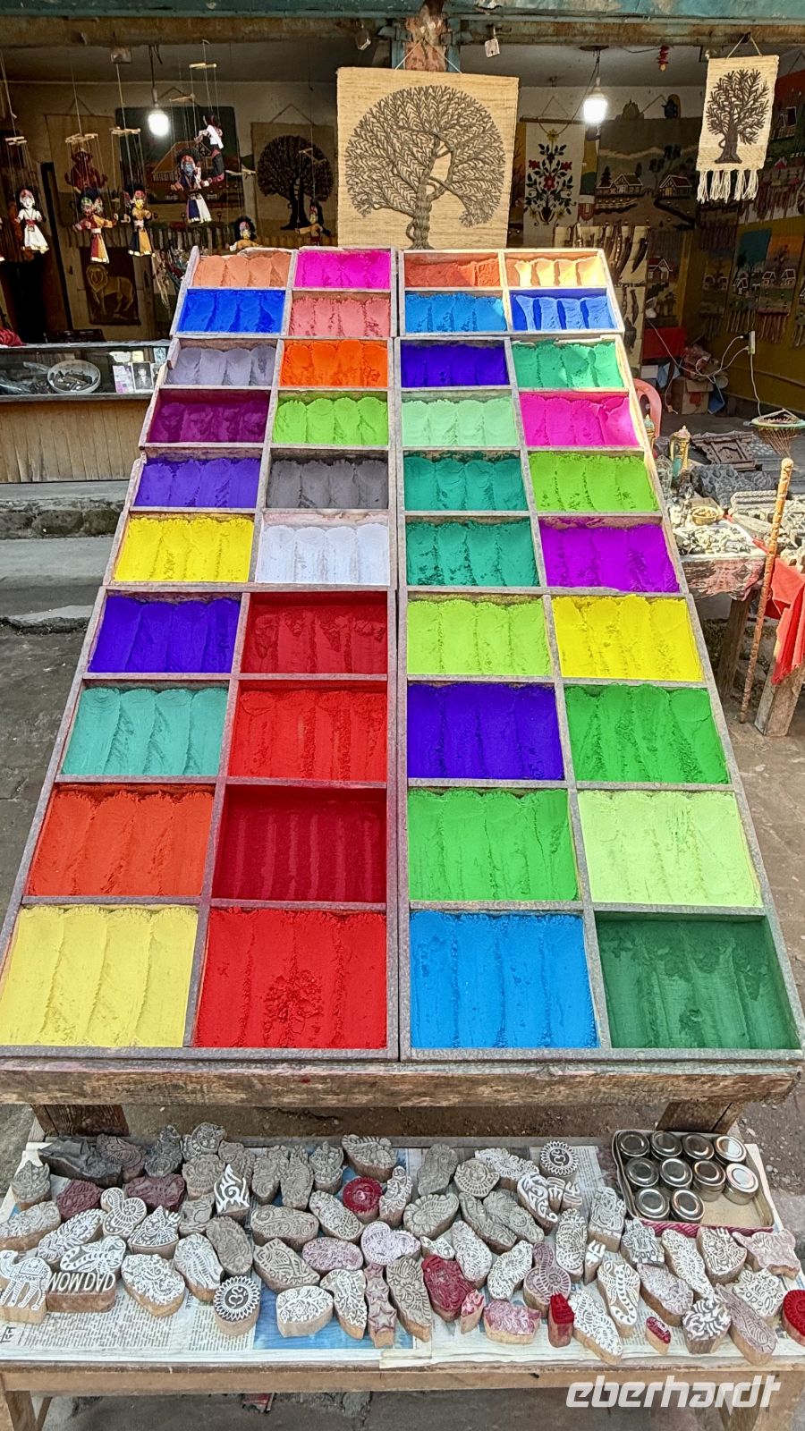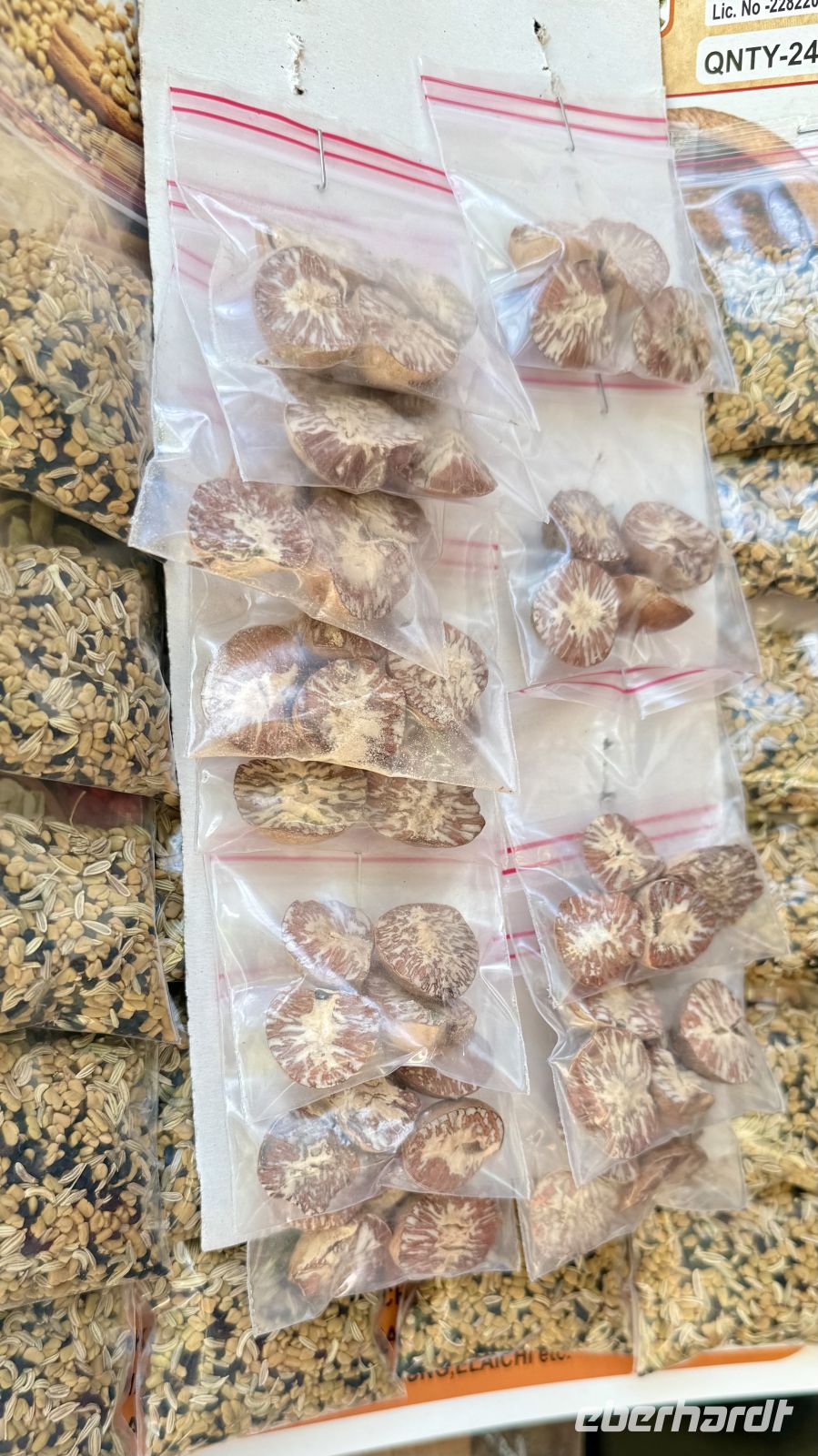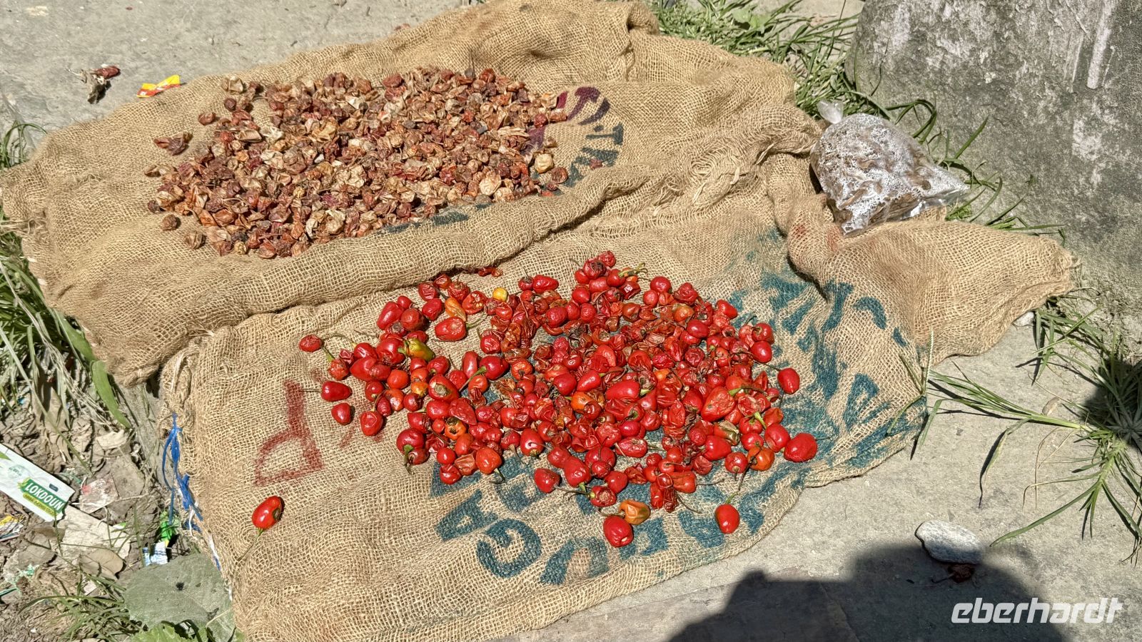 Unterwegs sahen wir Betelnüsse, die in dieser Region häufig angebaut und gekaut werden. Die Betelnuss ist eigentlich der Samen der Areka-Palme und wird traditionell mit Betelpfefferblättern und Kalkpaste zu kleinen Portionen zusammengerollt. Viele Menschen in Indien und Südostasien kauen diese Mischung – sie wirkt leicht anregend und hat eine symbolische Bedeutung bei Festen und religiösen Zeremonien.