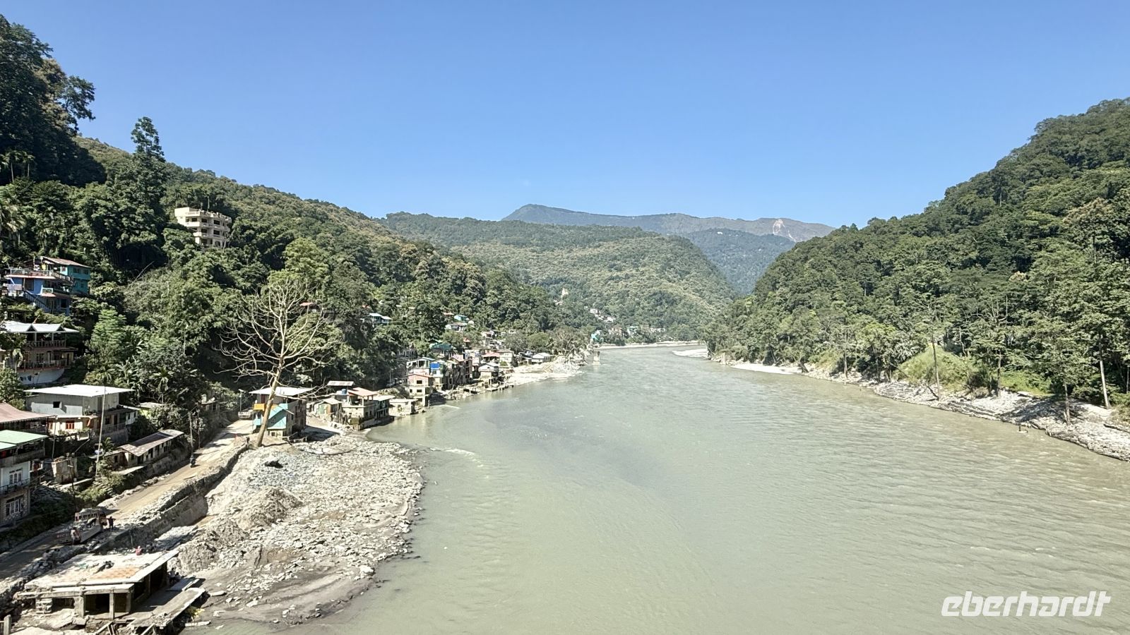 Heute lag eine längere Fahrtstrecke vor uns, doch die abwechslungsreiche Landschaft ließ die Zeit wie im Flug vergehen. Unterwegs begleiteten uns grüne Hügel, Teeplantagen und kleine Dörfer mit bunten Häusern. Ein Teil der Strecke führte entlang des Teesta-Flusses (oft auch „Tista River“ genannt), der in den schneebedeckten Gipfeln des Himalaya entspringt und sich in unzähligen Windungen durch die Täler von Sikkim und Westbengalen schlängelt. Sein türkisblaues Wasser, umgeben von dichtem Dschungel und steilen Felsen, bot ein beeindruckendes Naturpanorama.