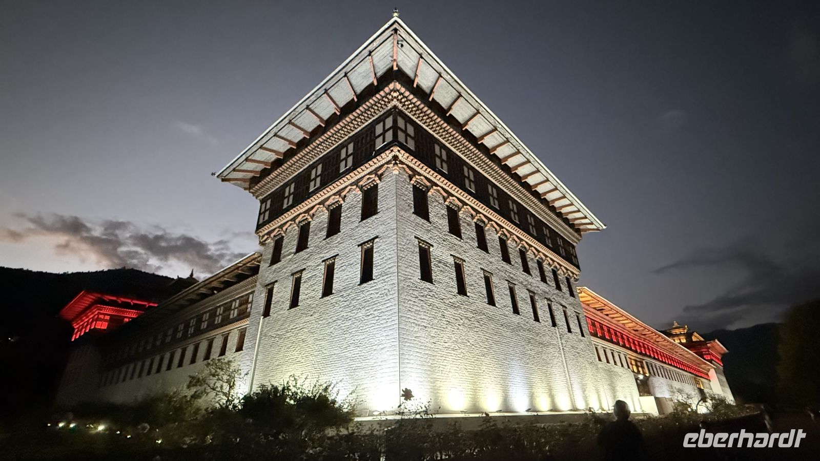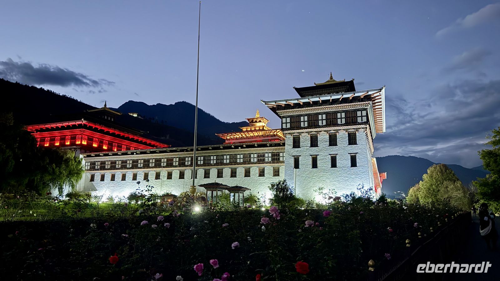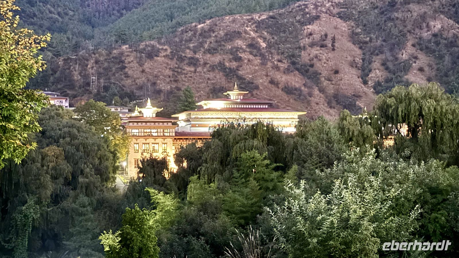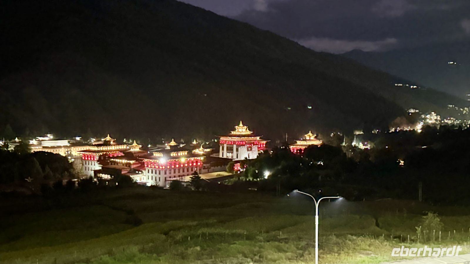 Am Abend erreichten wir schließlich Thimphu, die Hauptstadt Bhutans. Thimphu liegt auf etwa 2.300 Metern Höhe, umgeben von grünen Hügeln, und besticht durch seine Mischung aus Tradition und Moderne: Traditionelle Dzongs (Festungen und Klöster) stehen neben modernen Gebäuden, und bunte Gebetsfahnen wehen an den Straßen.
