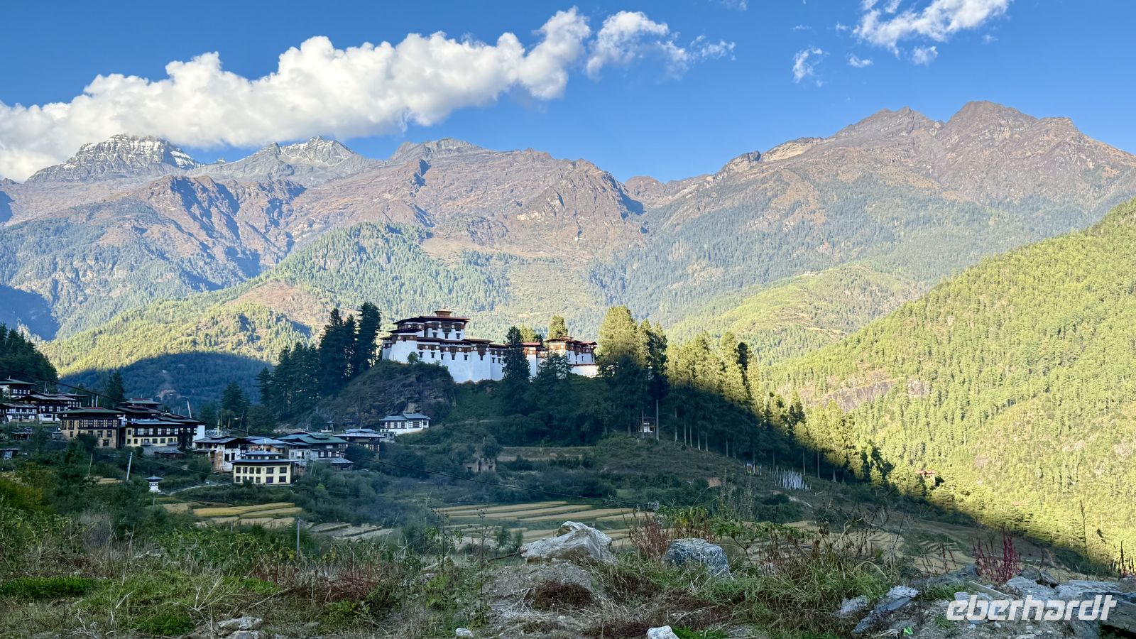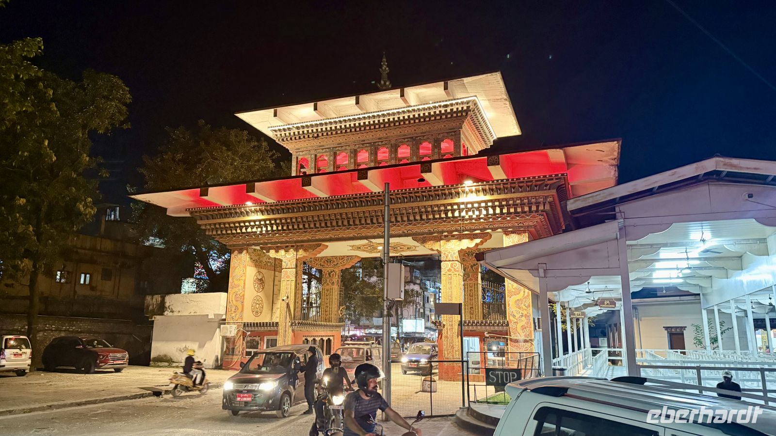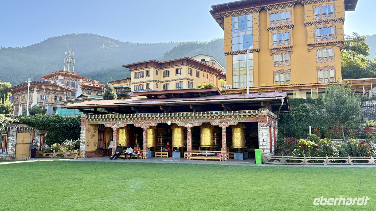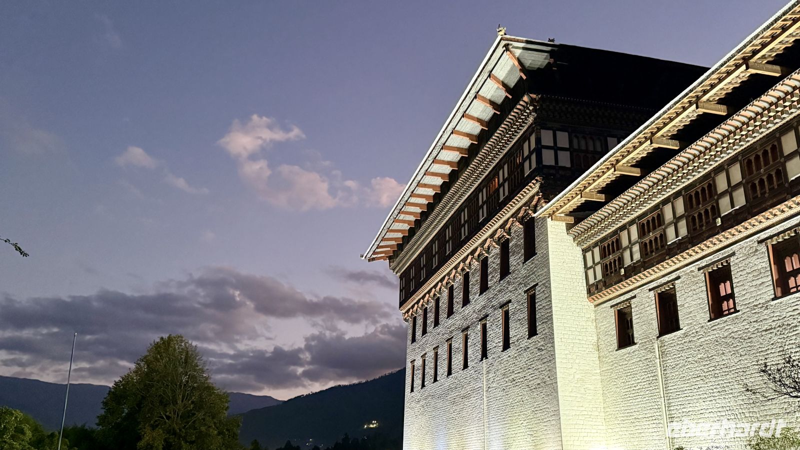 Am Abend erreichten wir schließlich Thimphu, die Hauptstadt Bhutans. Thimphu liegt auf etwa 2.300 Metern Höhe, umgeben von grünen Hügeln, und besticht durch seine Mischung aus Tradition und Moderne: Traditionelle Dzongs (Festungen und Klöster) stehen neben modernen Gebäuden, und bunte Gebetsfahnen wehen an den Straßen.