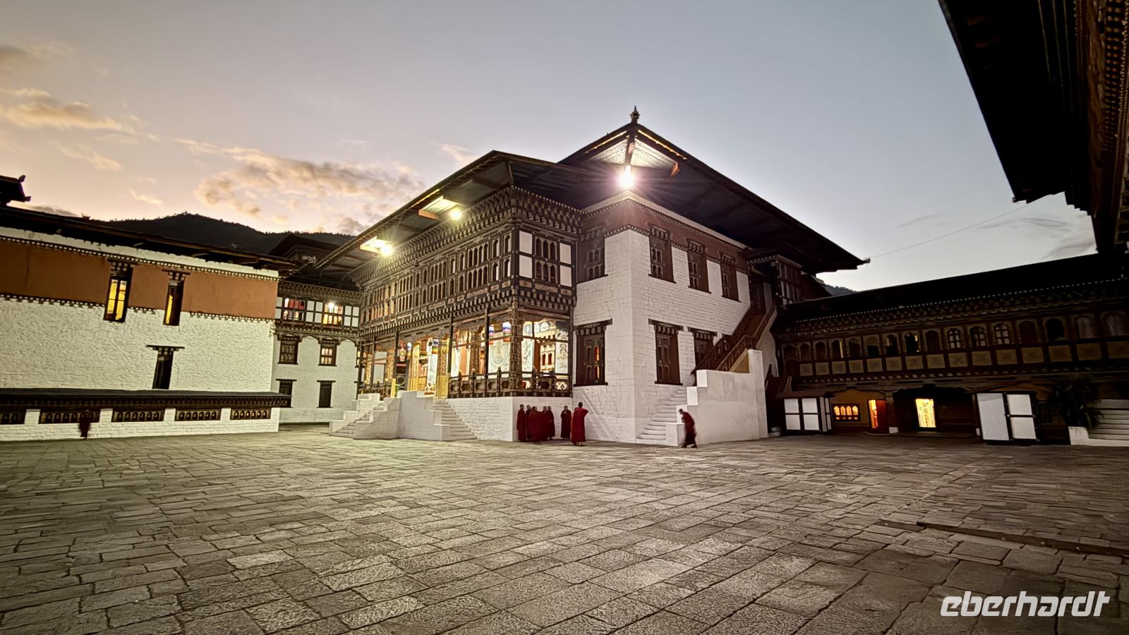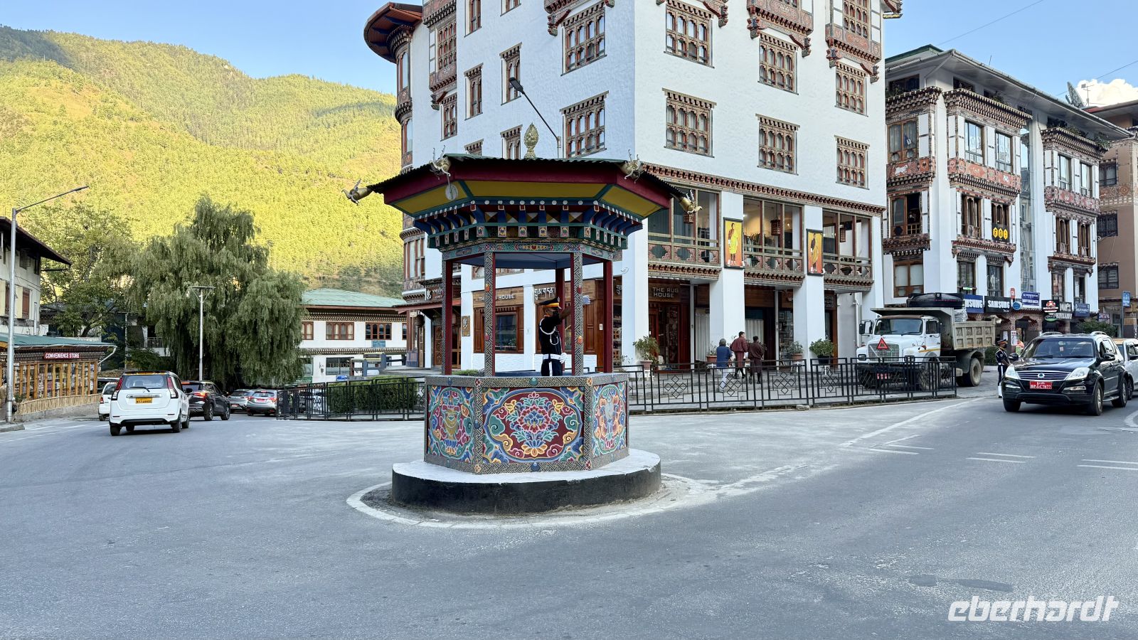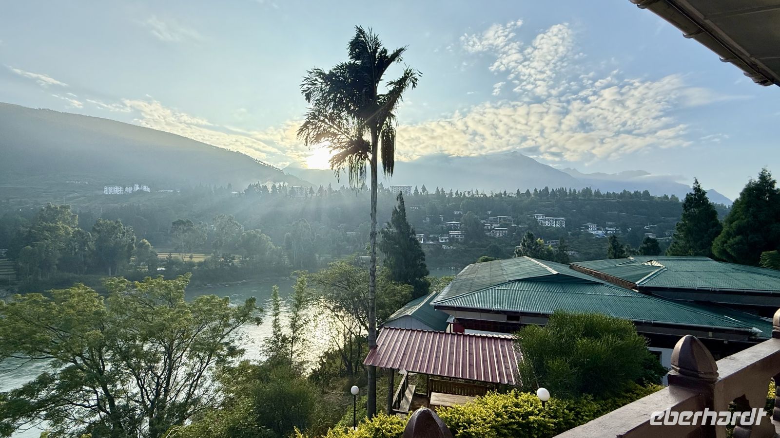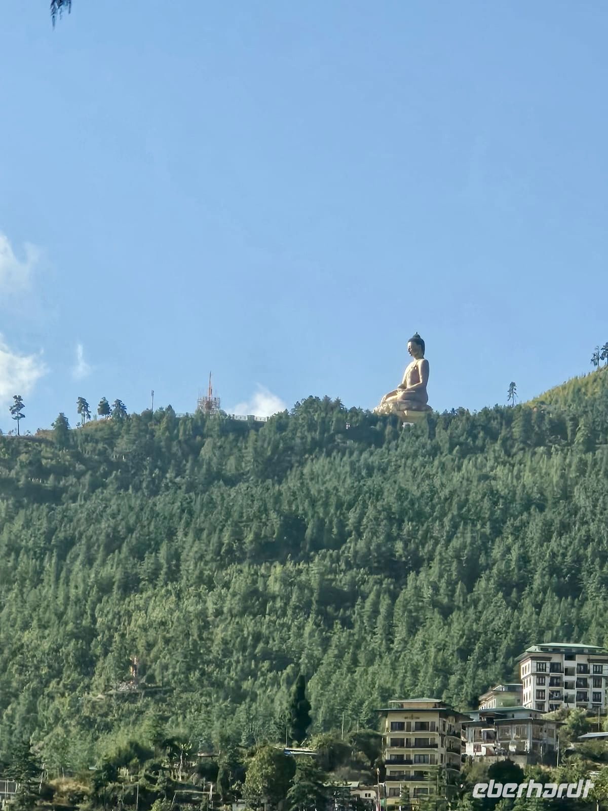 Am Abend erreichten wir schließlich Thimphu, die Hauptstadt Bhutans. Thimphu liegt auf etwa 2.300 Metern Höhe, umgeben von grünen Hügeln, und besticht durch seine Mischung aus Tradition und Moderne: Traditionelle Dzongs (Festungen und Klöster) stehen neben modernen Gebäuden, und bunte Gebetsfahnen wehen an den Straßen.