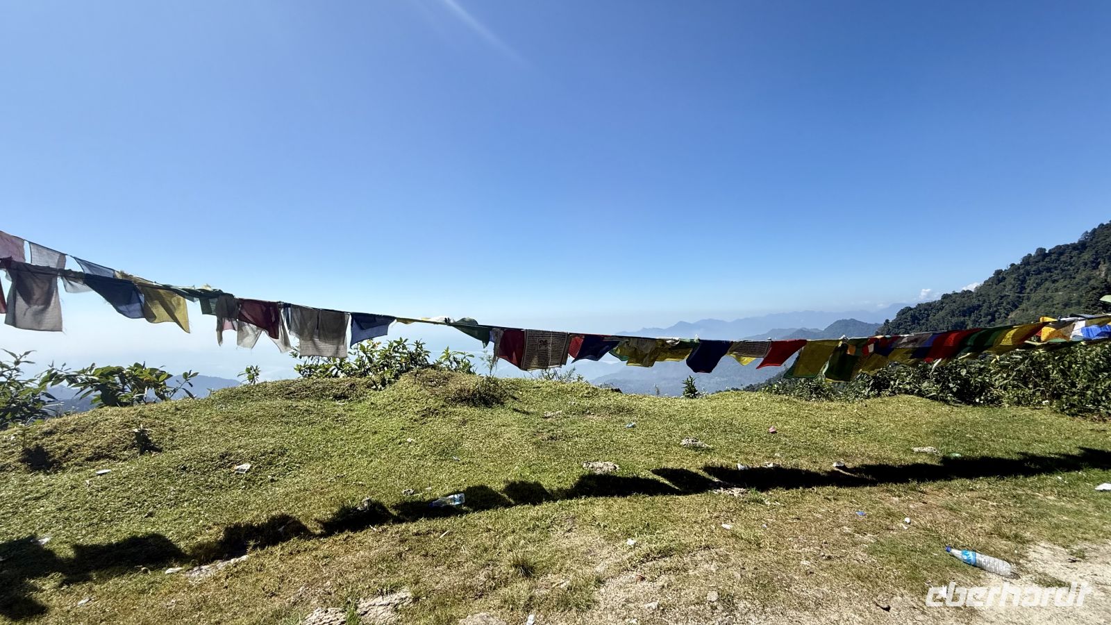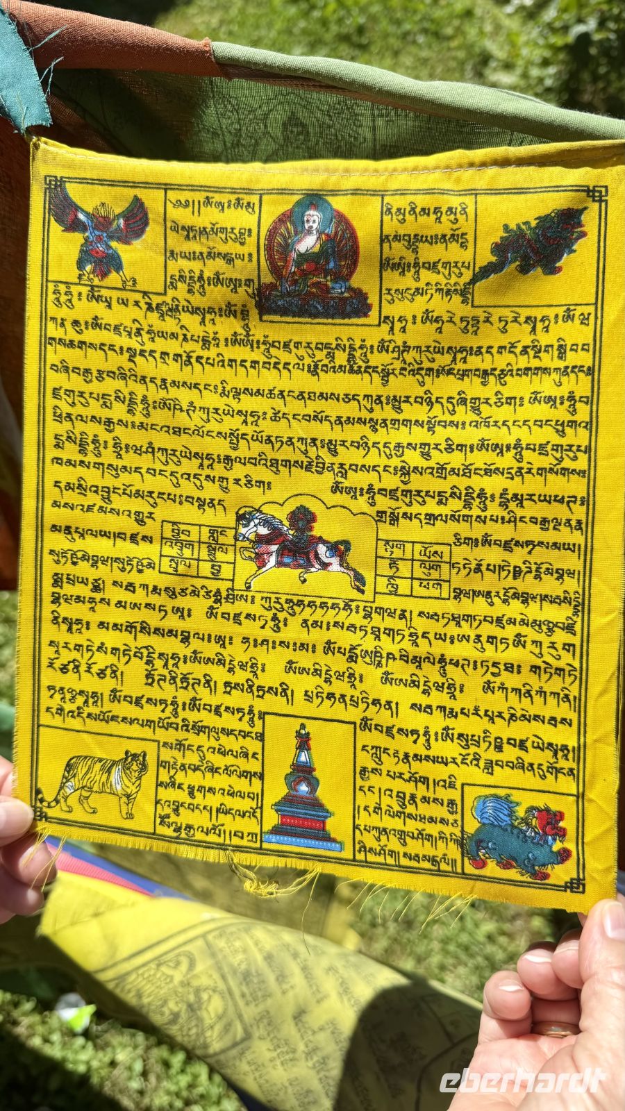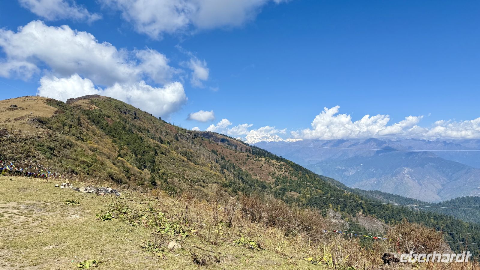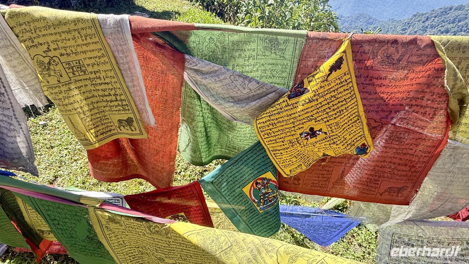 Oben am Pass wehten unzählige bunte Gebetsfahnen im Wind – ein wunderschönes Symbol des buddhistischen Glaubens. Ihre Farben stehen für die fünf Elemente, und der Wind soll die Gebete in alle Himmelsrichtungen tragen. Die fünf Elemente – Erde, Wasser, Feuer, Luft und Raum – bilden in der buddhistischen und hinduistischen Philosophie die Grundlage allen Lebens. Jedes Element hat dabei eine eigene Bedeutung und symbolische Kraft. Erde steht für Stabilität, Stärke und Beständigkeit, sie verkörpert das Fundament des Lebens. Wasser repräsentiert Reinheit, Heilung und die Fähigkeit, sich anzupassen und mit dem Fluss des Lebens zu gehen. Feuer symbolisiert Energie, Leidenschaft und Transformation – es steht für Wandel, Erkenntnis und die innere Kraft, Dinge zu verändern. Luft steht für Bewegung, Freiheit und Kommunikation, sie verbindet Körper und Geist und schenkt Lebendigkeit. Das fünfte Element, der Raum oder Äther, gilt als das alles verbindende Prinzip. Es steht für Bewusstsein, Leere und die unendliche Weite des Geistes. In Bhutan und Tibet spiegeln sich diese fünf Elemente auch in den bunten Gebetsfahnen wider: Blau steht für Raum, Weiß für Luft, Rot für Feuer, Grün für Wasser und Gelb für Erde. Die klare Bergluft und die friedliche Atmosphäre luden zum Innehalten ein. Einige von uns nutzten die Zeit für eine kleine Wanderung durch die alpine Landschaft, um sich schon einmal auf die größere Herausforderung am kommenden Tag – den Aufstieg zum Tigernest-Kloster – einzustimmen.