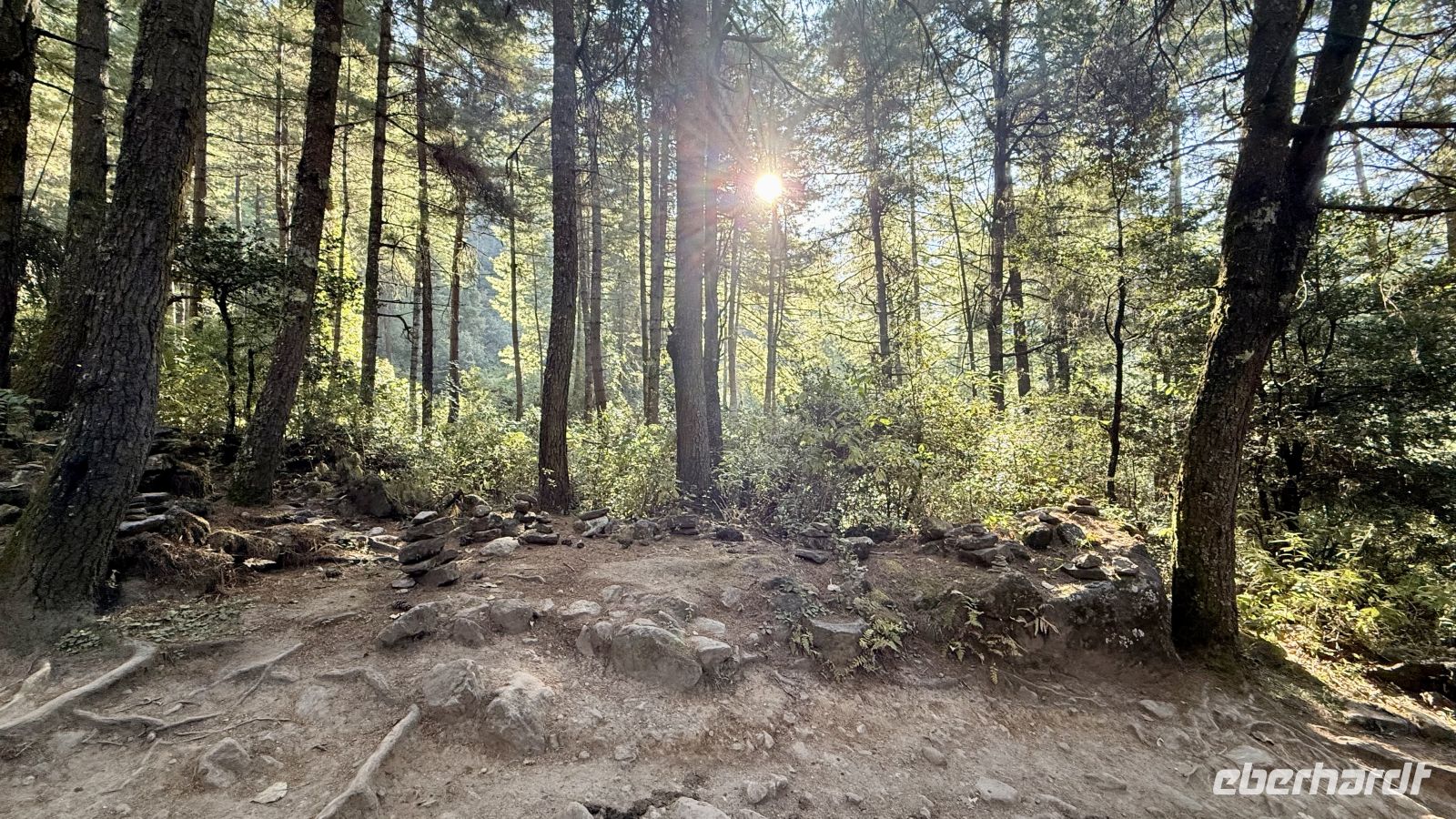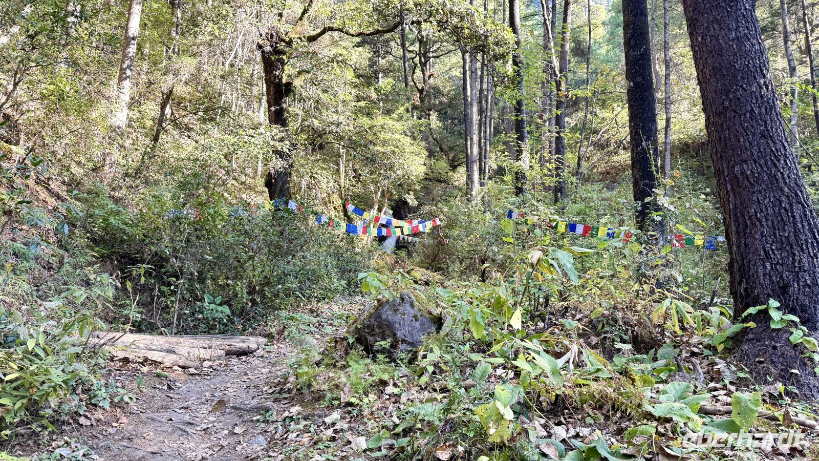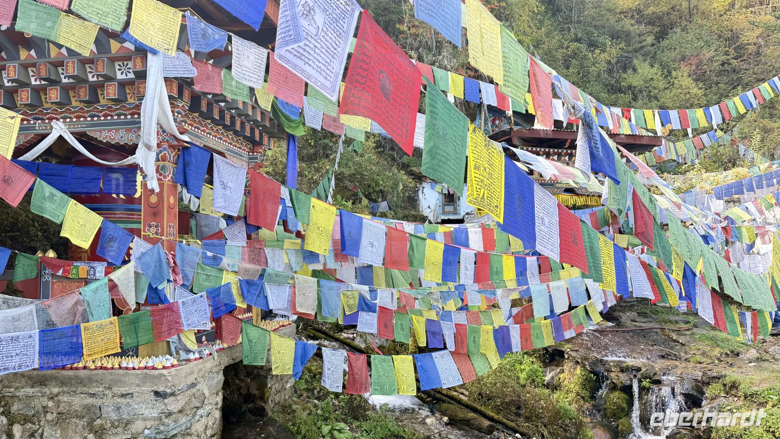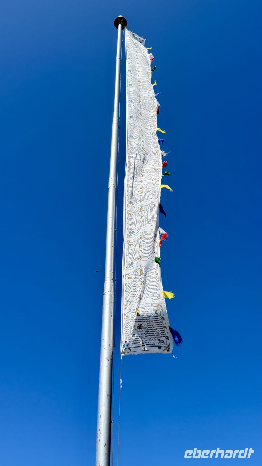 Oben am Pass wehten unzählige bunte Gebetsfahnen im Wind – ein wunderschönes Symbol des buddhistischen Glaubens. Ihre Farben stehen für die fünf Elemente, und der Wind soll die Gebete in alle Himmelsrichtungen tragen. Die fünf Elemente – Erde, Wasser, Feuer, Luft und Raum – bilden in der buddhistischen und hinduistischen Philosophie die Grundlage allen Lebens. Jedes Element hat dabei eine eigene Bedeutung und symbolische Kraft. Erde steht für Stabilität, Stärke und Beständigkeit, sie verkörpert das Fundament des Lebens. Wasser repräsentiert Reinheit, Heilung und die Fähigkeit, sich anzupassen und mit dem Fluss des Lebens zu gehen. Feuer symbolisiert Energie, Leidenschaft und Transformation – es steht für Wandel, Erkenntnis und die innere Kraft, Dinge zu verändern. Luft steht für Bewegung, Freiheit und Kommunikation, sie verbindet Körper und Geist und schenkt Lebendigkeit. Das fünfte Element, der Raum oder Äther, gilt als das alles verbindende Prinzip. Es steht für Bewusstsein, Leere und die unendliche Weite des Geistes. In Bhutan und Tibet spiegeln sich diese fünf Elemente auch in den bunten Gebetsfahnen wider: Blau steht für Raum, Weiß für Luft, Rot für Feuer, Grün für Wasser und Gelb für Erde. Die klare Bergluft und die friedliche Atmosphäre luden zum Innehalten ein. Einige von uns nutzten die Zeit für eine kleine Wanderung durch die alpine Landschaft, um sich schon einmal auf die größere Herausforderung am kommenden Tag – den Aufstieg zum Tigernest-Kloster – einzustimmen.