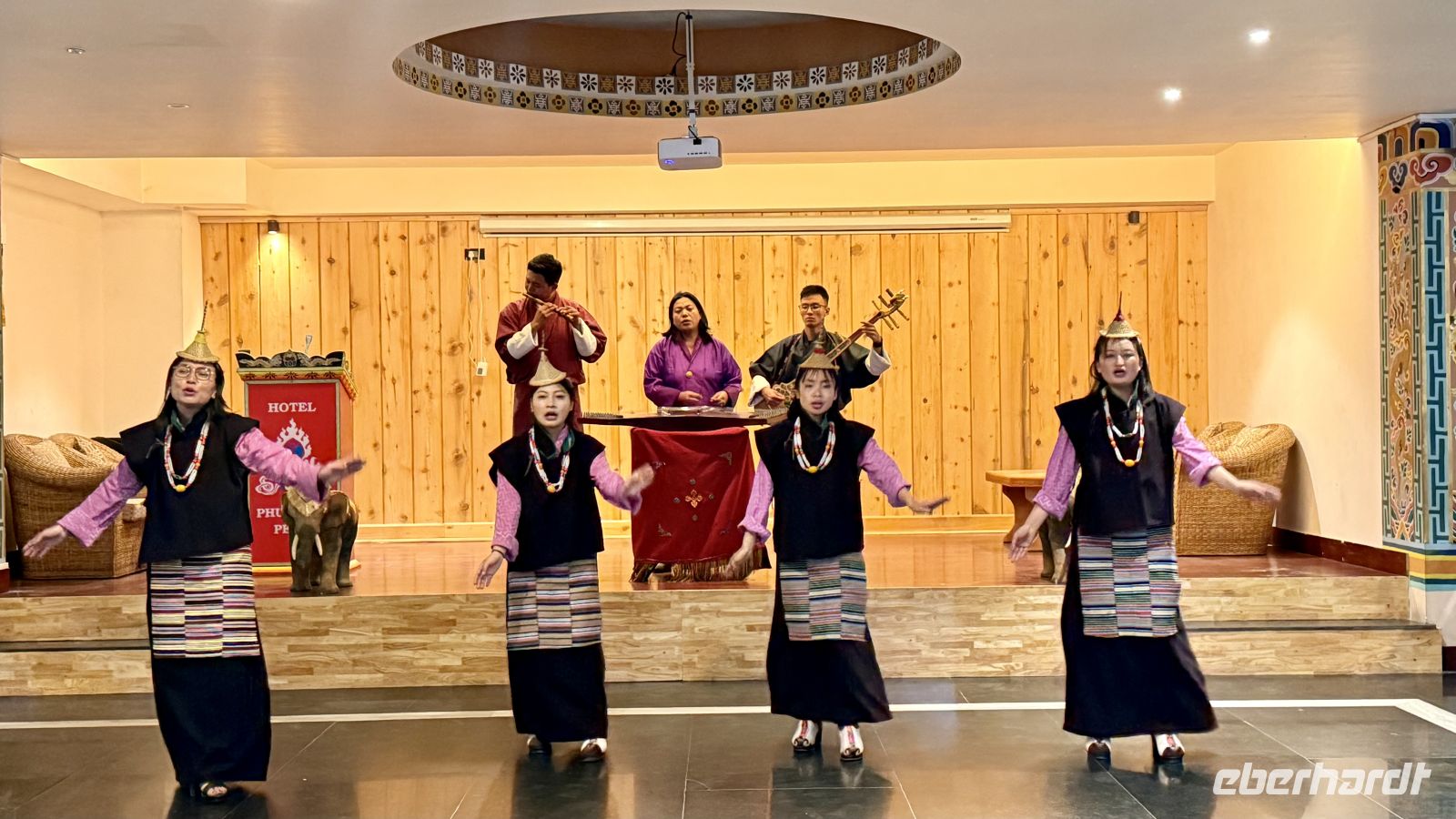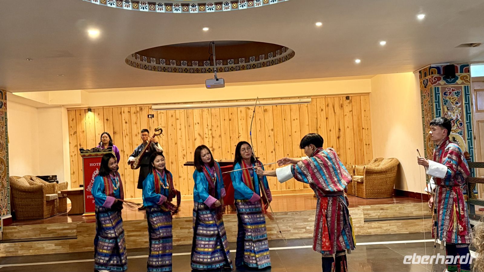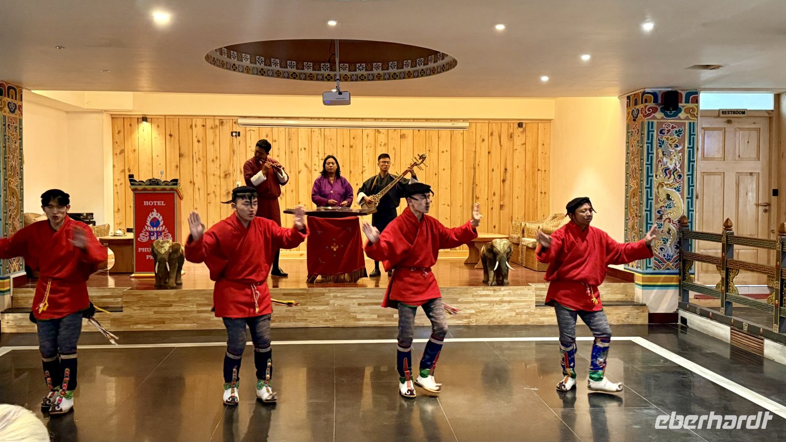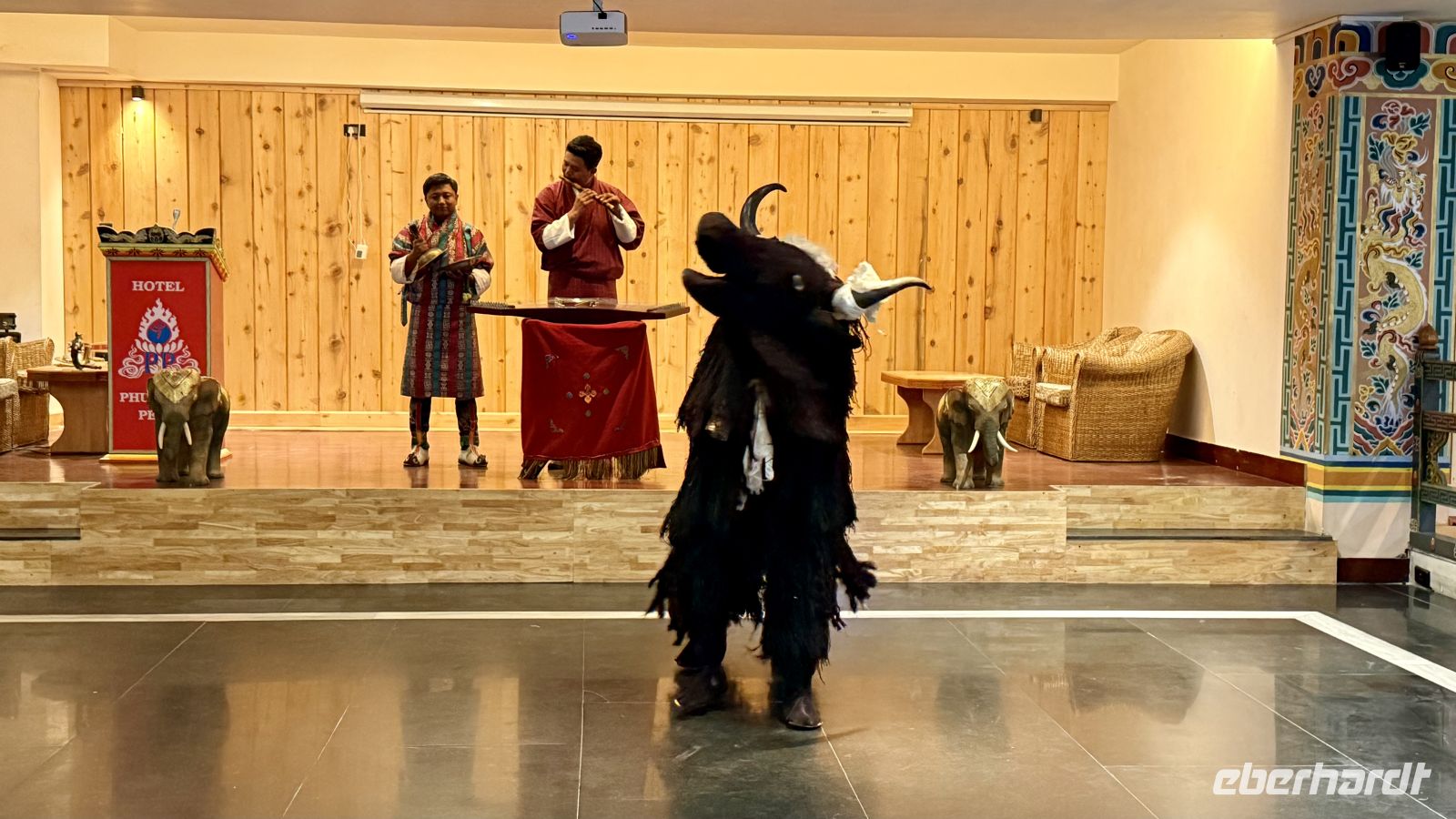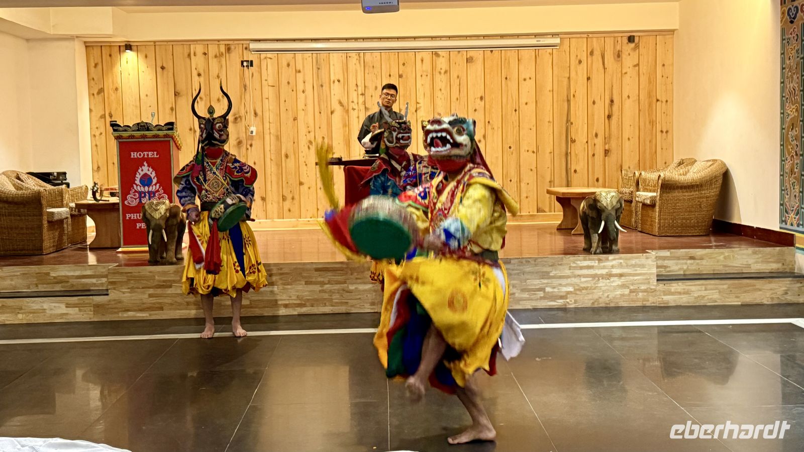 Ein besonderes Highlight erwartete uns direkt im Hotel: ein traditioneller Maskentanz, der in kunstvollen Kostümen und farbenfrohen Masken aufgeführt wurde. Diese Tänze, auch Cham-Tänze genannt, sind spirituelle Zeremonien, die den Sieg des Guten über das Böse darstellen und häufig während religiöser Feste aufgeführt werden. Die Kombination aus Musik, rhythmischen Bewegungen und beeindruckenden Masken machte diesen Auftritt zu einem unvergesslichen Erlebnis und ließ uns die tief verwurzelte buddhistische Kultur Bhutans hautnah erleben.