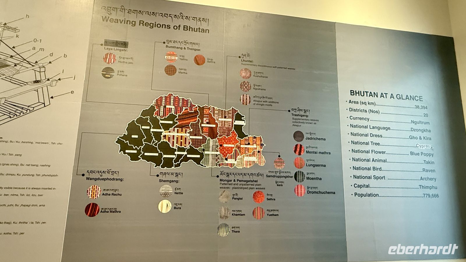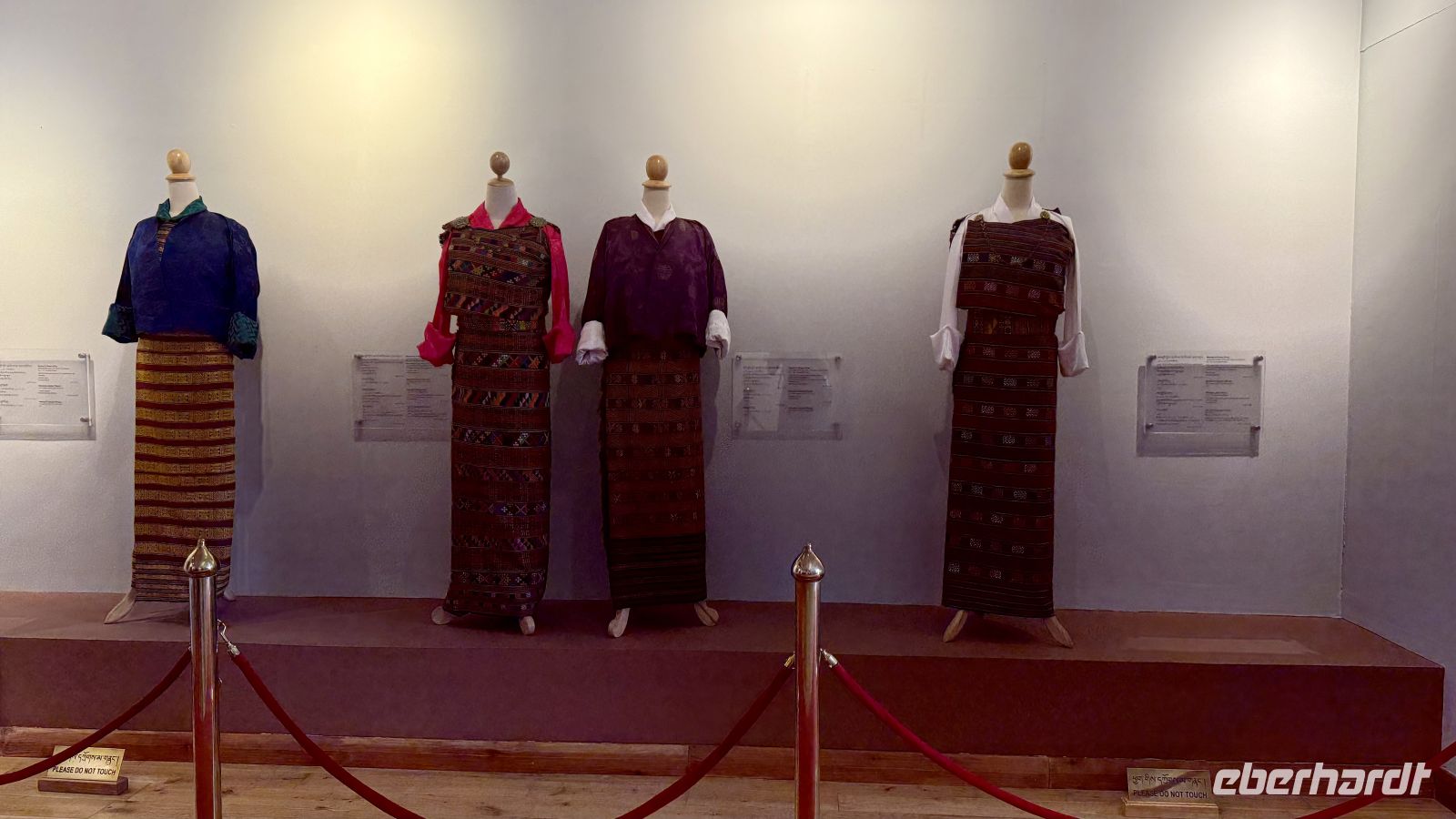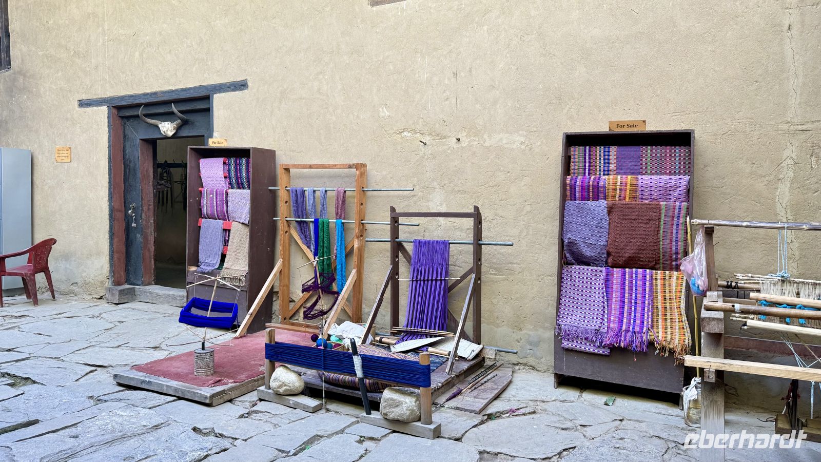 Unser nächstes Ziel war das Textilmuseum, in dem die Besucher alles über die bhutanische Textilkunst erfahren können. Bhutanische Stoffe sind weltberühmt für ihre leuchtenden Farben, feinen Muster und aufwendigen Webtechniken. Besonders beeindruckend war die Ausstellung von traditionellen Kleidungsstücken, Webstühlen und handgefertigten Seidenstoffen, die die Kunstfertigkeit und Kreativität der Handwerker eindrucksvoll demonstrieren.