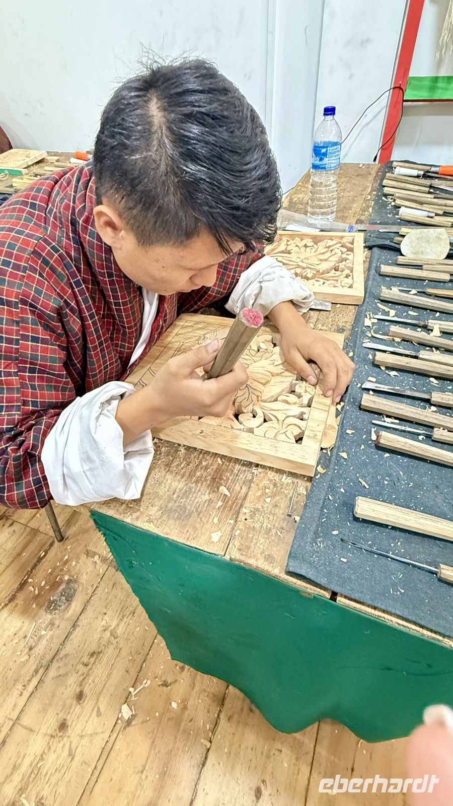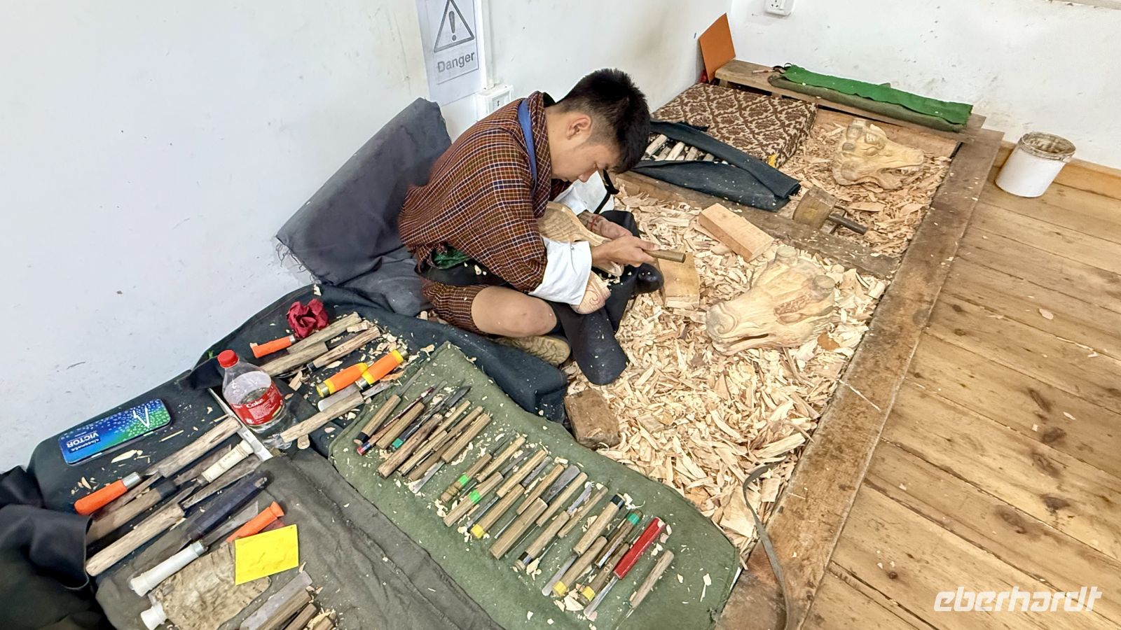 Anschließend besuchten wir die Kunstakademie von Thimphu, die sich der Erhaltung und Förderung traditioneller bhutanischer Kunstformen widmet. Hier konnten wir Mönche und Künstler beobachten, die kunstvolle Thangka-Malereien anfertigen, Holzschnitzereien gestalten oder traditionelle Skulpturen herstellen. Die Akademie bietet Workshops und Einblicke in die über Jahrhunderte bewahrten Techniken und ist ein wichtiger Ort für die Weitergabe des kulturellen Erbes Bhutans.