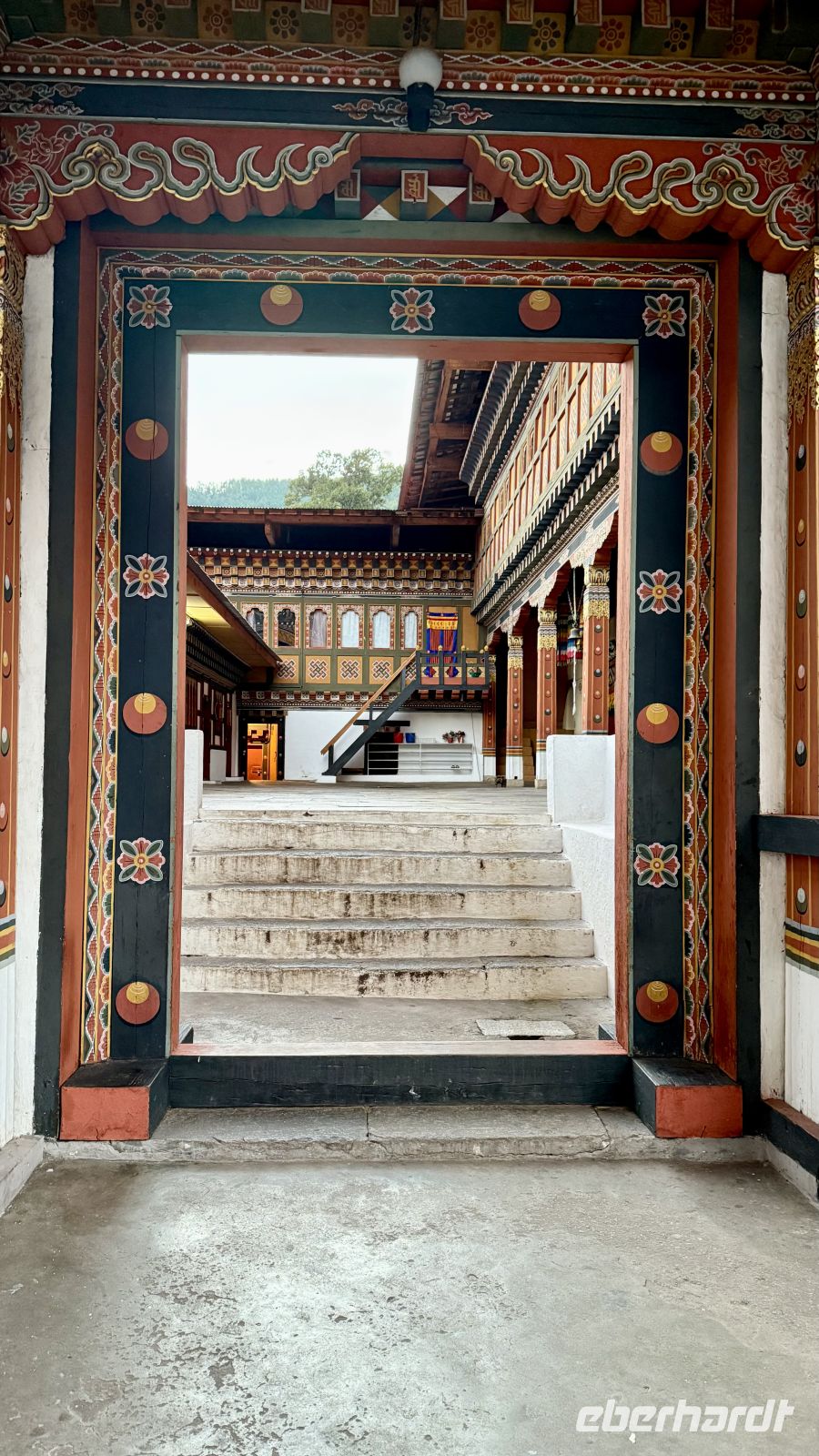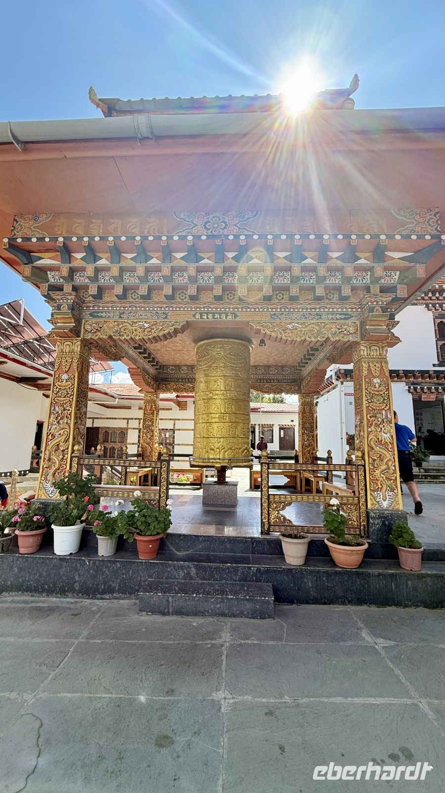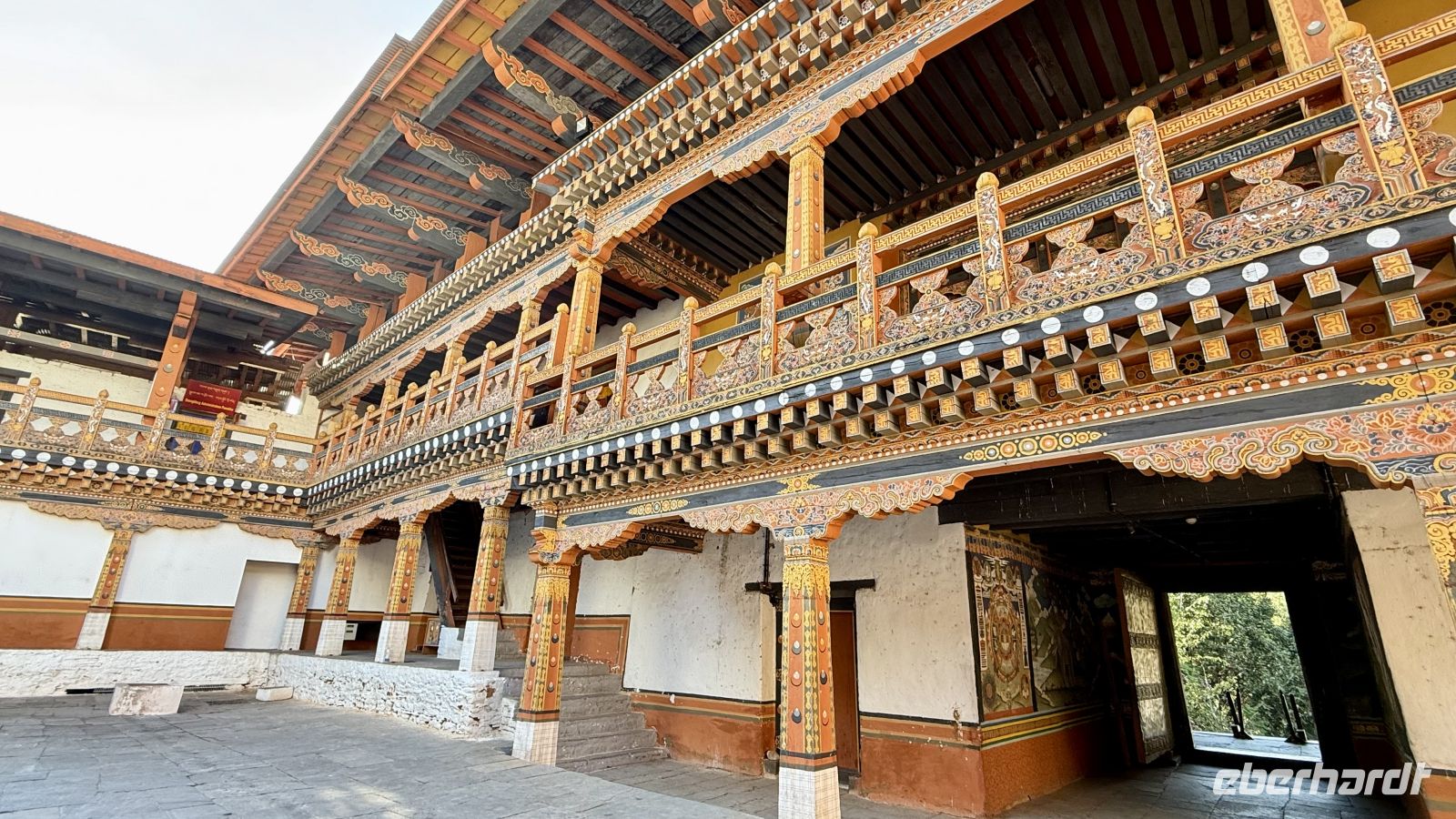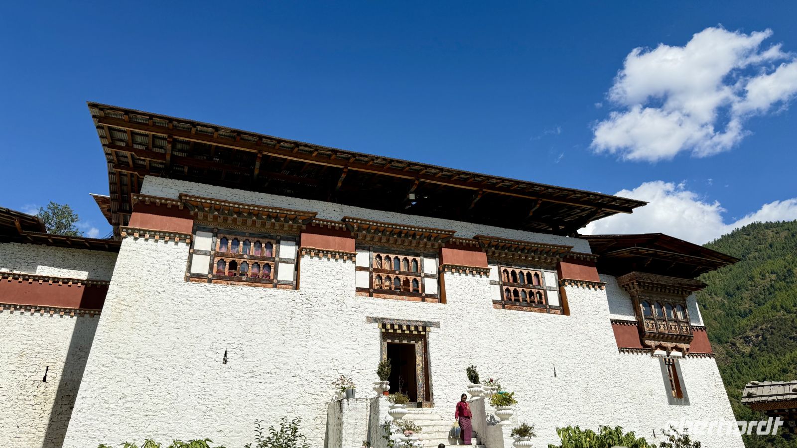 Gut gestärkt machten wir uns danach auf, den Punakha Dzong aus nächster Nähe zu besichtigen. Der Dzong ist eines der ältesten und schönsten Beispiele bhutanischer Klosterarchitektur und dient sowohl als religiöses als auch administratives Zentrum der Region. Er beeindruckt durch seine Größe, seine kunstvollen Innenhöfe, die detailreichen Wandmalereien und die friedliche Atmosphäre, die sowohl Gläubige als auch Besucher spüren können.