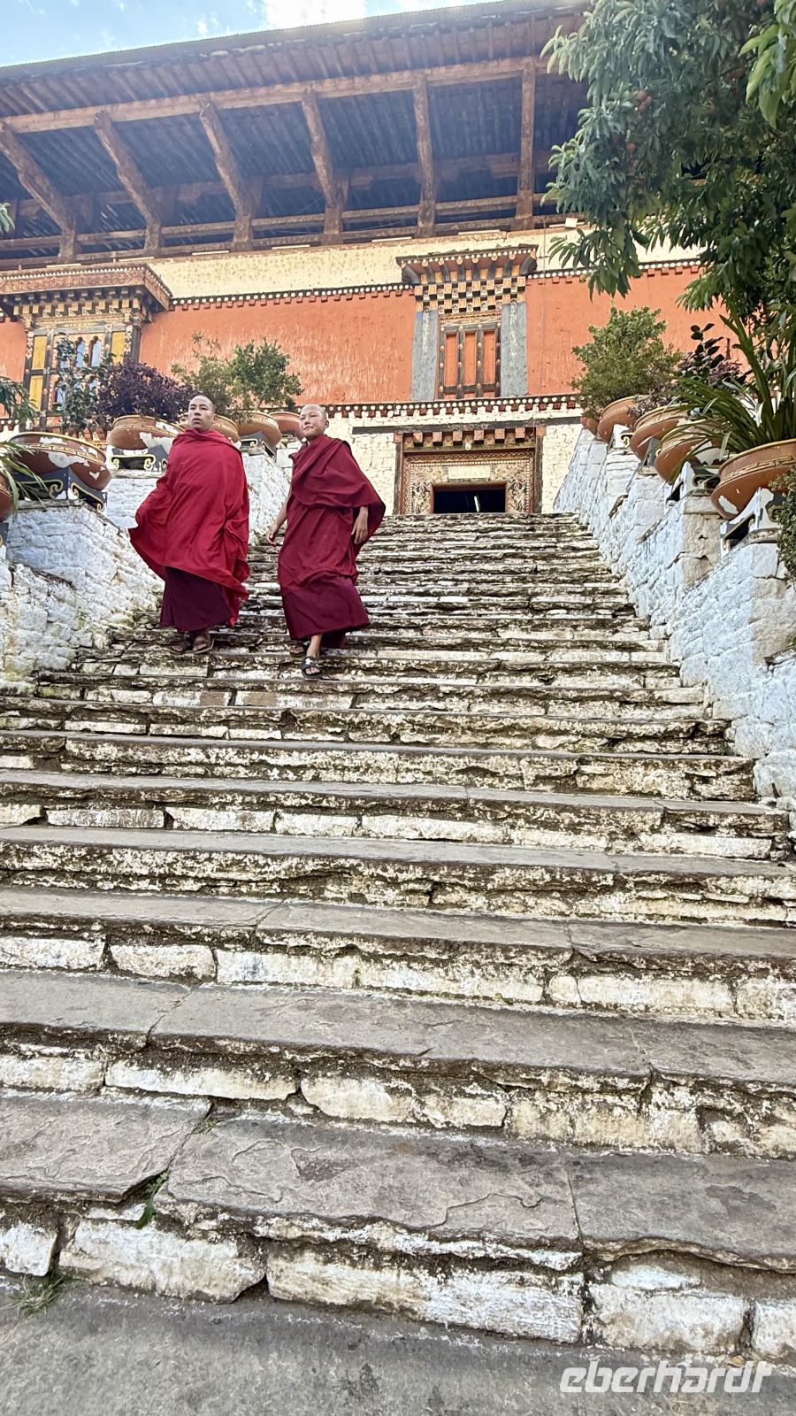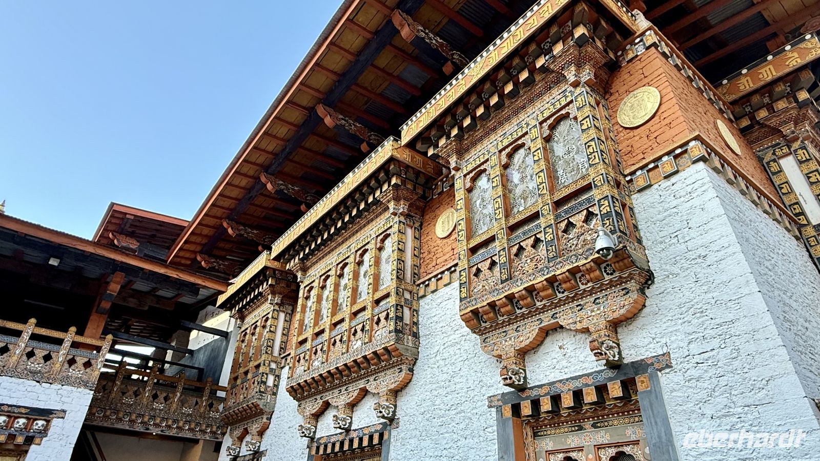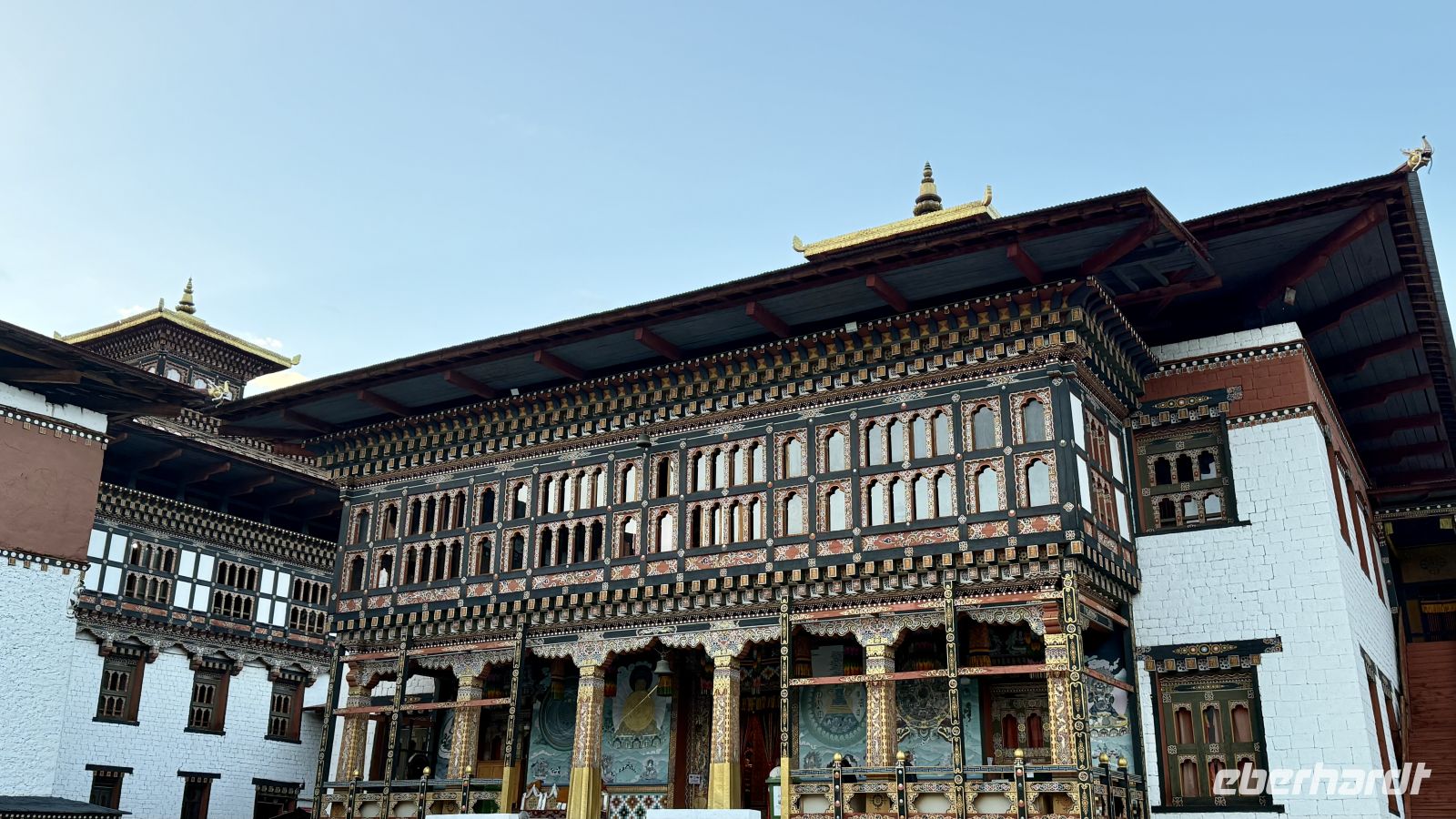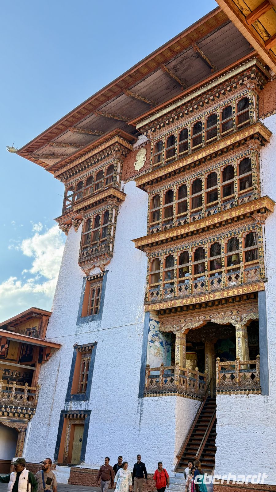 Gut gestärkt machten wir uns danach auf, den Punakha Dzong aus nächster Nähe zu besichtigen. Der Dzong ist eines der ältesten und schönsten Beispiele bhutanischer Klosterarchitektur und dient sowohl als religiöses als auch administratives Zentrum der Region. Er beeindruckt durch seine Größe, seine kunstvollen Innenhöfe, die detailreichen Wandmalereien und die friedliche Atmosphäre, die sowohl Gläubige als auch Besucher spüren können.