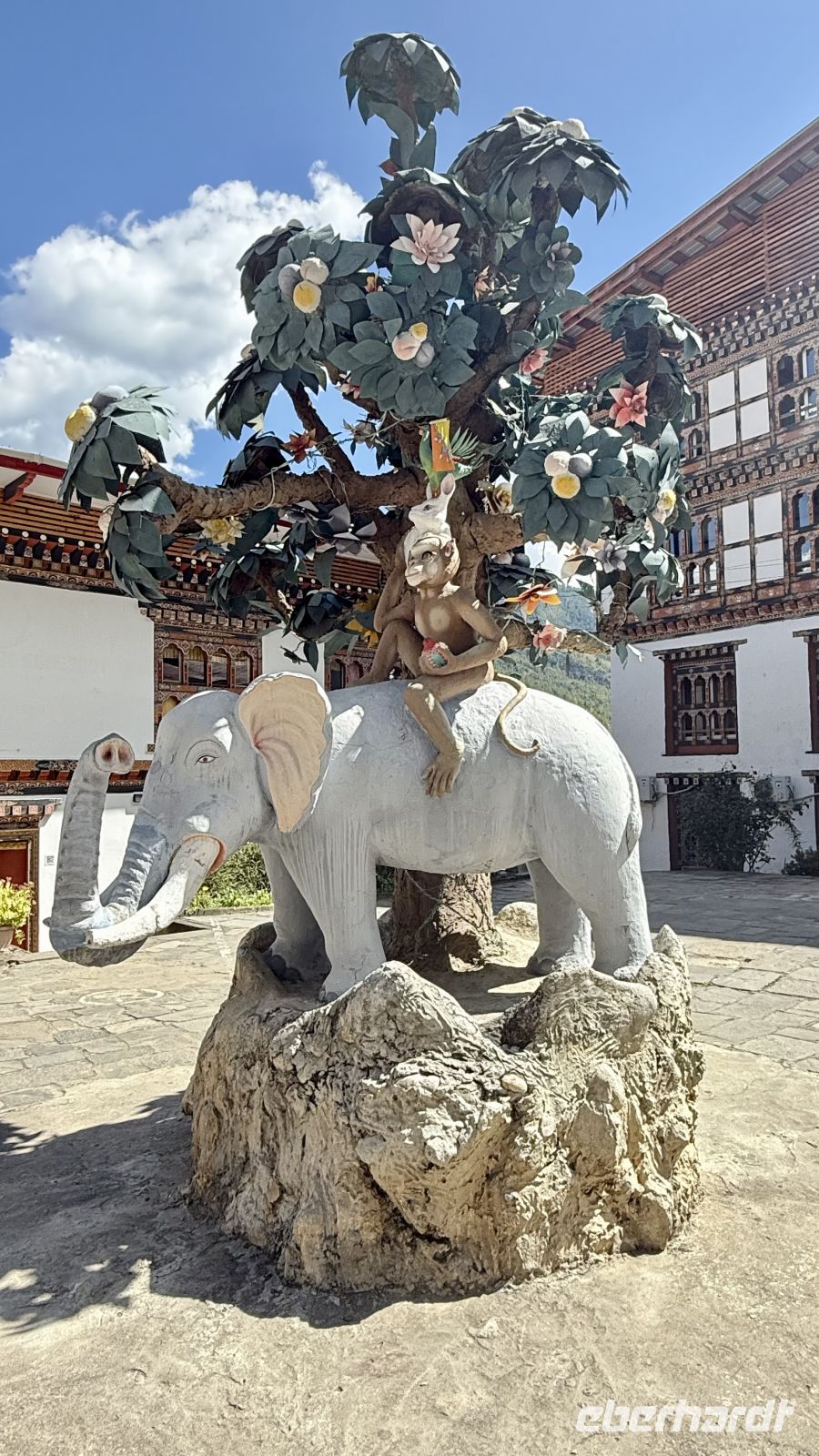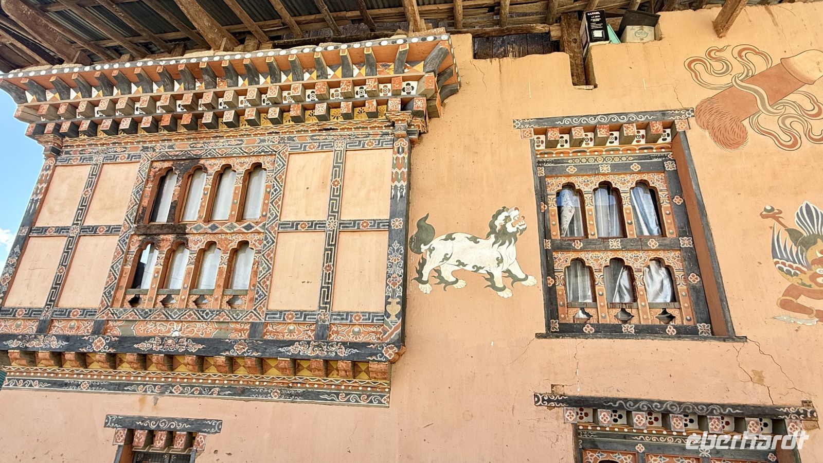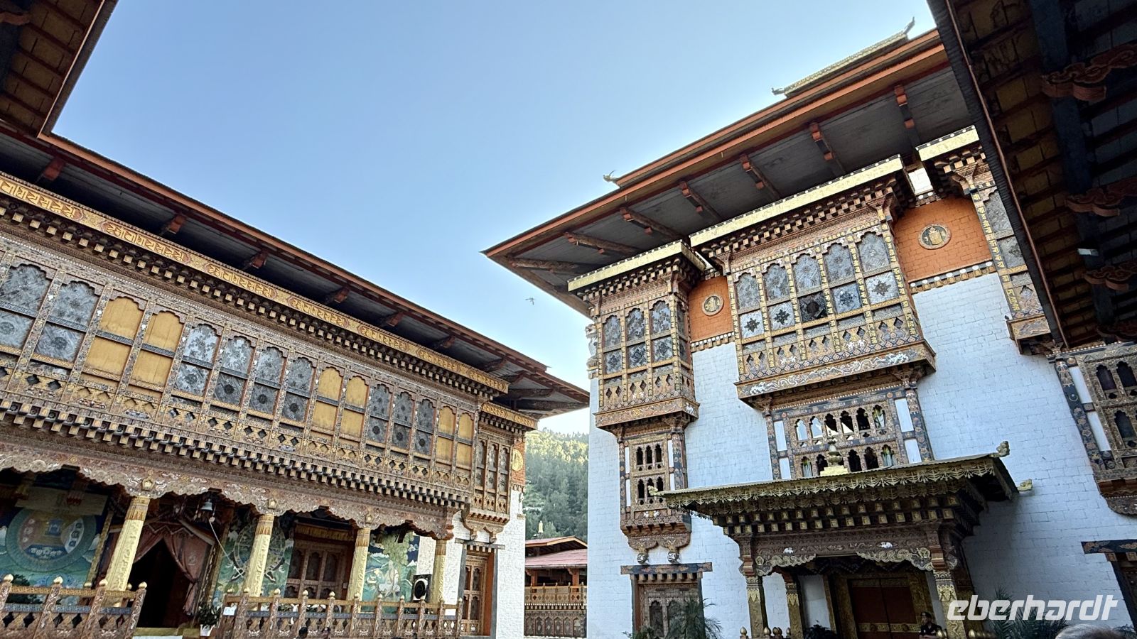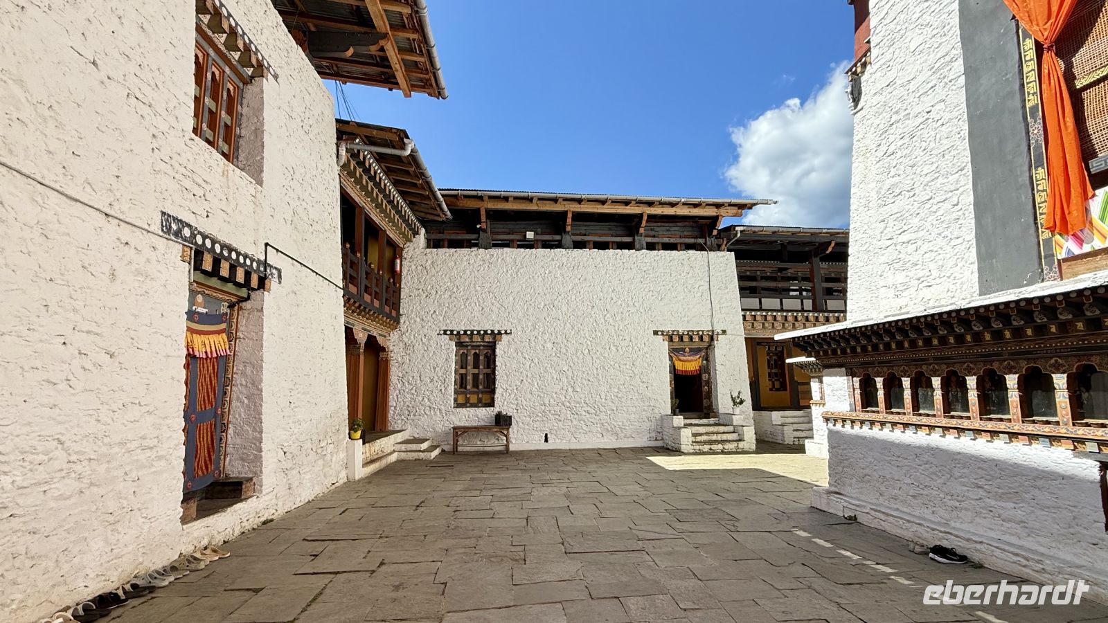 Gut gestärkt machten wir uns danach auf, den Punakha Dzong aus nächster Nähe zu besichtigen. Der Dzong ist eines der ältesten und schönsten Beispiele bhutanischer Klosterarchitektur und dient sowohl als religiöses als auch administratives Zentrum der Region. Er beeindruckt durch seine Größe, seine kunstvollen Innenhöfe, die detailreichen Wandmalereien und die friedliche Atmosphäre, die sowohl Gläubige als auch Besucher spüren können.