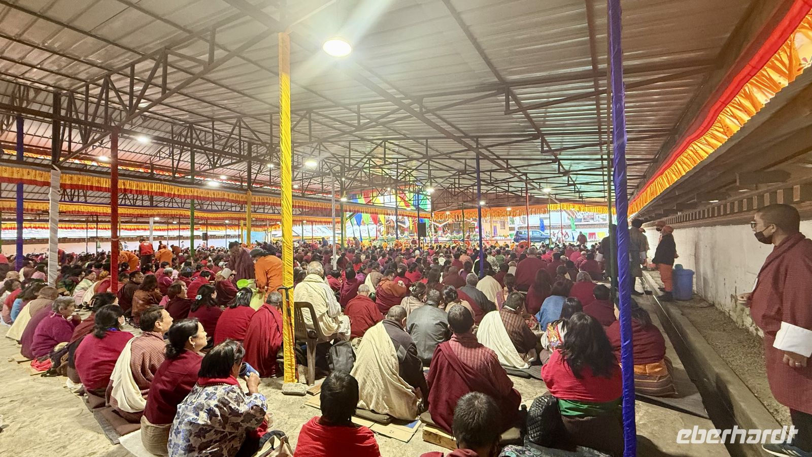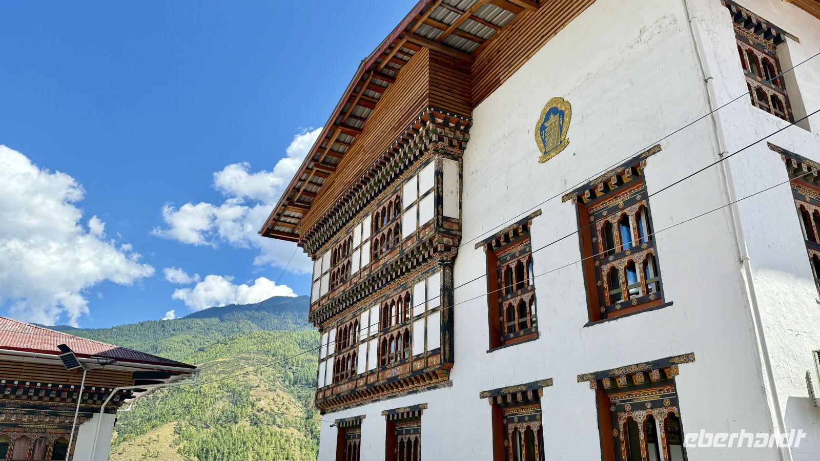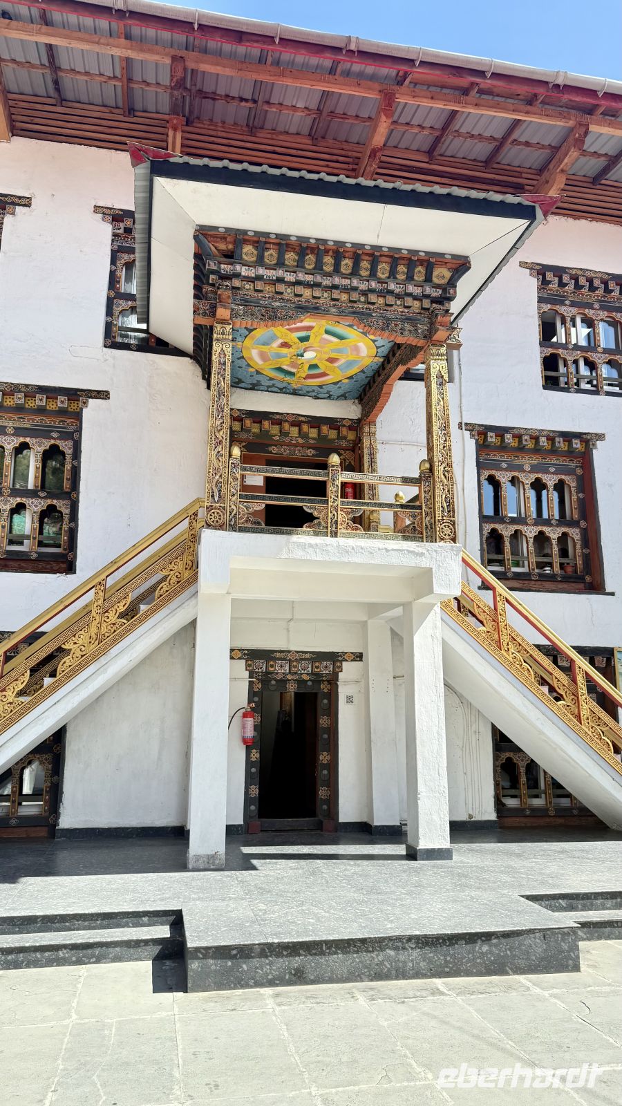 Weiter ging die Fahrt zum Simtokha Dzong, einem der ältesten Dzongs (Klosterfestungen) Bhutans. Er wurde im Jahr 1629 von Shabdrung Ngawang Namgyal, dem Begründer des vereinten Bhutan, erbaut. Der Simtokha Dzong gilt als spirituell besonders bedeutend, da er der Schutzgöttin Bhutans geweiht ist. Heute beherbergt er eine Mönchsschule (Dzongkha-Institut), in der die jungen Novizen die Grundlagen der buddhistischen Philosophie, Meditation und die bhutanische Sprache studieren. Als wir den Dzong besuchten, fanden gerade zahlreiche religiöse Zeremonien und Rituale statt. Diese Zeremonien können den ganzen Tag dauern und bestehen aus Gebeten, Gesängen, Trommeln und dem Verbrennen von Weihrauch, um negative Energien zu vertreiben und Glück und Segen für die Gemeinde zu erbitten. Die Mönche trugen ihre traditionellen roten Roben und saßen in meditativer Stille, während die tiefen Klänge der Hörner durch die Hallen hallten – eine faszinierende und spirituelle Atmosphäre.