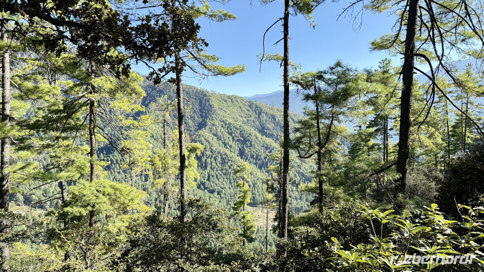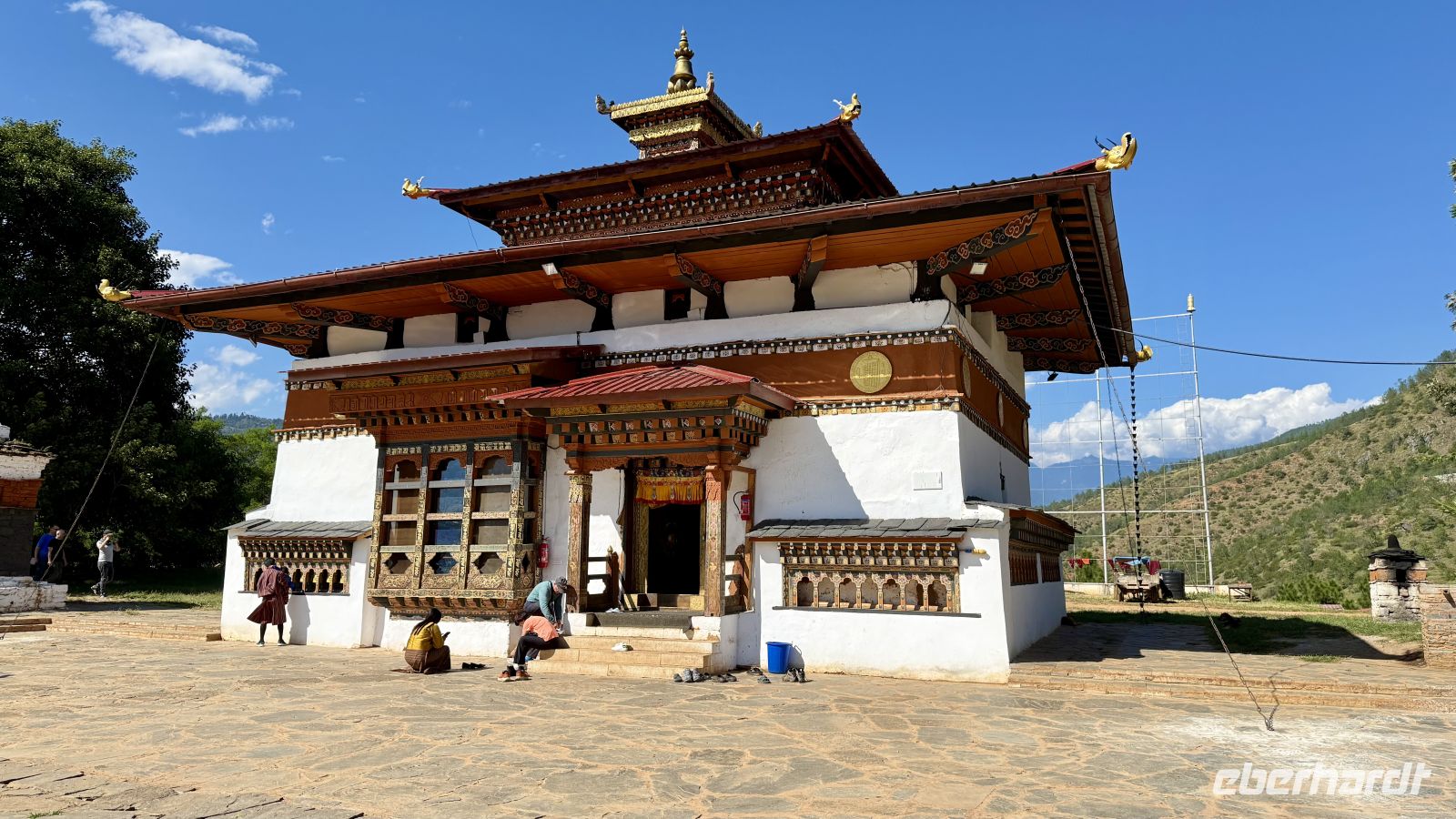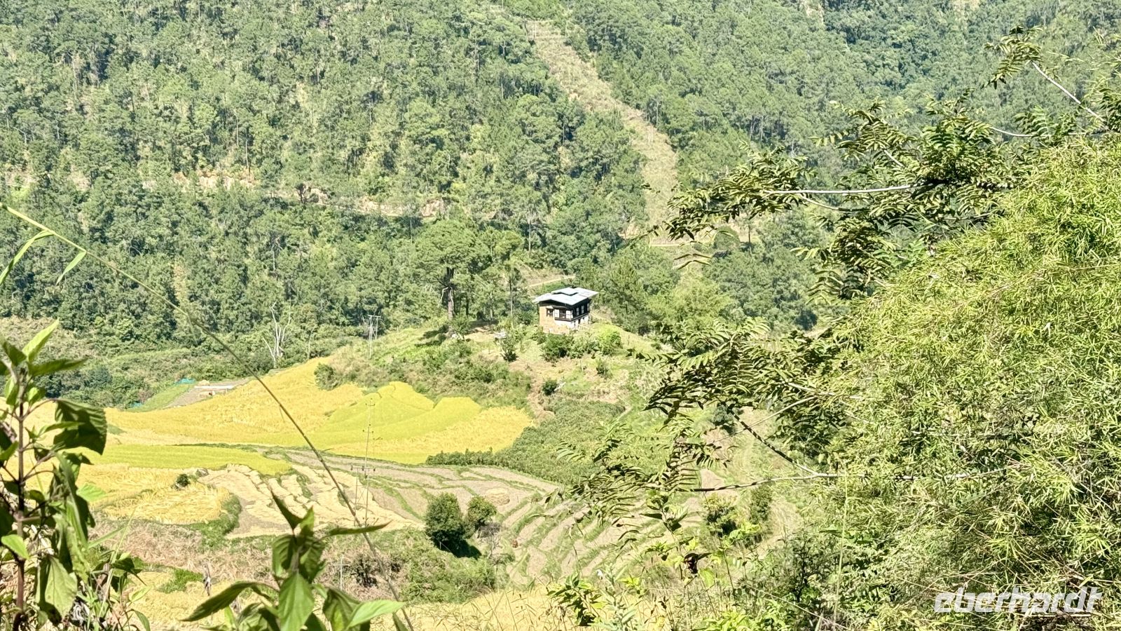 Heute lag noch einmal eine lange Fahrt vor uns, doch unterwegs machten wir immer wieder kurze Stopps, um die Landschaft zu genießen und neue Eindrücke zu sammeln. Unser erster Halt führte uns zum Kharbandi Gompa Kloster, einem historischen buddhistischen Kloster in Bhutan. Das Kloster ist bekannt für seine traditionelle Architektur, die kunstvoll bemalten Wände und die friedliche Atmosphäre. Hier leben Mönche, die täglich ihre Gebete verrichten und die Besucher freundlich empfangen. Wir nutzten die Gelegenheit, um einen kleinen Spaziergang zu machen und die atemberaubende Aussicht über die umliegenden Hügel und Täler zu genießen.