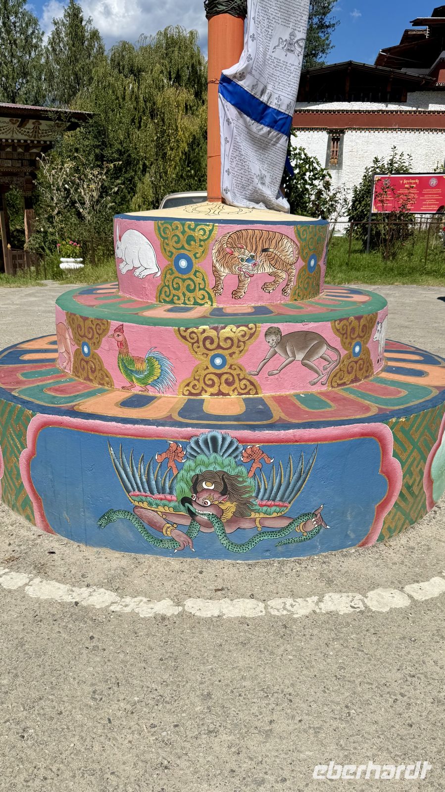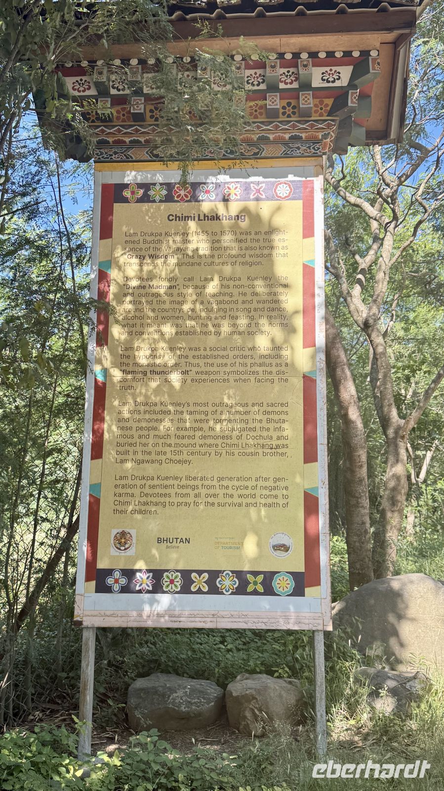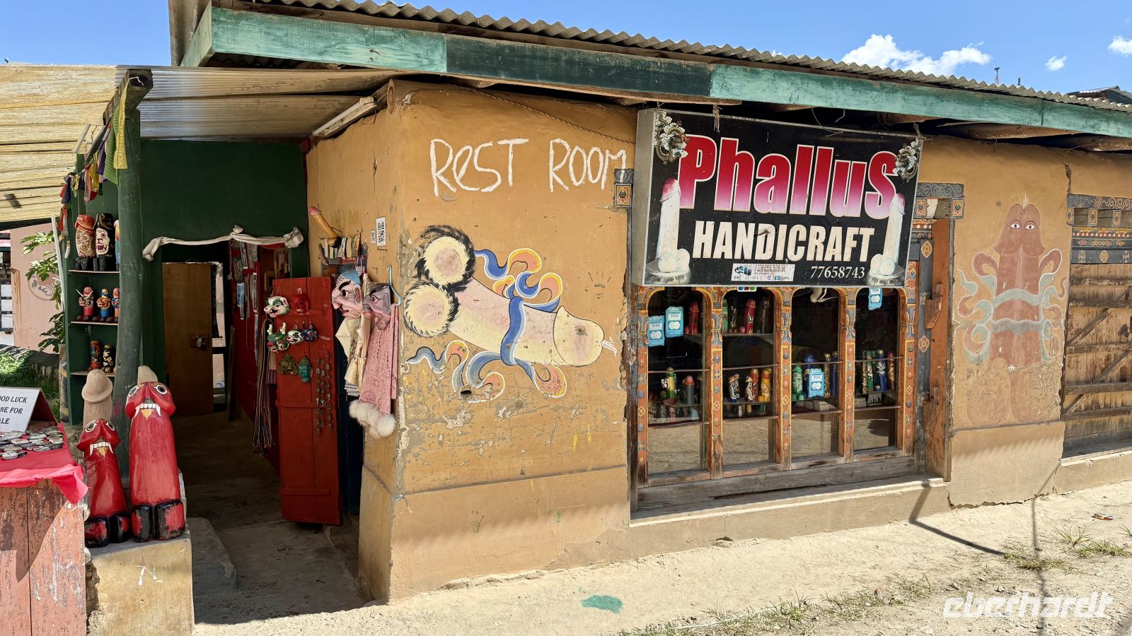 Am Mittag erreichten wir das Fruchtbarkeitskloster, auch bekannt als Chimi Lhakhang, das auf einem Hügel über dem Punakha-Tal liegt. Dieses Kloster wurde im 15. Jahrhundert vom berühmten buddhistischen Heiligen Drukpa Kunley, dem sogenannten „verrückten Buddha“, gegründet. Drukpa Kunley war ein buddhistischer Mönch und Mystiker, der für seine unkonventionellen Lehrmethoden berühmt war. Er kombinierte Humor, Theater und manchmal auch schockierende Taten, um spirituelle Botschaften zu vermitteln und die Menschen von Aberglaube und Angst zu befreien. Der „verrückte Buddha“ setzte auf Humor, Sexualität und Provokation, um die Menschen zu erleuchten. So verwendete er seine legendäre „Flöte der Erleuchtung“, eine Phallus-Flöte, um seine Lehren zu verbreiten. Aus diesem Grund findet man rund um das Kloster bunte Phallus-Symbole, die auf die Lehren Drukpa Kunleys hinweisen und gleichzeitig Schutz vor bösen Geistern bieten sollen. Diese Symbole sind in Bhutan allgegenwärtig und ein Zeichen von Fruchtbarkeit, Glück und Schutz. Es gilt als Ort der Fruchtbarkeit und ist besonders bei Paaren beliebt, die sich Kinder wünschen. Besucher können kleine Gebete sprechen und am Eingang des Klosters kleine Fruchtbarkeitsamulett-Symbole sehen. Wir hatten die Gelegenheit, das Kloster zu besichtigen, die kunstvoll bemalten Wände zu betrachten und die friedliche Atmosphäre auf uns wirken zu lassen.