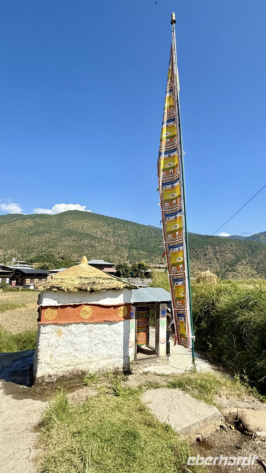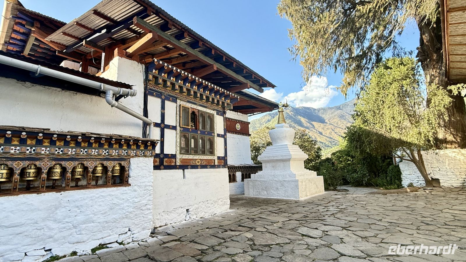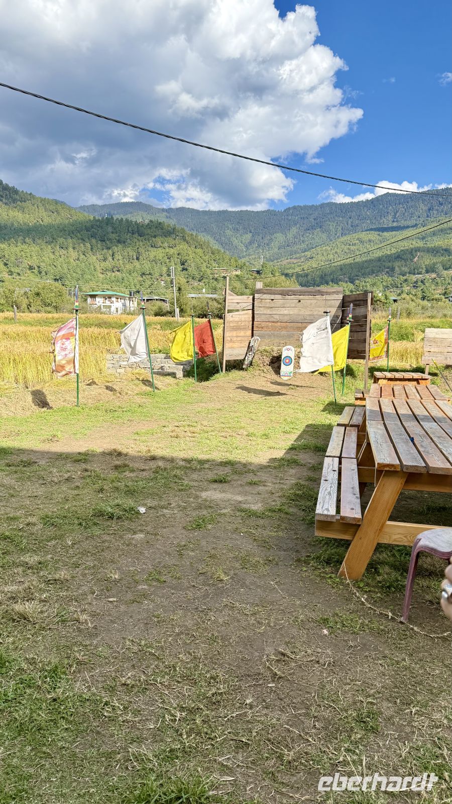 Unser Mittagessen fand heute in einem traditionellen Farmhaus statt. Die Gastfamilie empfing uns herzlich, und wir bekamen einen Einblick in das einfache, aber gemütliche Landleben Bhutans. Das Essen bestand aus landestypischen Gerichten und aromatischem Buttertee. Nach dem Essen durften wir uns das Haus ansehen, das aus Holz gebaut war, mit kunstvoll geschnitzten Fenstern und einem kleinen Hausaltar. Danach wartete ein weiteres Highlight auf uns: Wir durften uns im Bogenschießen versuchen – dem National- und Volkssport Bhutans. Überall im Land wird Bogenschießen mit großer Leidenschaft betrieben, und fast jedes Fest beinhaltet einen Wettkampf. Die Bhutaner treffen oft erstaunlich präzise auf große Distanz, begleitet von Gesängen, Jubel und Lachen – auch bei uns herrschte ausgelassene Stimmung.