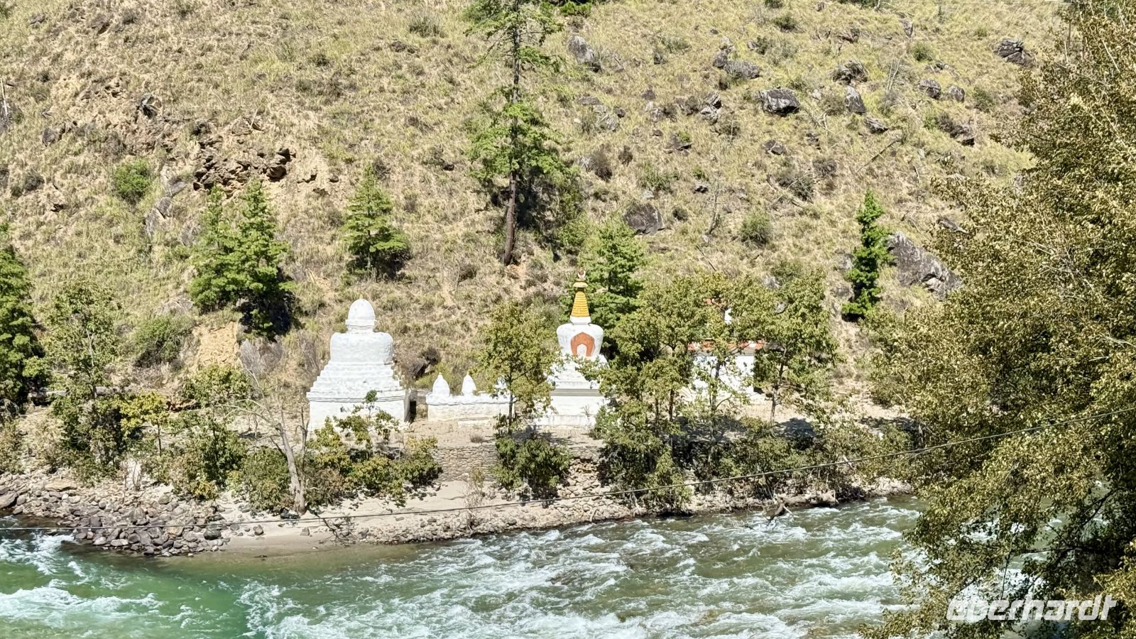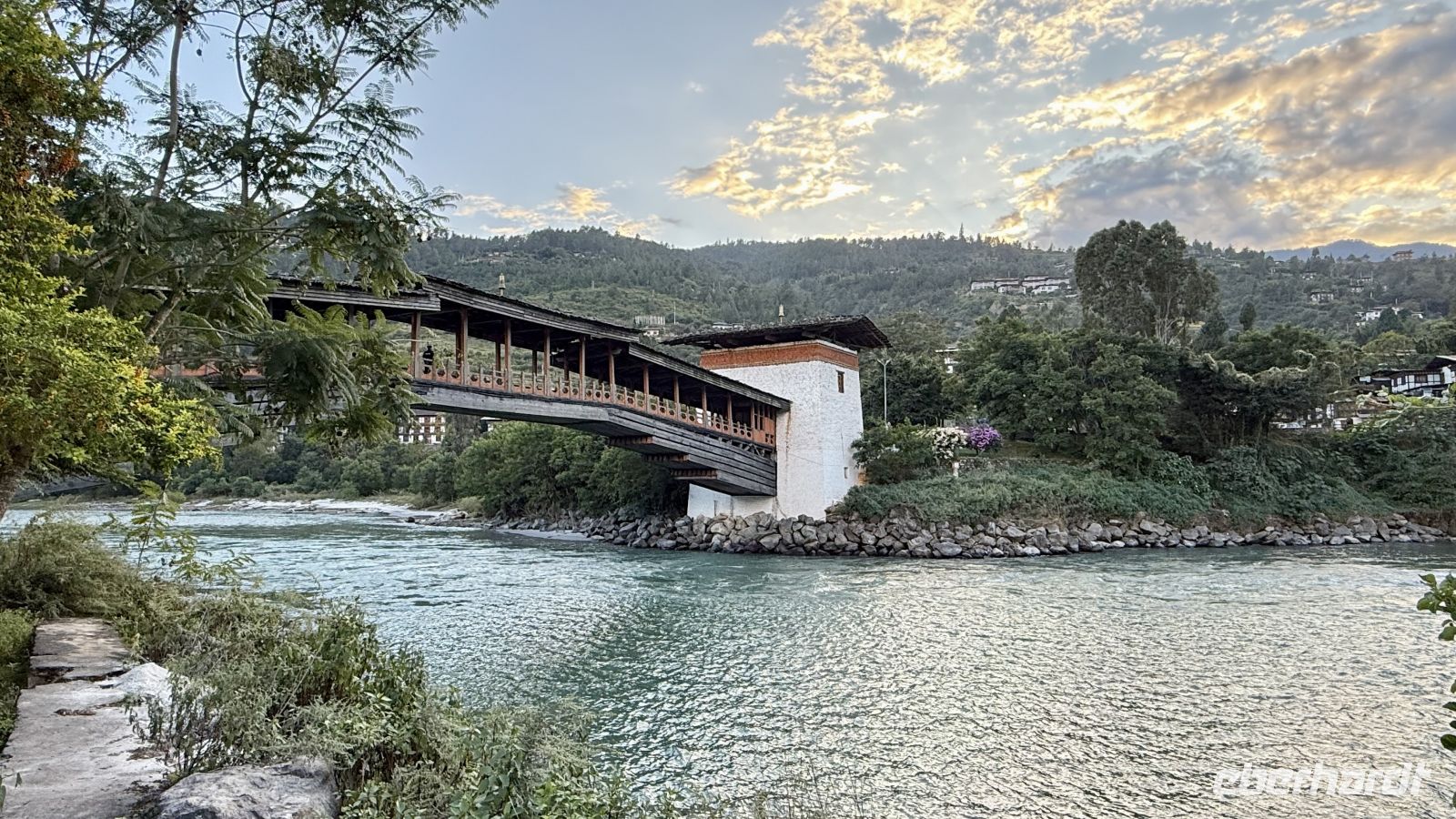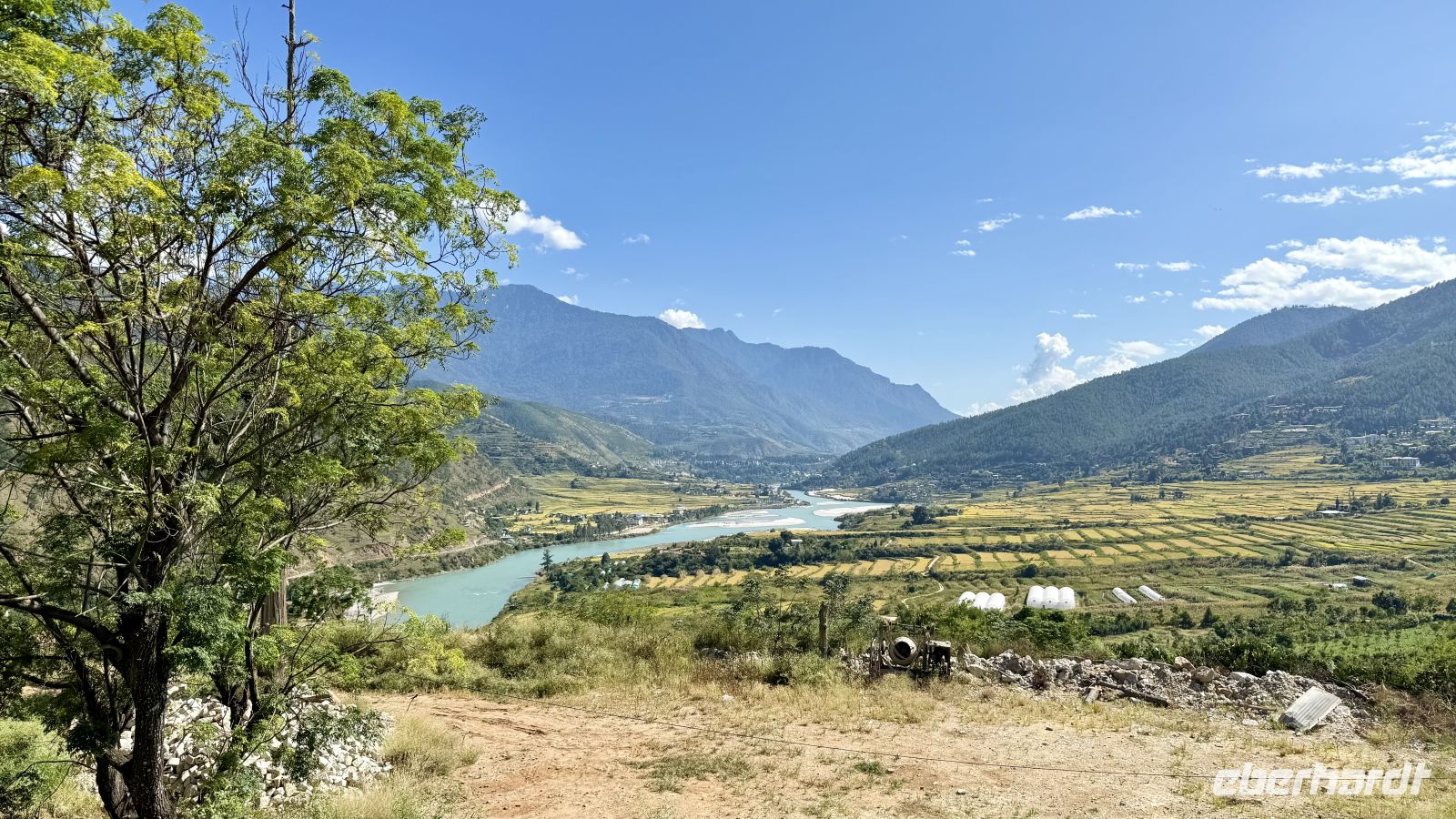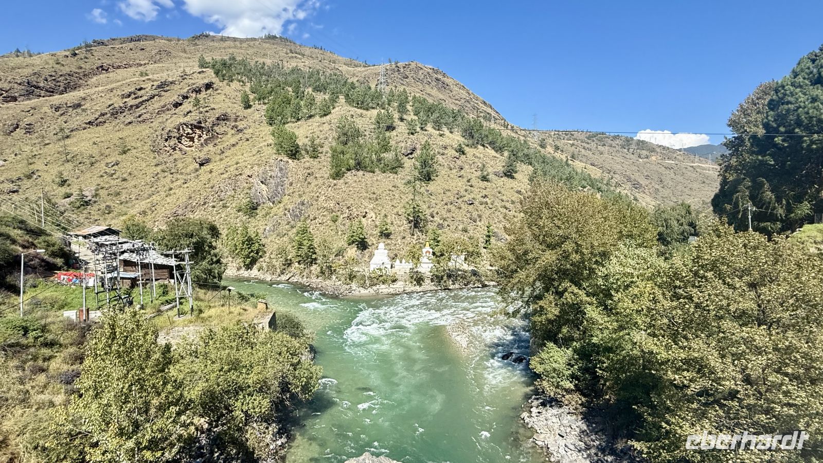 Nach der Besichtigung machten wir einen kurzen Spaziergang über die Brücke des Wangchu-Flusses. Der Wangchu ist einer der wichtigsten Flüsse Bhutans und fließt von den Himalaya-Gletschern bis hinunter in die Täler. Seine klaren, türkisblauen Wasserläufe werden zur Bewässerung der Felder genutzt und verleihen der Landschaft eine besondere Frische und Lebendigkeit.