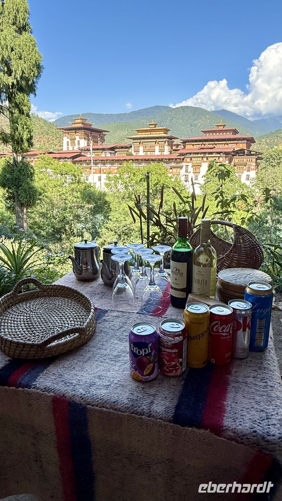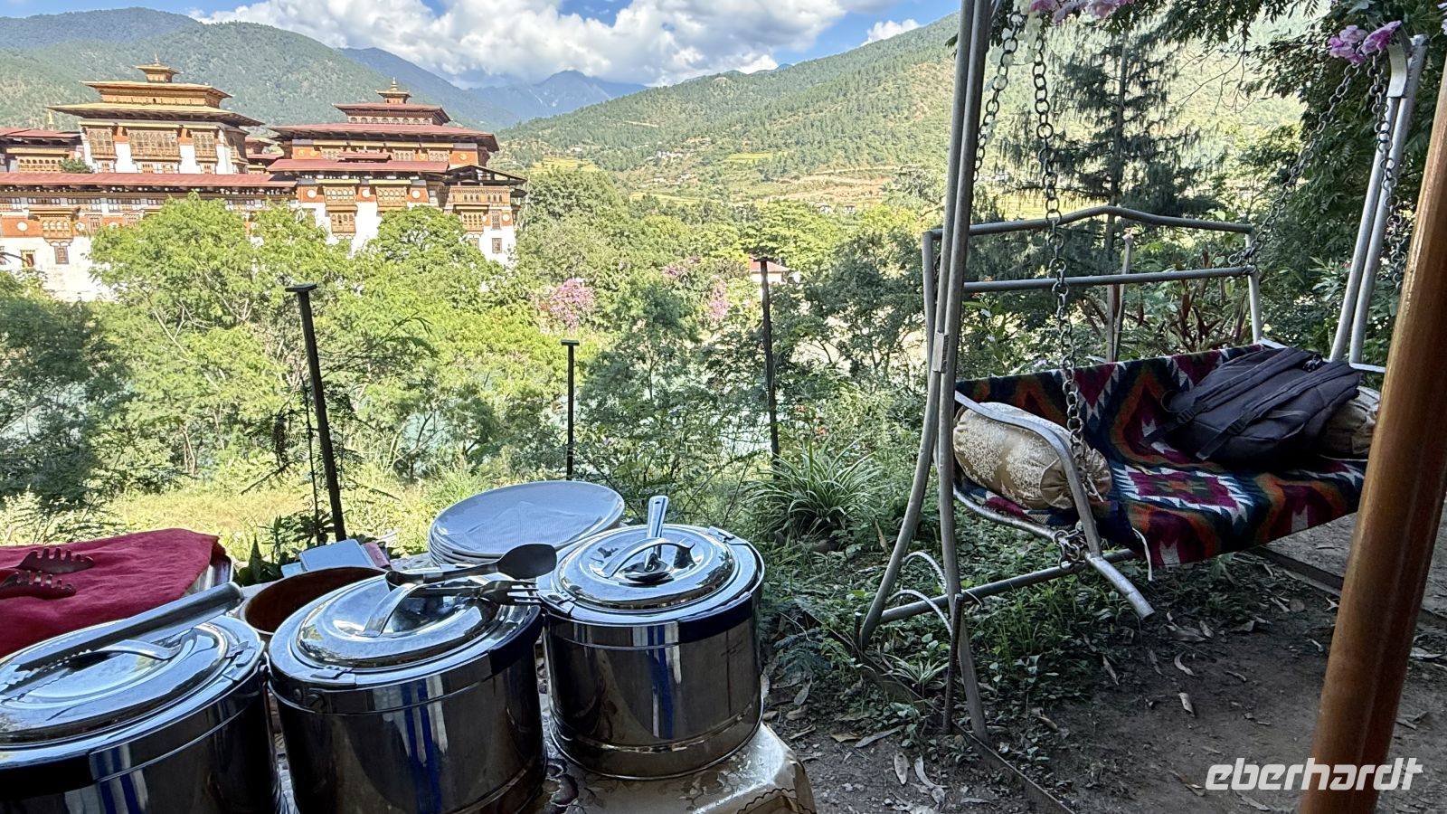 Als kleine Überraschung erwartete die Gäste anschließend ein warm serviertes Mittagessen mit direktem Blick auf den imposanten Punakha Dzong. Der Dzong, auch bekannt als Pungtang Dechen Photrang Dzong, liegt an der Mündung des Pho-Chhu- und Mo-Chhu-Flusses. Während wir die lokalen Speisen genossen, konnten wir die beeindruckende Architektur des Dzongs bewundern: massive weiße Mauern, kunstvoll geschnitzte Holzbalkone, goldene Dachverzierungen und die harmonische Einbettung in die umliegende Natur.