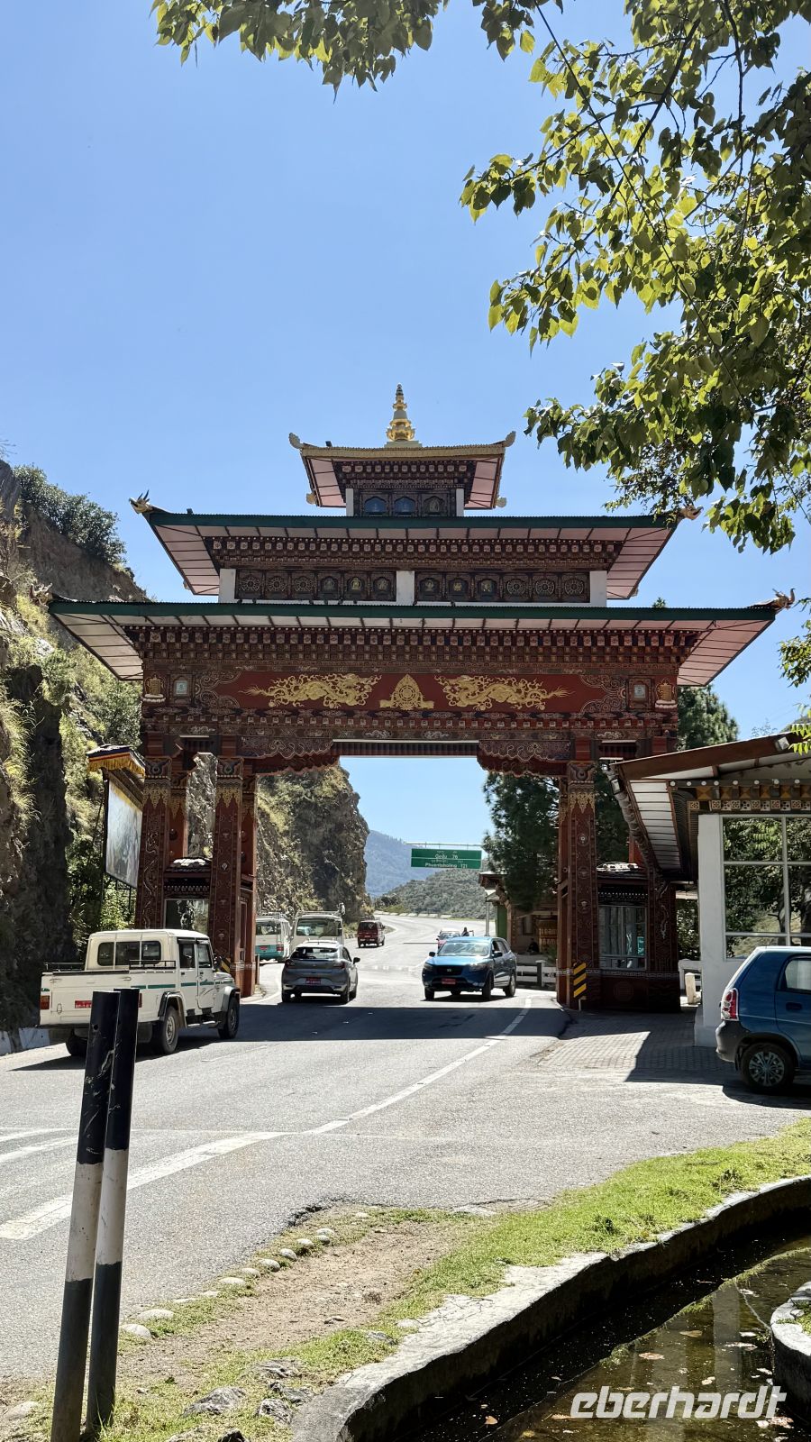 Nach einem reibungslosen Grenzübertritt reisten wir erfolgreich in Bhutan ein, wo uns unser Reiseleiter Kanju in Empfang nahm. Die Landschaft änderte sich sofort: grüne Hügel, traditionelle Häuser mit verzierten Holzbalkonen und das friedliche Lächeln der Menschen begrüßten uns.