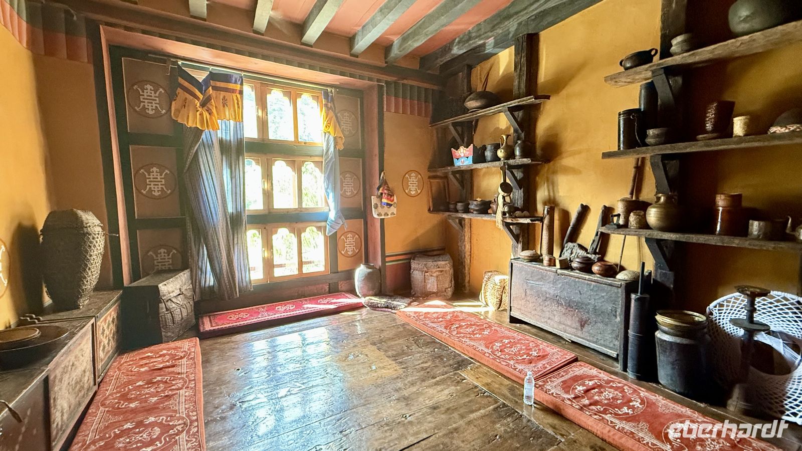 Danach ging es weiter zum Folk Heritage Museum, einem Freilichtmuseum, das das ländliche Leben Bhutans in vergangenen Zeiten dokumentiert. Hier stehen traditionelle Häuser, Bauernwerkzeuge und Handwerksgegenstände, die den Alltag der Landbevölkerung veranschaulichen. Wir konnten sehen, wie die Menschen früher gelebt, gekocht und gearbeitet haben, und erhielten so einen authentischen Eindruck von der bhutanischen Kultur und Geschichte.