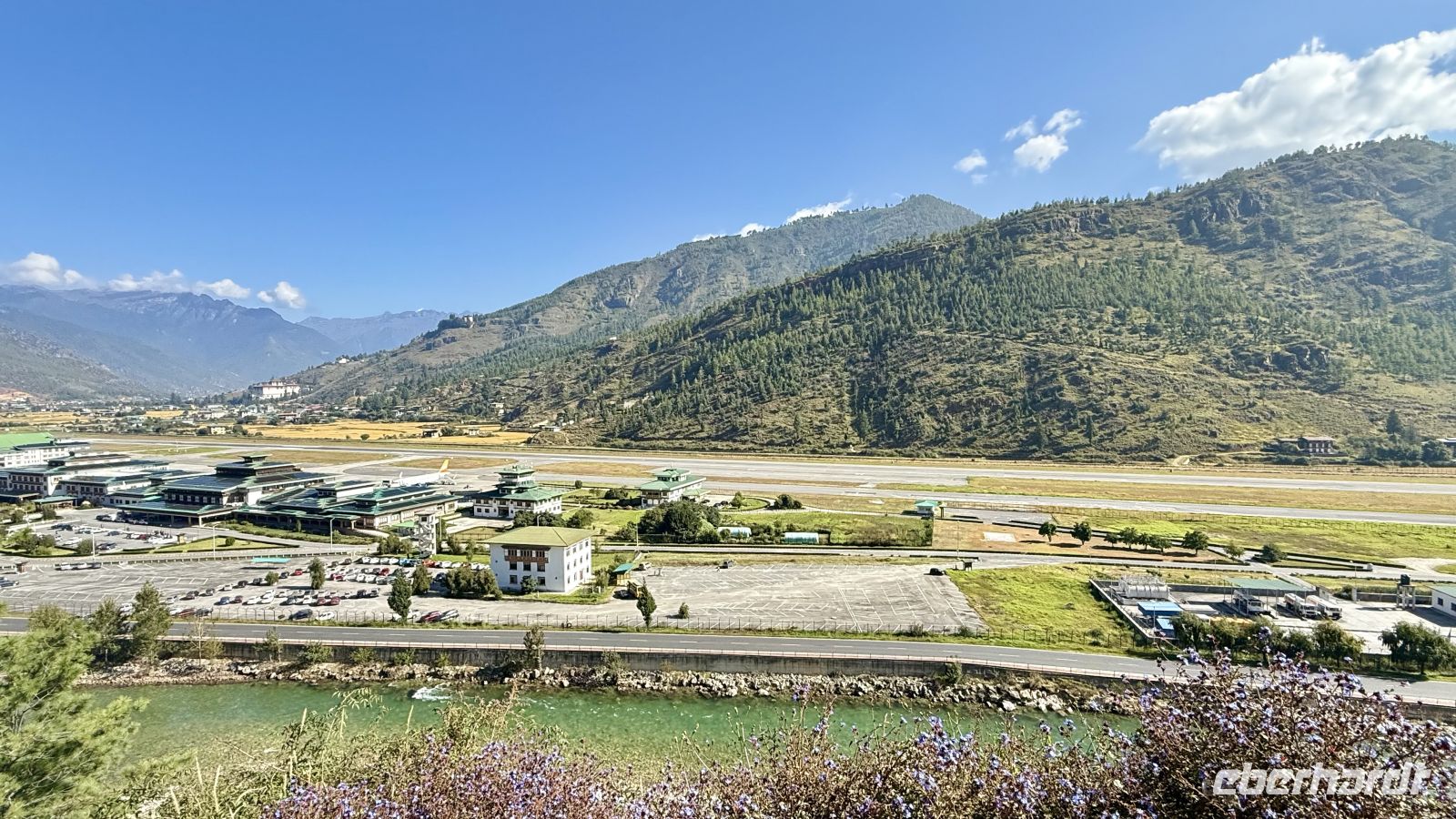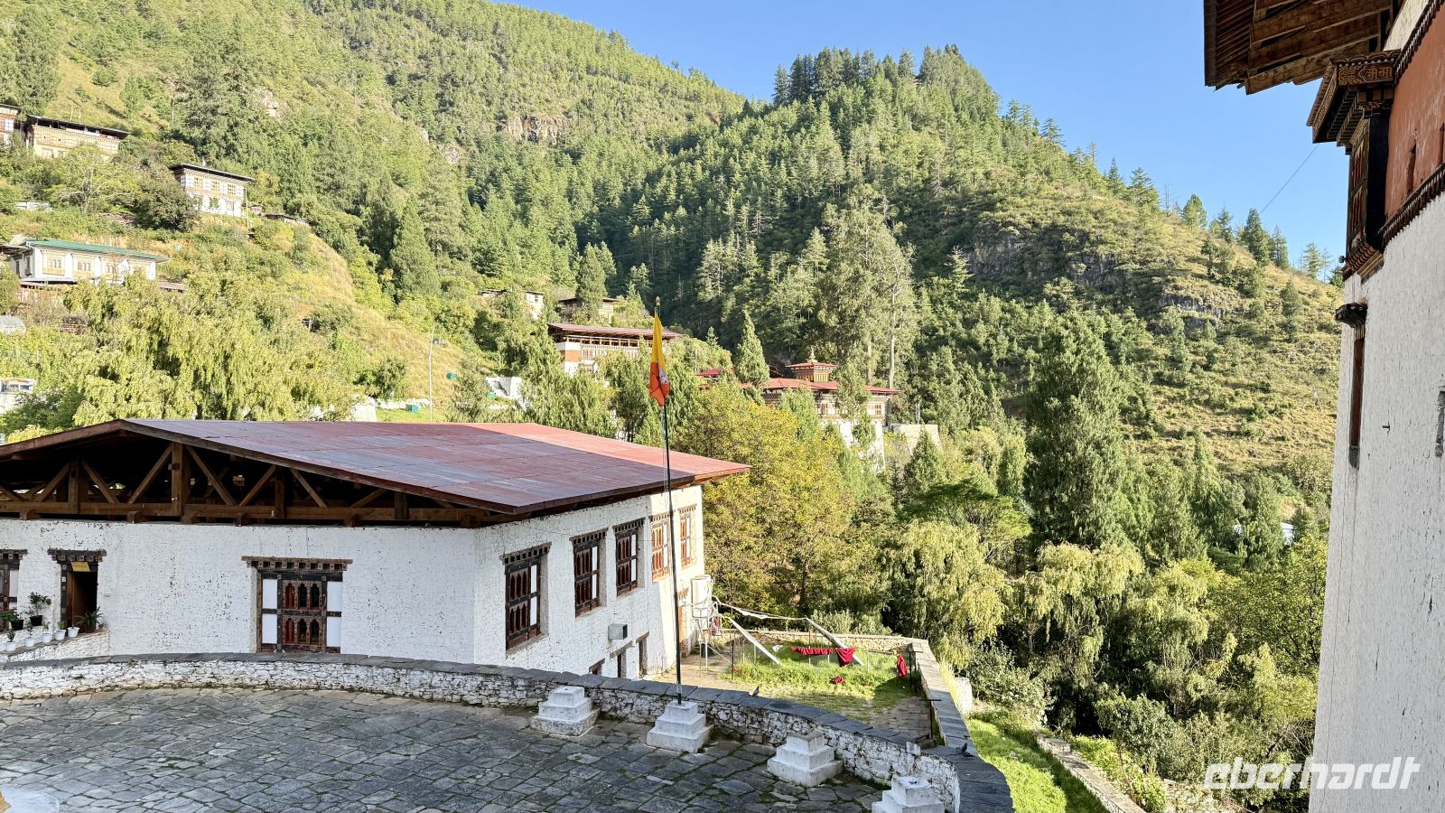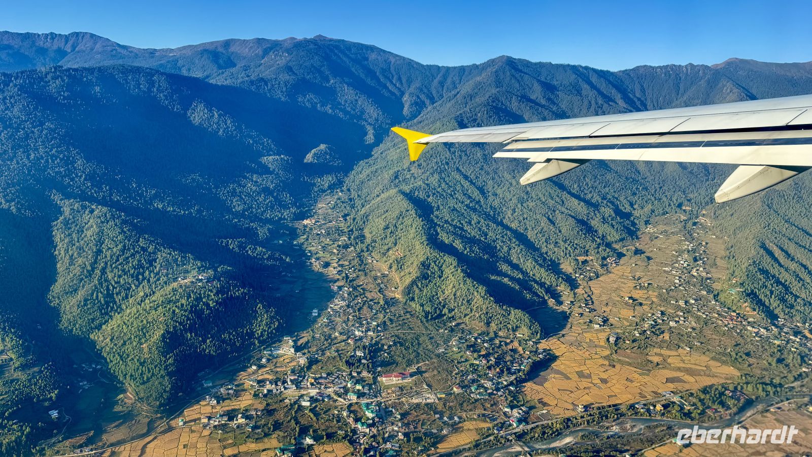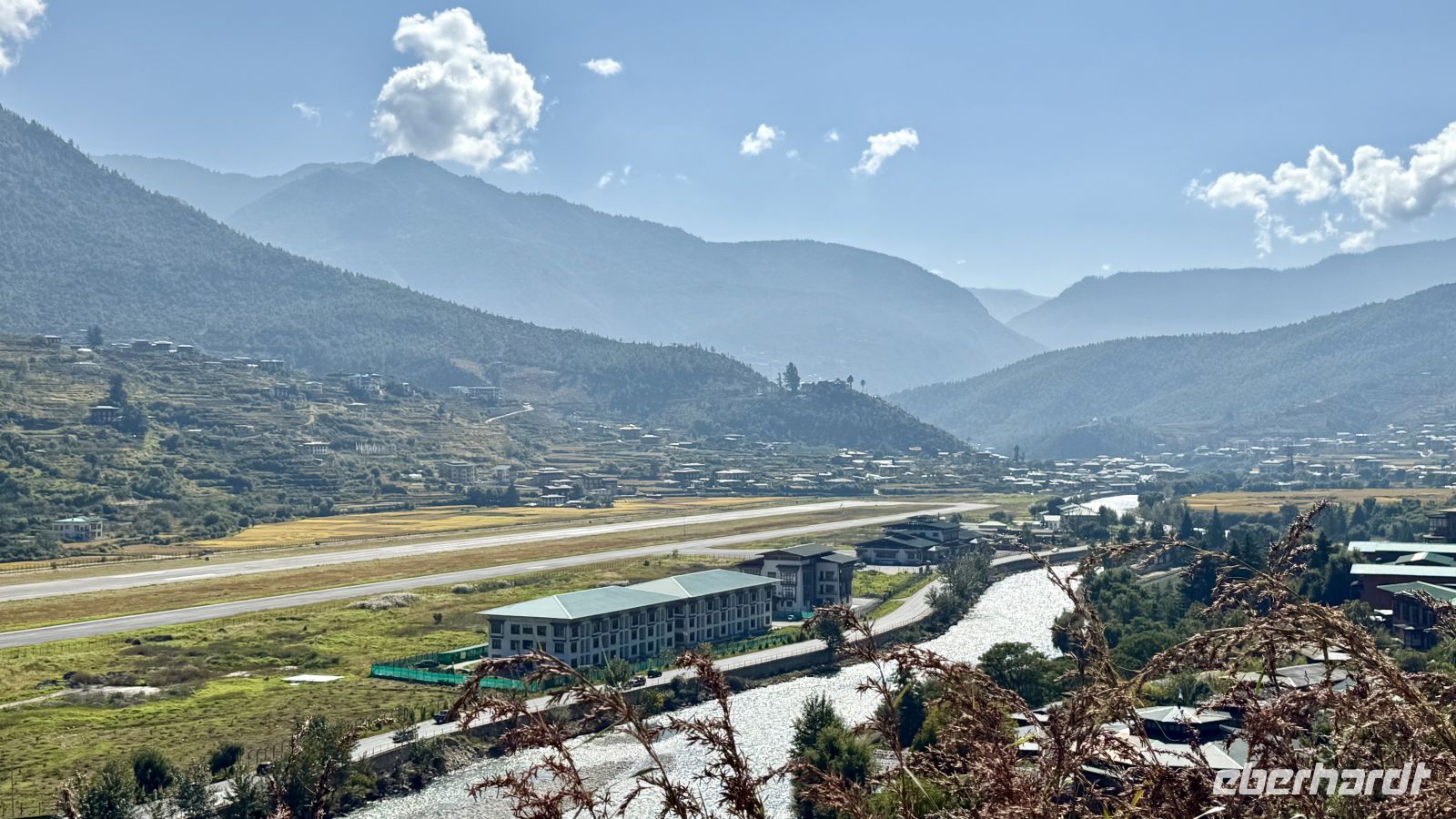 Der heutige Tag startete etwas später, und alle konnten in aller Ruhe frühstücken und entspannt in den Tag beginnen. Danach machten wir einen kleinen Ausflug, um uns schon einmal anzusehen, was uns beim Flug in zwei Tagen erwartet. Wir fuhren zum internationalen Flughafen von Paro, dem einzigen internationalen Flughafen in ganz Bhutan. Er liegt malerisch eingebettet zwischen hohen Bergen auf rund 2.200 Metern Höhe und gilt als einer der anspruchsvollsten Flughäfen der Welt, da Starts und Landungen nur bei guten Wetterbedingungen möglich sind. Wir hatten großes Glück und konnten sowohl eine Landung als auch einen Start aus nächster Nähe beobachten – ein wirklich beeindruckendes Erlebnis!