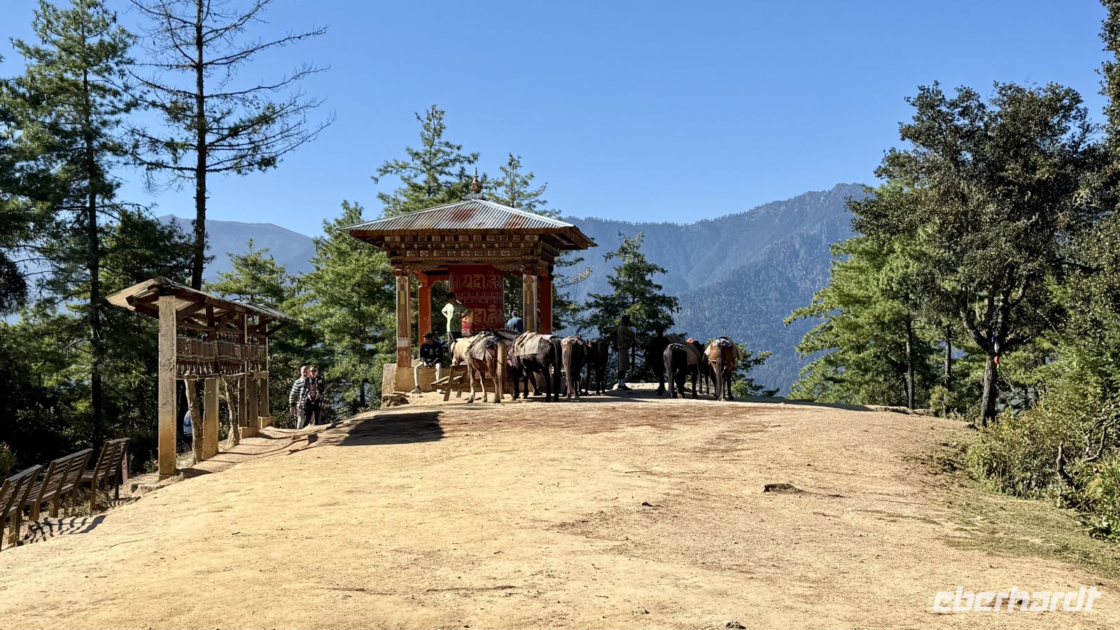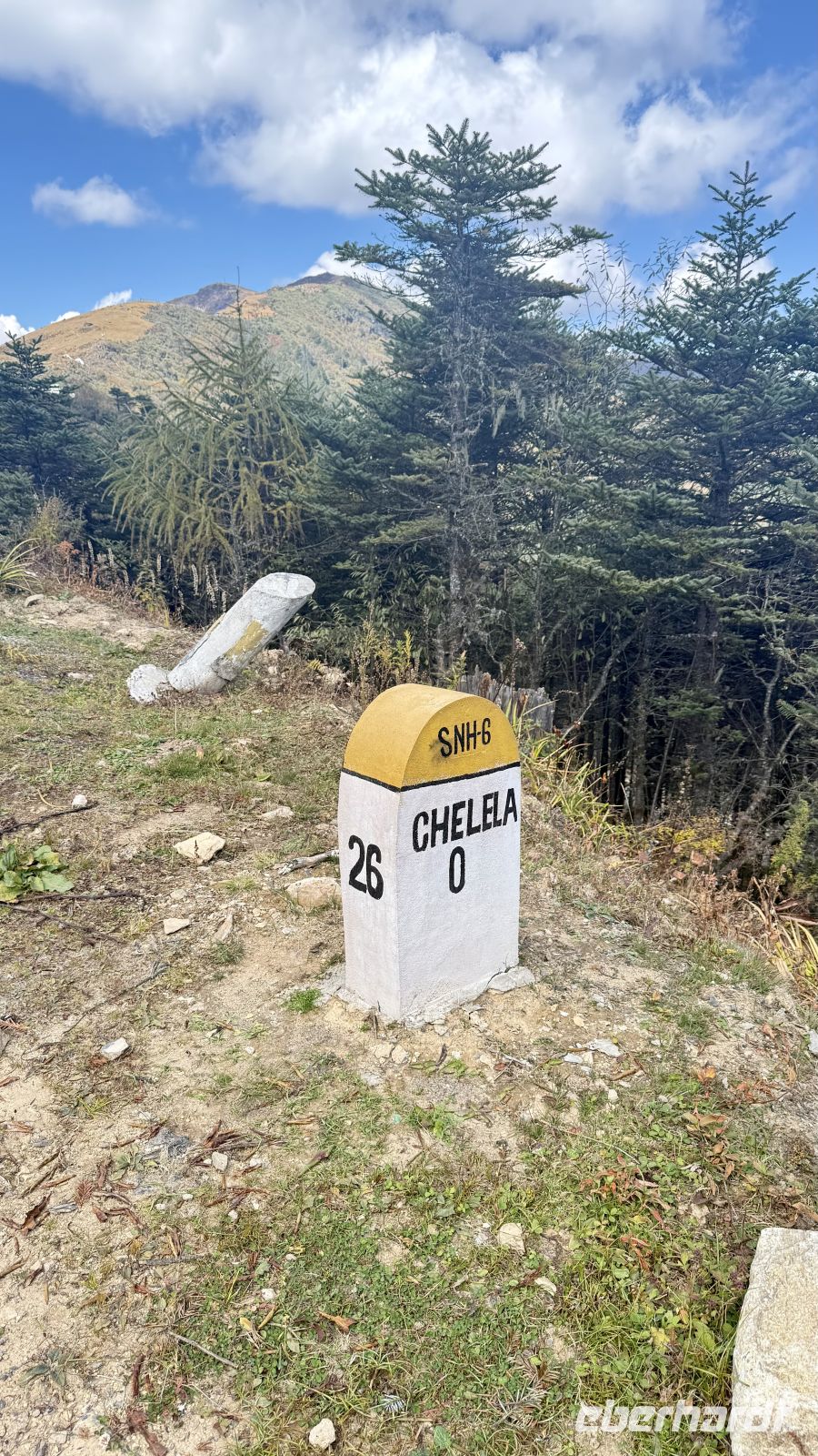 Unser eigentliches Ziel war jedoch der Chele-La-Pass, den wir gegen Mittag erreichten. Der Pass liegt auf etwa 3.988 Metern Höhe und ist der höchste befahrbare Pass Bhutans. Er verbindet die Täler von Paro und Haa und bietet bei klarem Wetter einen atemberaubenden Panoramablick auf die schneebedeckten Gipfel des Himalaya. Besonders eindrucksvoll war der Blick auf den majestätischen Jomolhari, den mit 7.350 Metern zweithöchsten Berg Bhutans. Der Jomolhari gilt als heiliger Berg und wird in der bhutanischen Mythologie als Wohnsitz einer Berggöttin verehrt.