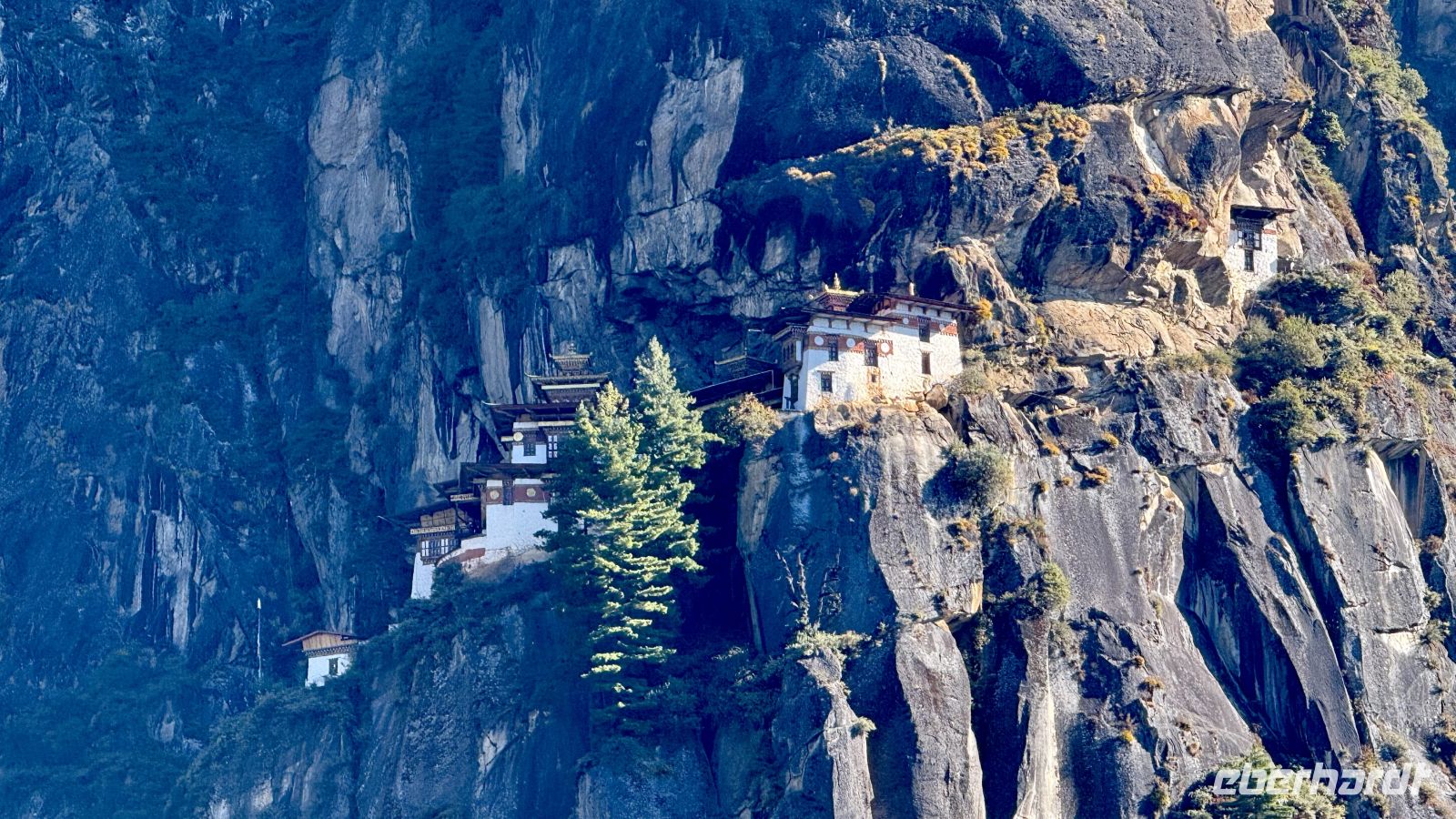 Der zweite Teil der Gruppe machte sich früh am Morgen auf den Weg zum Tigernest-Kloster, das auf Bhutanisch Taktsang Monastery heißt. Es ist eines der heiligsten und spektakulärsten Klöster des Landes und thront in rund 3.120 Metern Höhe an einer steilen Felswand etwa 700 Meter über dem Paro-Tal. Der Legende nach soll Guru Rinpoche, der den Buddhismus im 8. Jahrhundert nach Bhutan brachte, auf dem Rücken einer Tigerin hierher geflogen sein, um in einer Höhle zu meditieren – daher der Name „Tigernest“. In einer Höhle meditierte er mehrere Monate lang, um böse Geister zu besiegen und den Buddhismus in Bhutan zu festigen. Aus dieser heiligen Höhle entstand später das Tigernest-Kloster, das bis heute als einer der heiligsten Pilgerorte Bhutans gilt. Das ursprüngliche Kloster wurde im 17. Jahrhundert von Tenzin Rabgye, einem bhutanischen Herrscher, erbaut, um Guru Rinpoches Aufenthalt zu ehren. Über die Jahrhunderte hinweg wurde es immer wieder erweitert, restauriert und liebevoll gepflegt. Besonders nach einem großen Brand im Jahr 1998, der große Teile der Anlage zerstörte, wurde es originalgetreu wieder aufgebaut – ein Symbol für den unerschütterlichen Glauben und die Hingabe der Bhutaner.