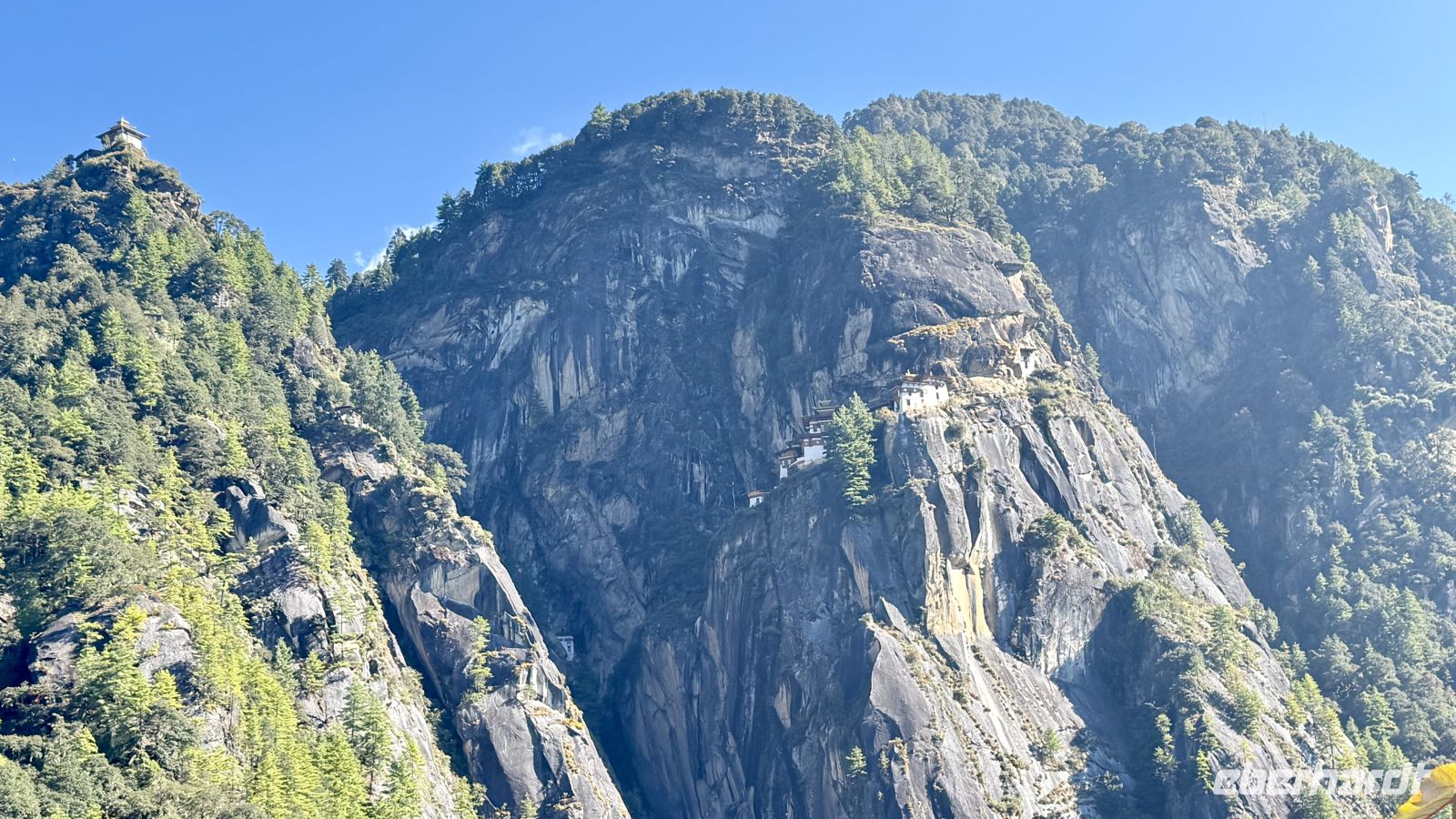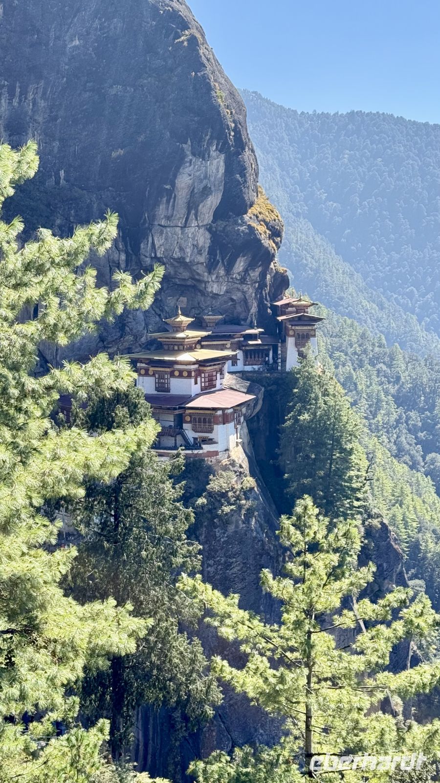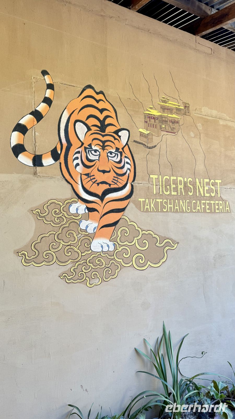 Etwa auf halber Strecke liegt ein Café, das einen direkten Blick auf das Tigernest bietet – ein beliebter Ort für eine Teepause oder ein leichtes Mittagessen. Dort sammelten wir neue Kraft, genossen die klare Bergluft und das Panorama, das uns den Atem raubte. Die Sonne schien warm, der Himmel war klar, und die bunten Gebetsfahnen flatterten über uns im Wind. Es war einer dieser Momente, die man so schnell nicht vergisst – voller Frieden, Stolz und Dankbarkeit.