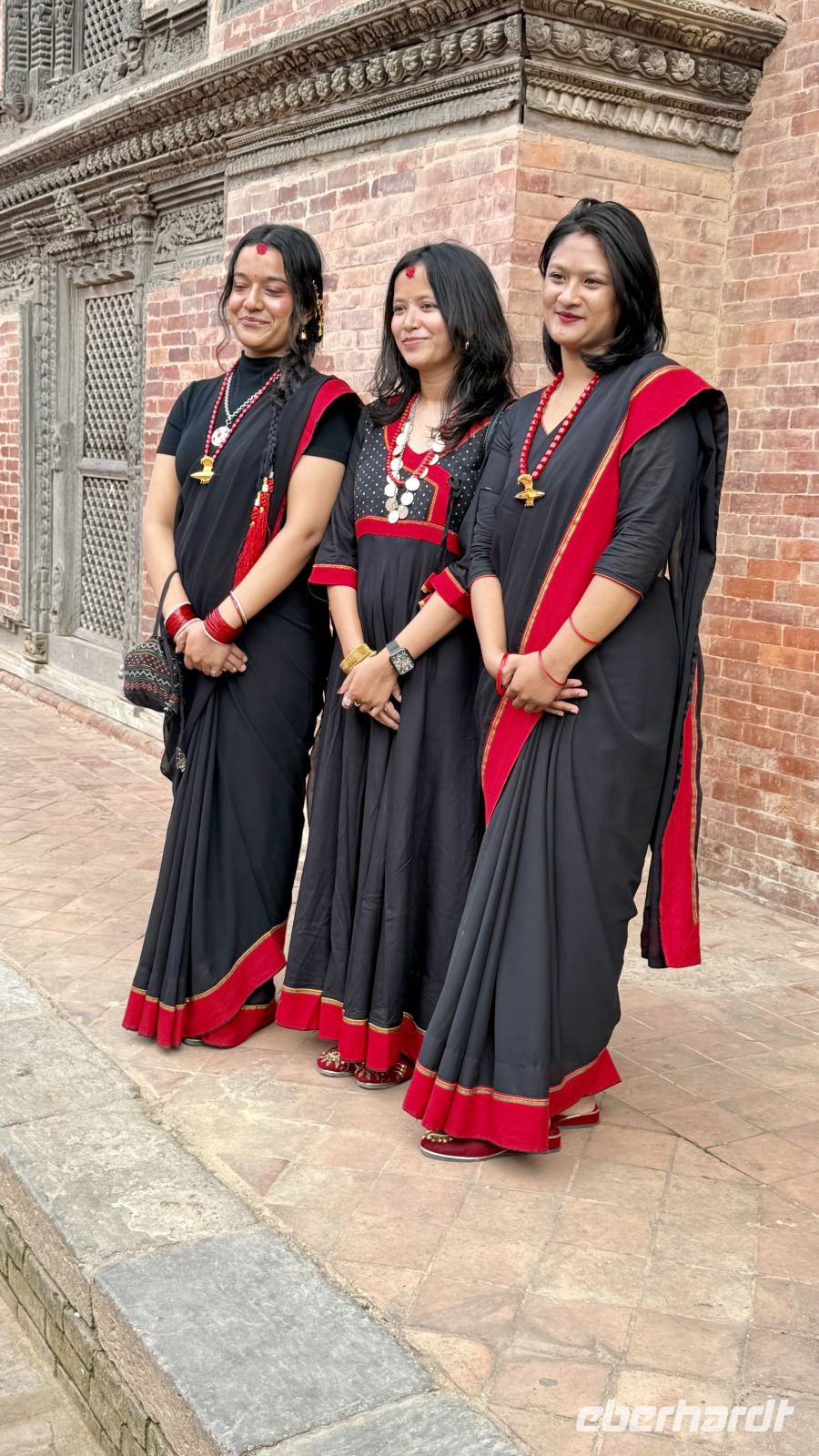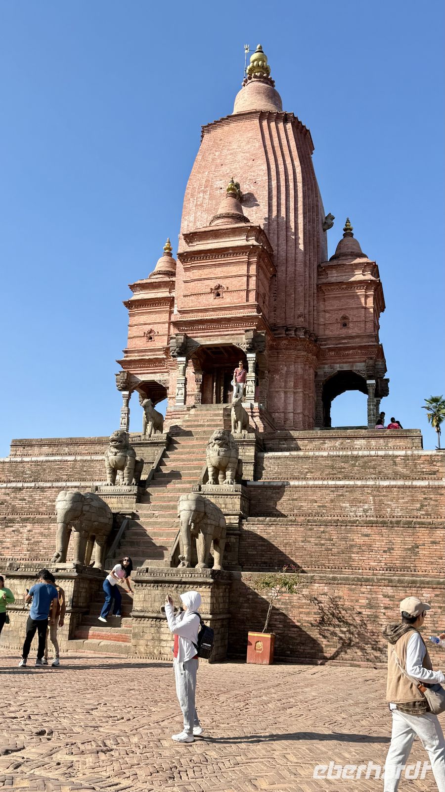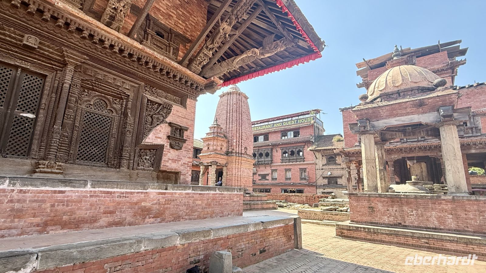Im Anschluss fuhren wir nach Bhaktapur, einer der drei Königsstädte des Kathmandu-Tals und ebenfalls UNESCO-Weltkulturerbe. Bhaktapur gilt als die am besten erhaltene mittelalterliche Stadt Nepals. Schon beim Betreten der Altstadt fühlte man sich in eine andere Zeit versetzt: enge Gassen, kunstvoll geschnitzte Holzfenster, rote Backsteinbauten und überall kleine Werkstätten, in denen Töpfer, Maler und Holzschnitzer ihre Handwerkskunst ausüben. Wir spazierten über den Durbar Square von Bhaktapur, auf dem sich prachtvolle Tempel, Pagoden und der ehemalige Königspalast befinden. Hier nahmen wir auch unser Mittagessen ein – mit Blick auf das lebendige Treiben der Stadt.