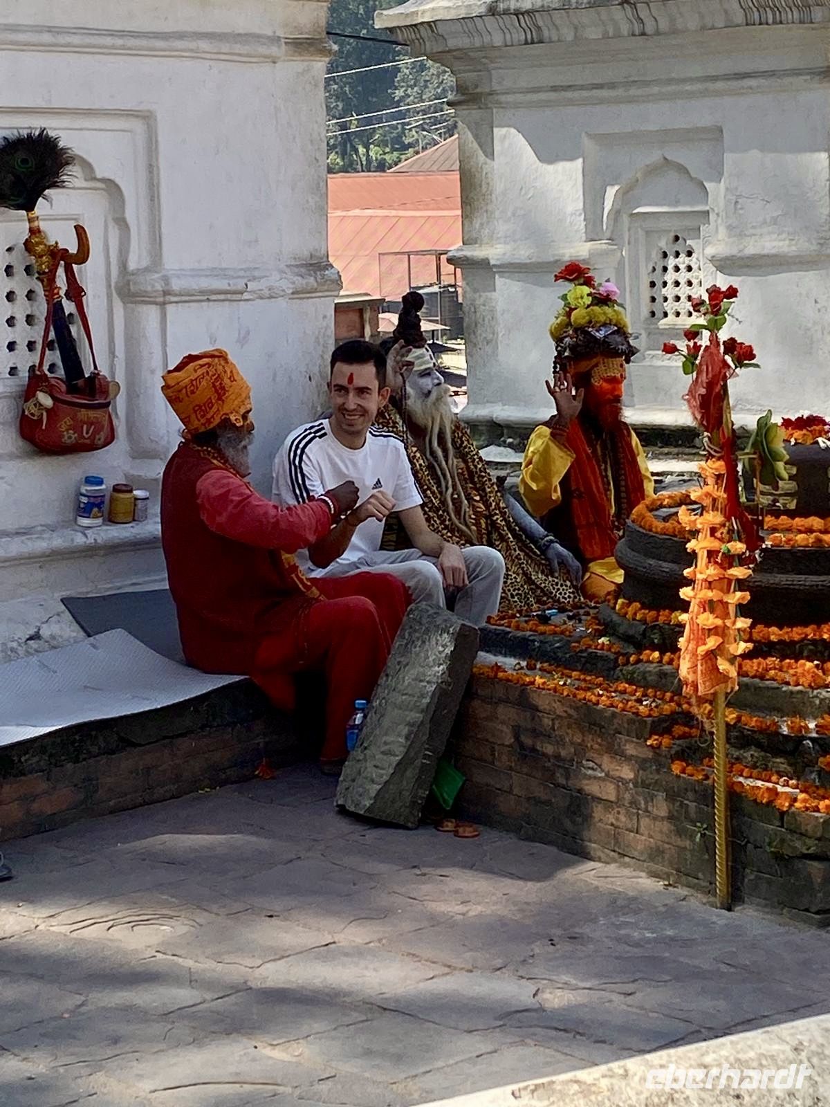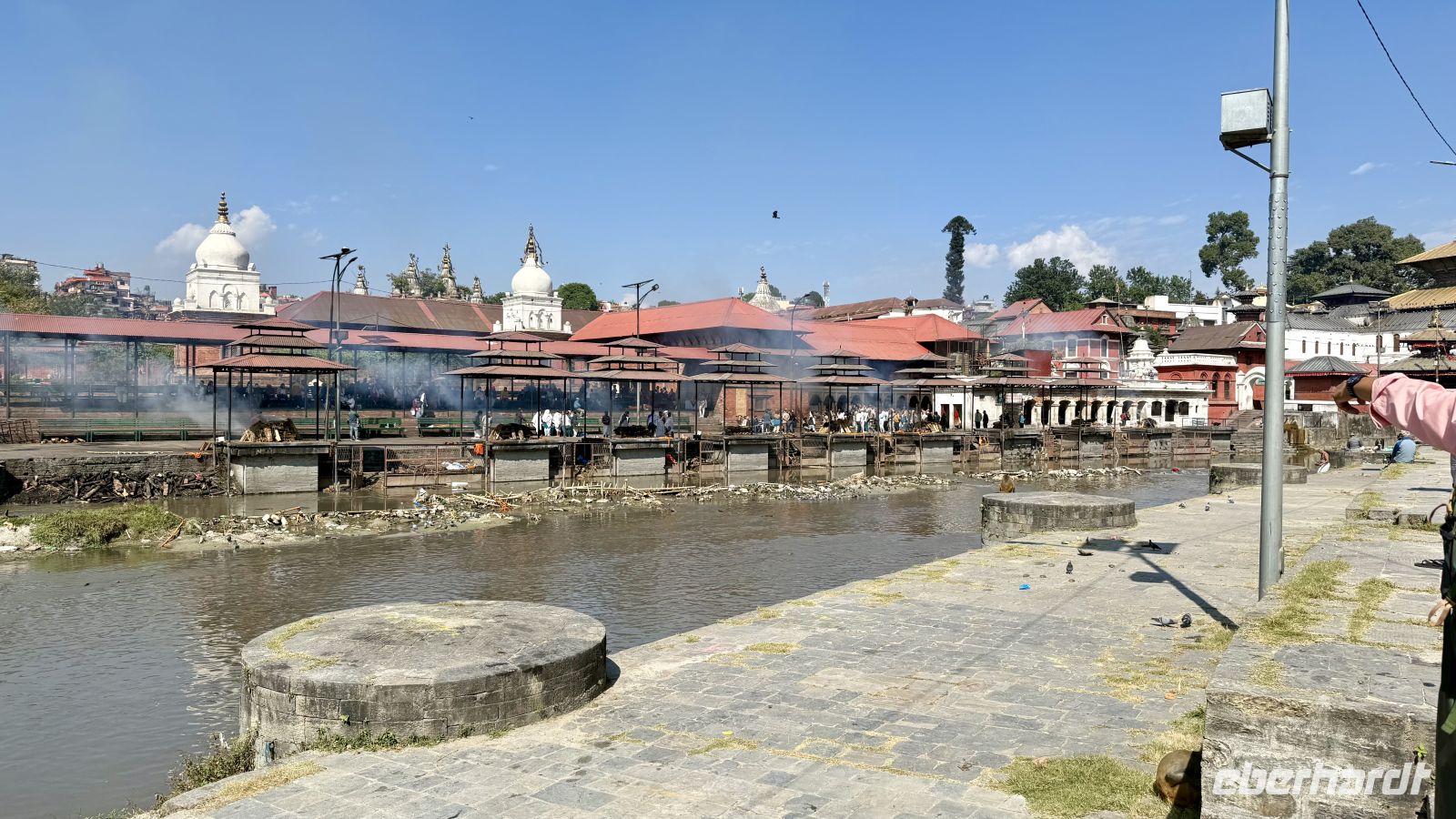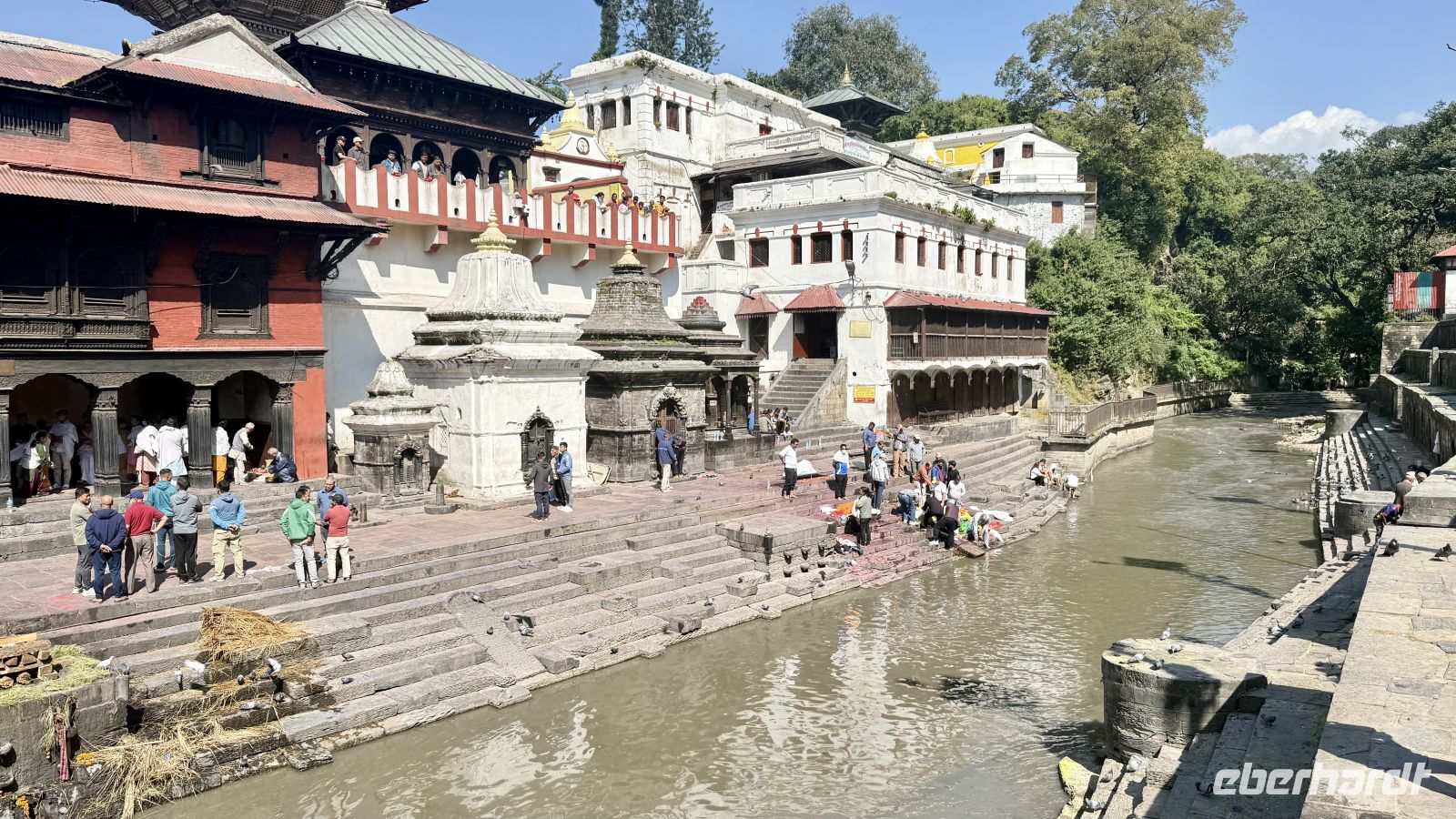 Unser erster Halt war die bedeutende Tempelanlage Pashupatinath, eine der heiligsten Stätten des Hinduismus. Sie liegt am Ufer des Bagmati-Flusses, der für Hindus eine ähnliche Bedeutung hat wie der Ganges in Indien. Pashupatinath ist dem Gott Shiva in seiner Erscheinungsform als „Herr der Tiere“ geweiht. Der weitläufige Tempelkomplex umfasst zahlreiche Schreine, kleinere Tempel, Aschramas und ghats (Steintreppen), an denen die Verbrennungszeremonien stattfinden. Für uns war es ein intensives Erlebnis – einerseits beeindruckend, die Rituale und die tiefe Religiosität der Menschen zu sehen, andererseits auch bewegend und ungewohnt, den Tod so offen und würdevoll in das Leben integriert zu erleben.