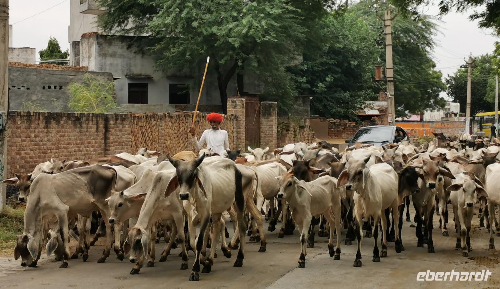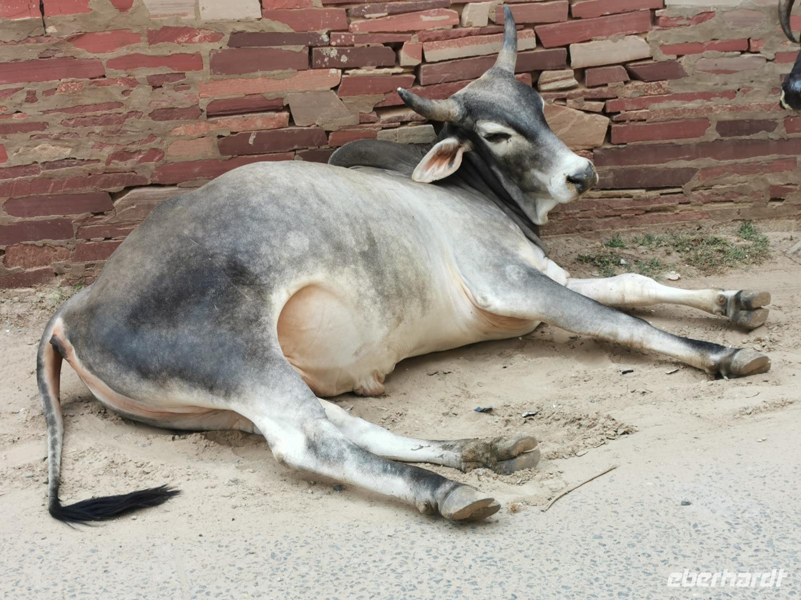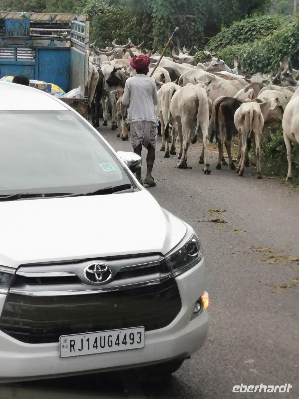 Etliche Zeburinderherden kreuzten unseren Weg. Kühe sind für die Hindus heilige Geschöpfe, dürfen also weder getötet noch verzehrt werden und der Verkehr fließt daher einfach um sie herum. Wir sahen Fahrräder mit Riesenlasten, Mopeds mit bis zu sechs Personen drauf und einige Gäste stellten fest, wie gut es uns doch in Deutschland geht und wie einfach die meisten Menschen hier leben.