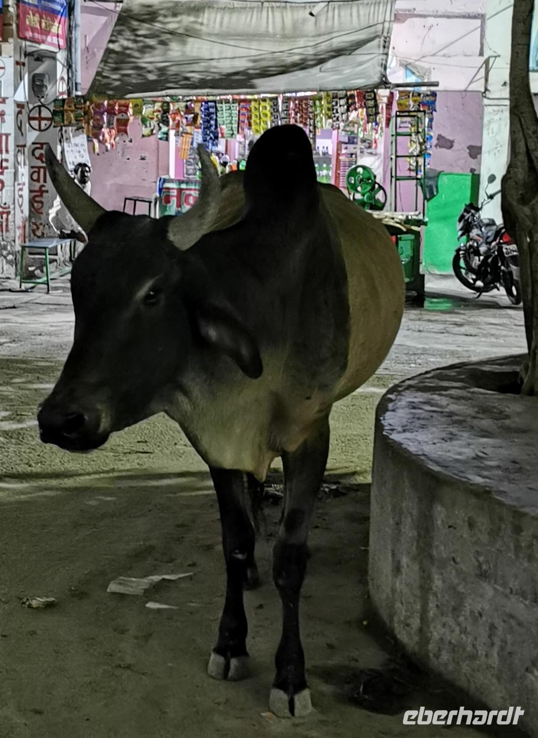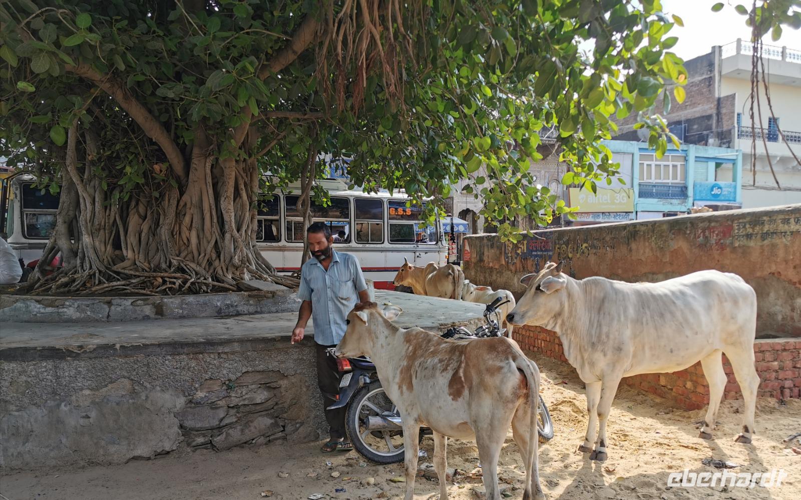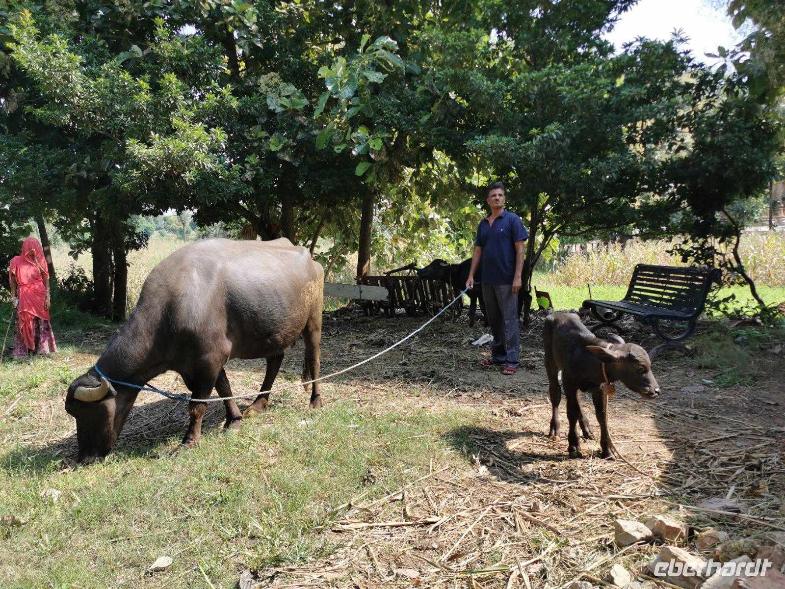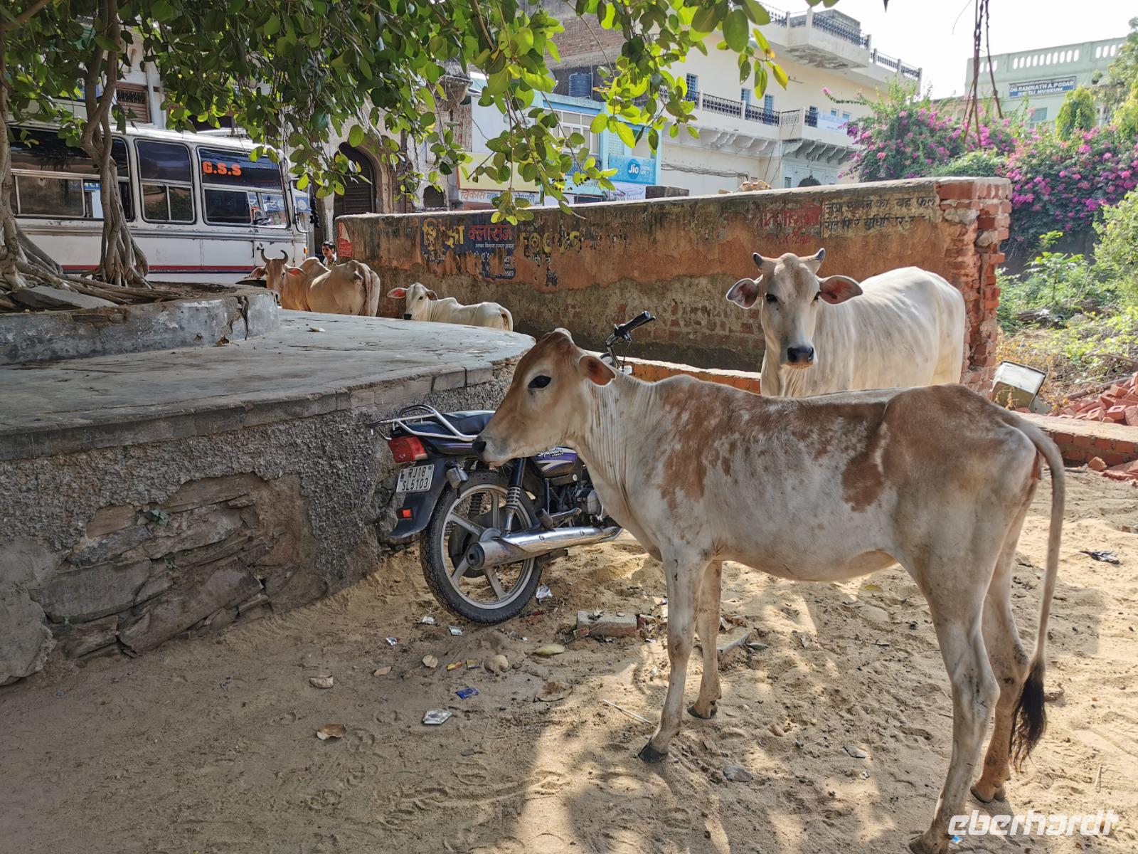 Etliche Zeburinderherden kreuzten unseren Weg. Kühe sind für die Hindus heilige Geschöpfe, dürfen also weder getötet noch verzehrt werden und der Verkehr fließt daher einfach um sie herum. Wir sahen Fahrräder mit Riesenlasten, Mopeds mit bis zu sechs Personen drauf und einige Gäste stellten fest, wie gut es uns doch in Deutschland geht und wie einfach die meisten Menschen hier leben.