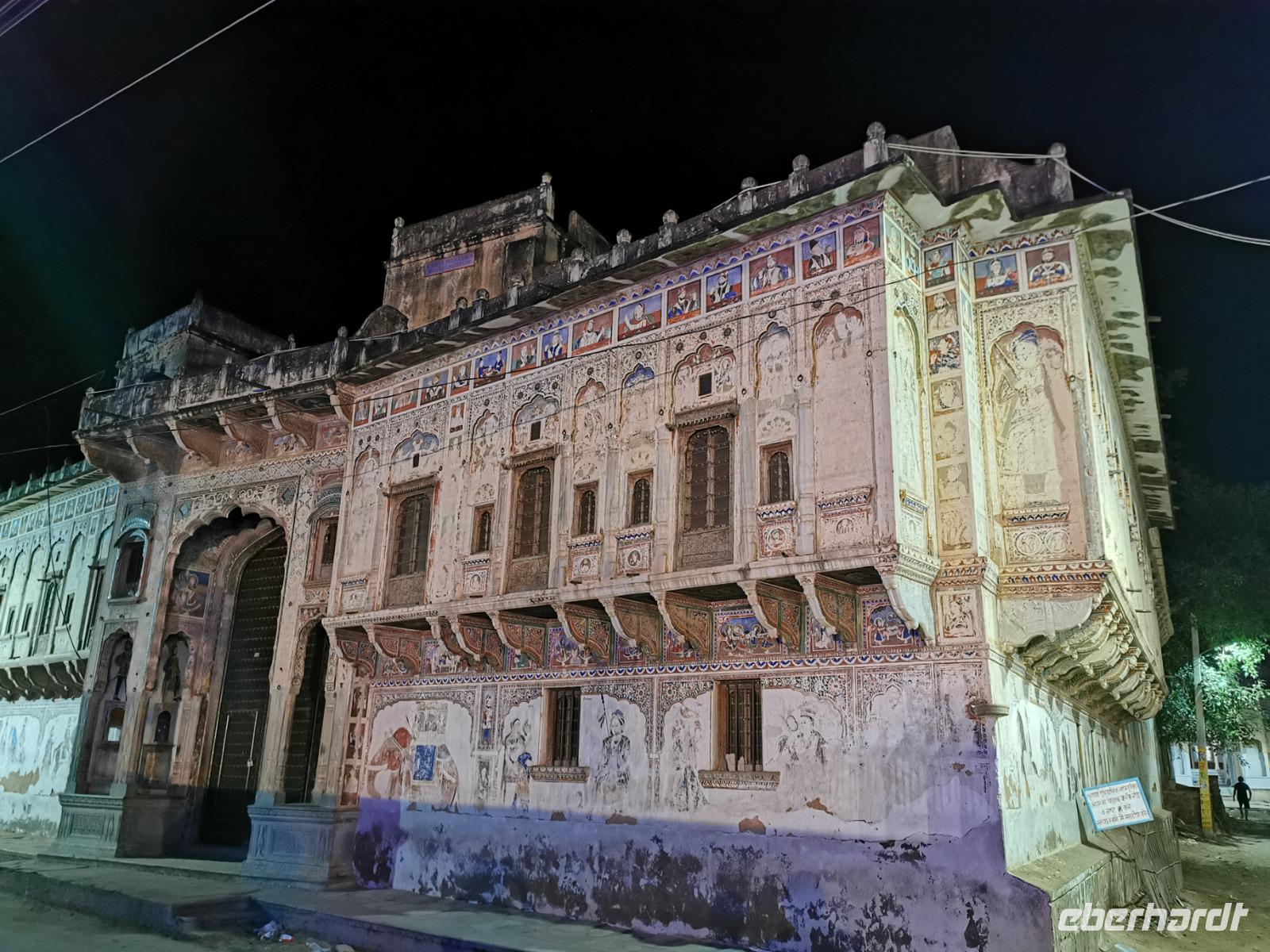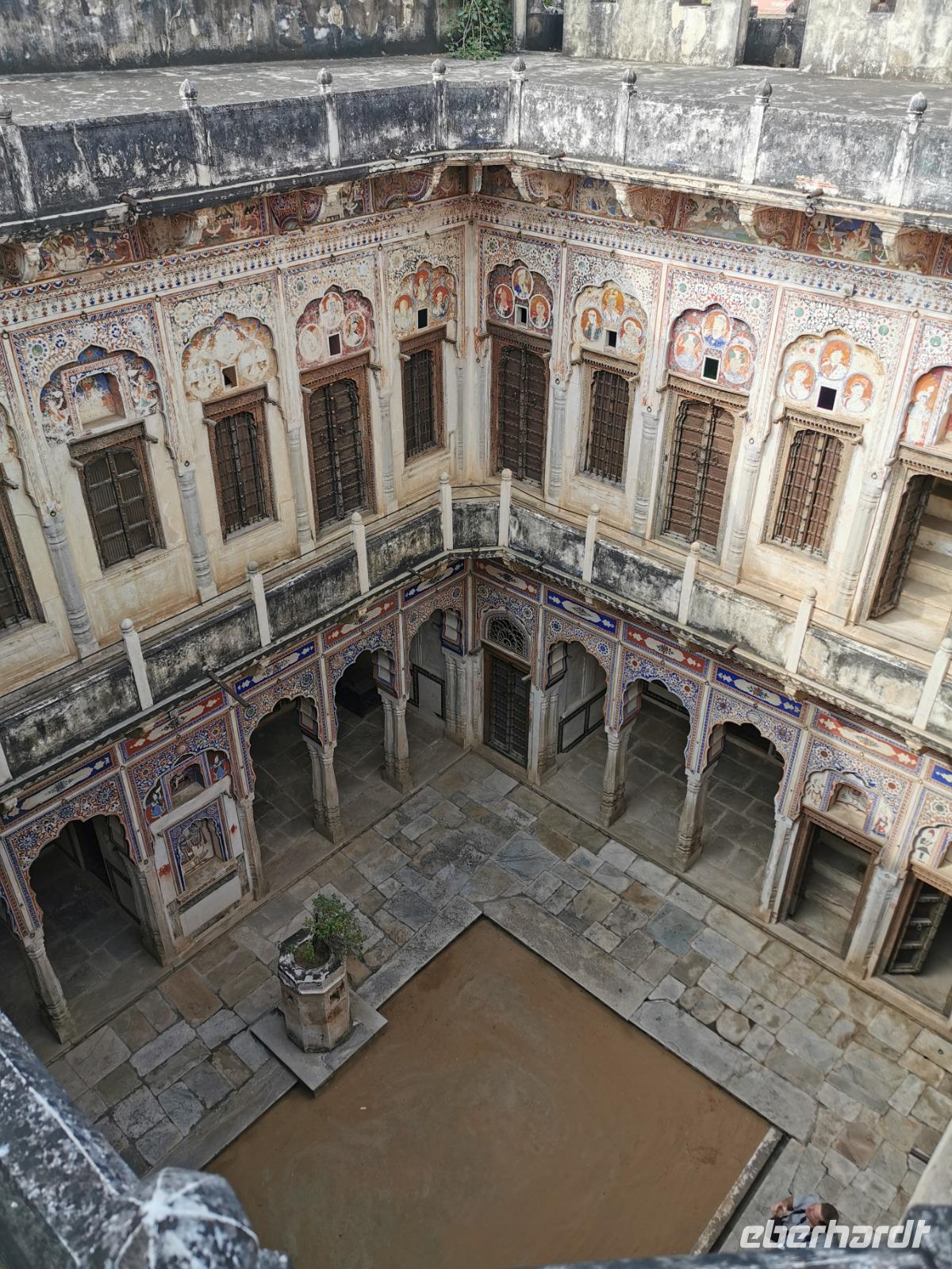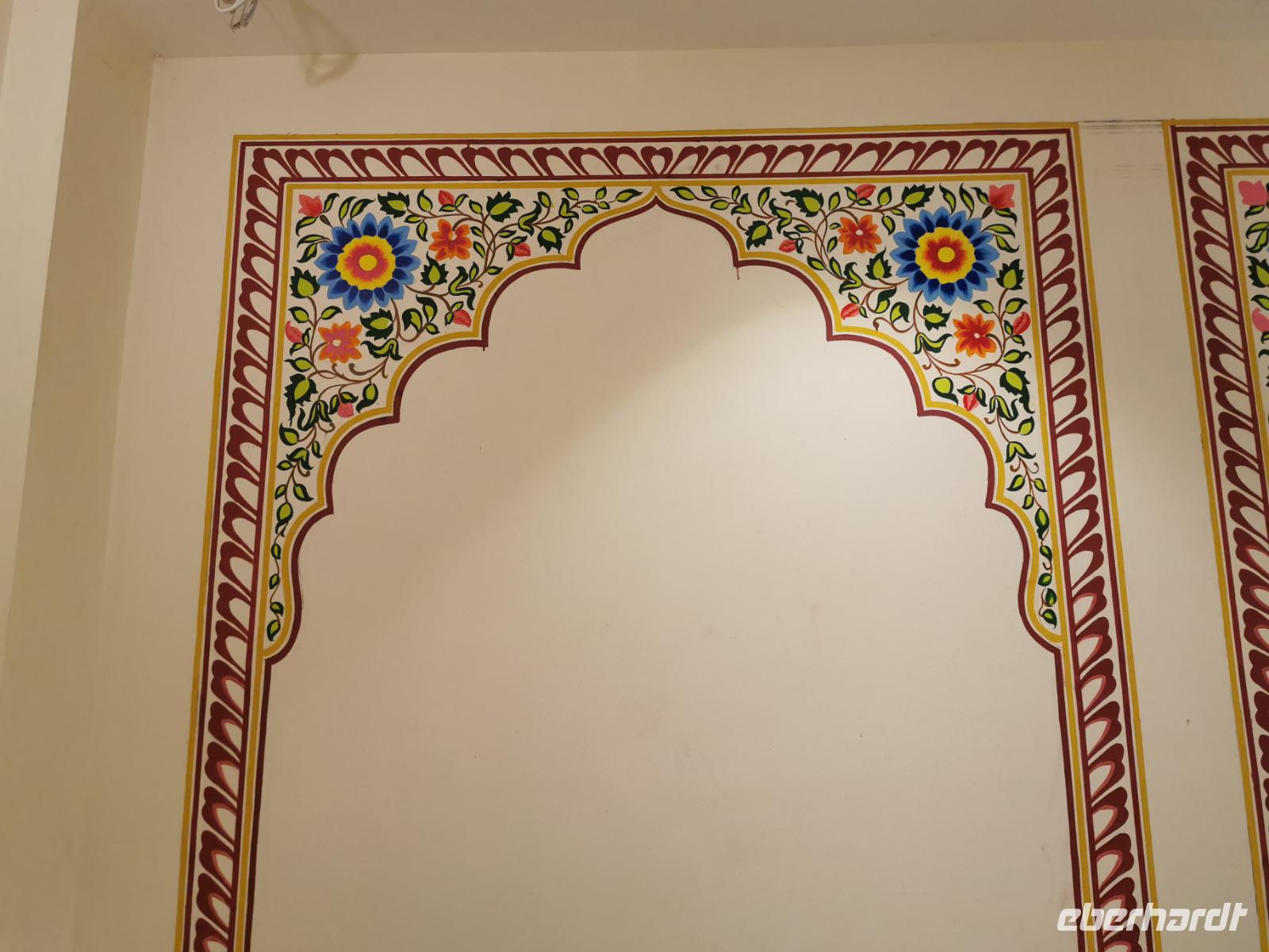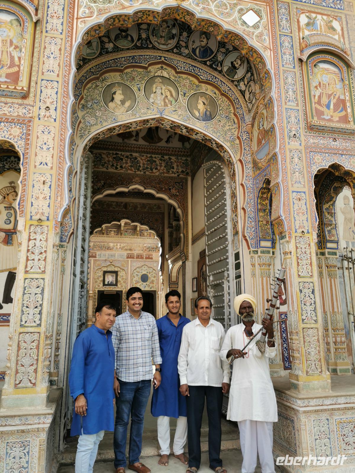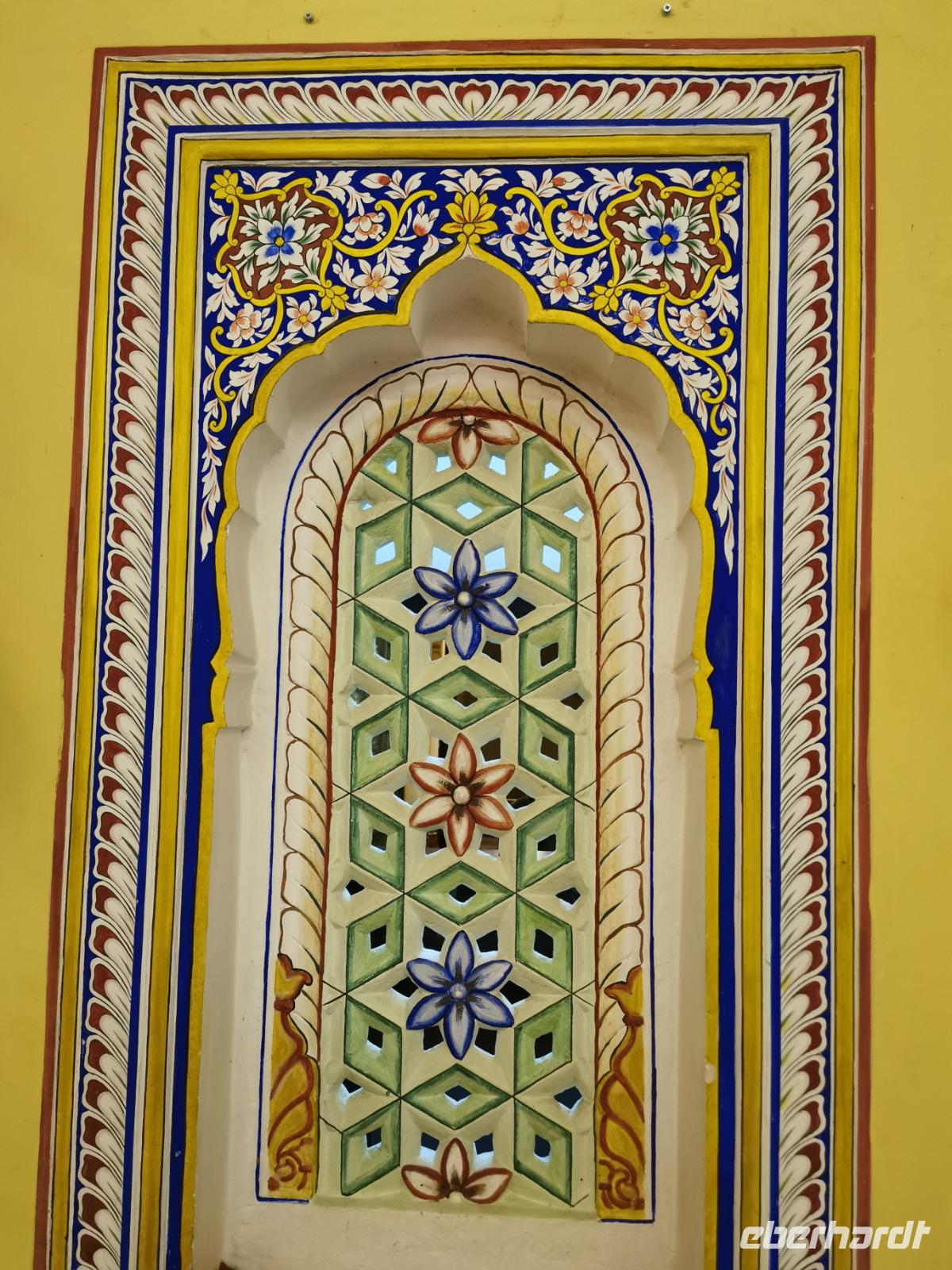 Auf nach der Regenzeit unglaublich holprigen Pisten ging es weiter in die Shekhawati-Region, die besonders durch ihre noch erhaltenen Havelihäuser bekannt ist. Diese wunderschönen mit Miniaturmalerein verzierten Häuser schmücken ganze Straßenzüge und die Innenhöfe lassen die Herzen von uns Europäern höher schlagen. So waren dann auch alle begeistert, daß wir die heutige Nacht und das Abendessen in einem historischen Haveli verbringen durften, welches liebevoll zu einem Hotel umgestaltet worden war.