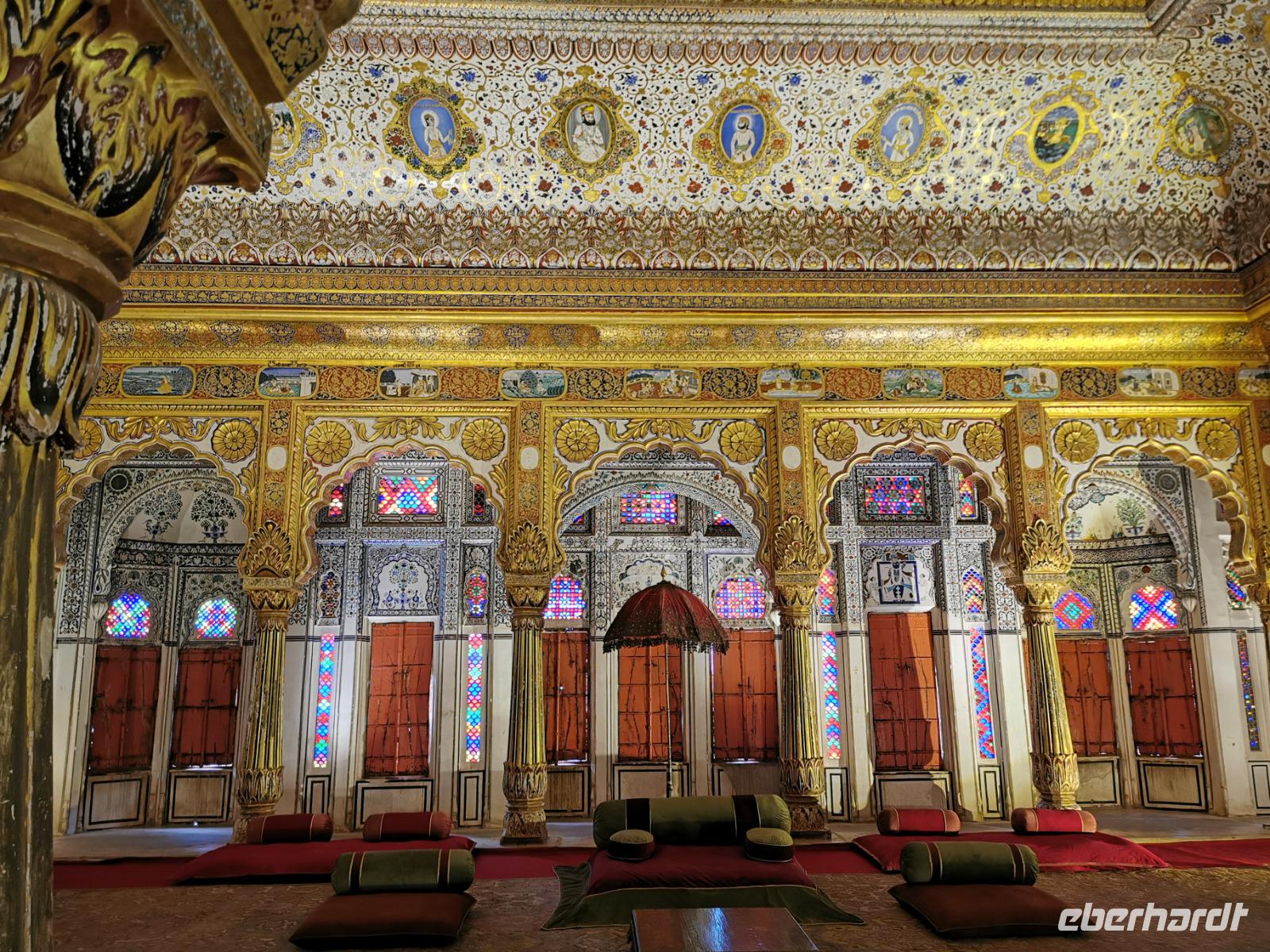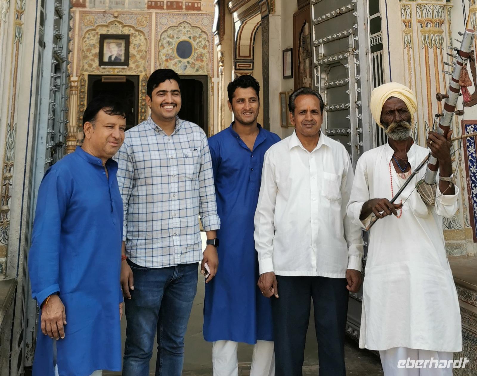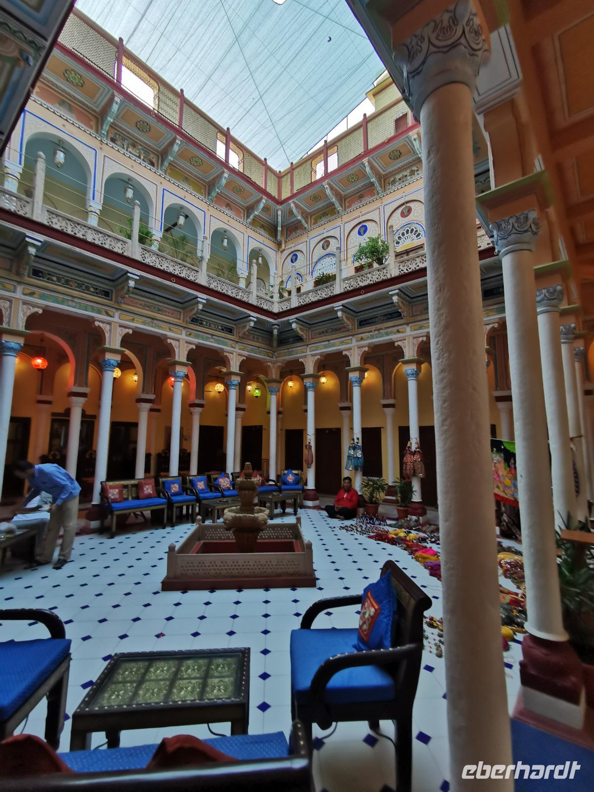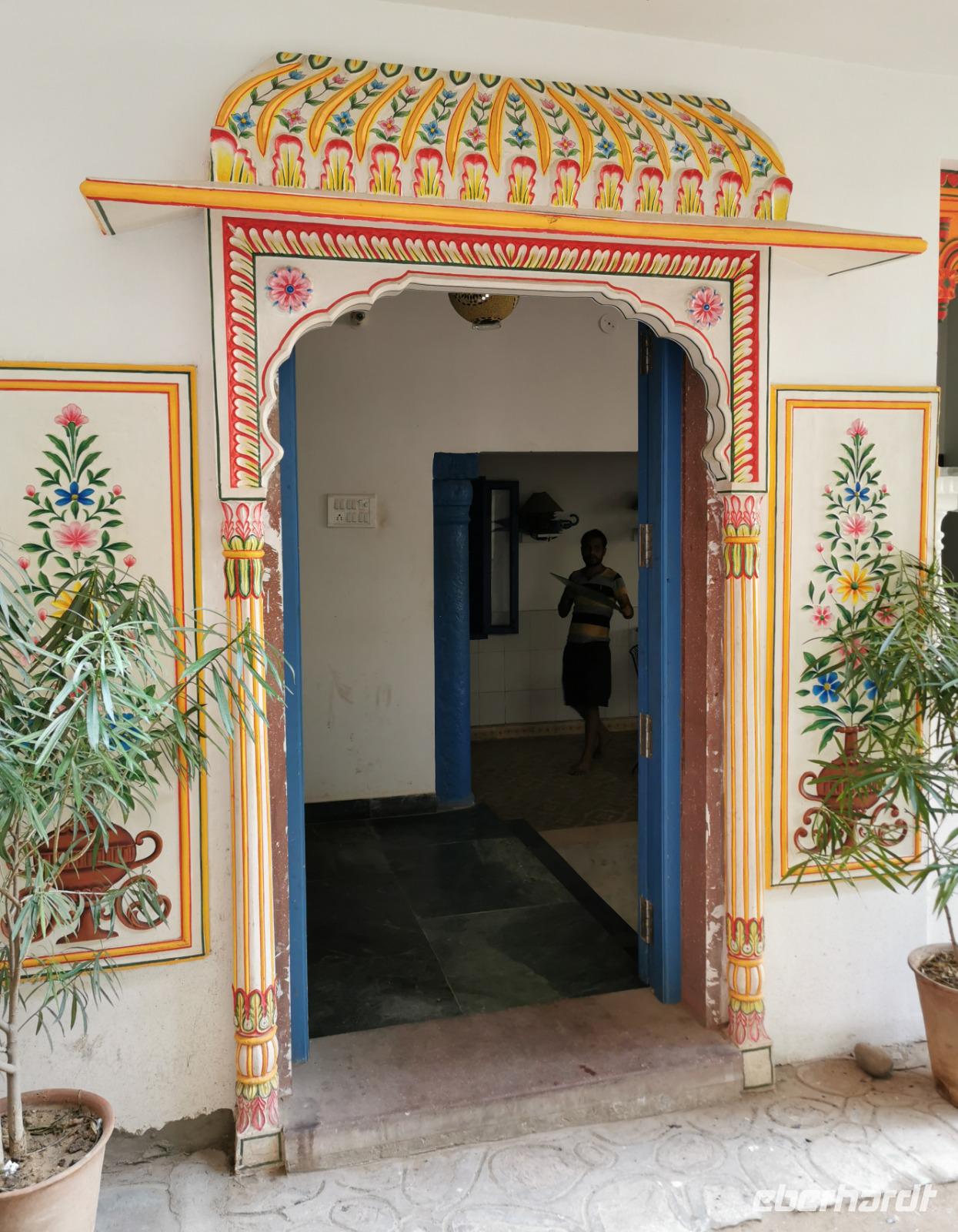 Auf nach der Regenzeit unglaublich holprigen Pisten ging es weiter in die Shekhawati-Region, die besonders durch ihre noch erhaltenen Havelihäuser bekannt ist. Diese wunderschönen mit Miniaturmalerein verzierten Häuser schmücken ganze Straßenzüge und die Innenhöfe lassen die Herzen von uns Europäern höher schlagen. So waren dann auch alle begeistert, daß wir die heutige Nacht und das Abendessen in einem historischen Haveli verbringen durften, welches liebevoll zu einem Hotel umgestaltet worden war.