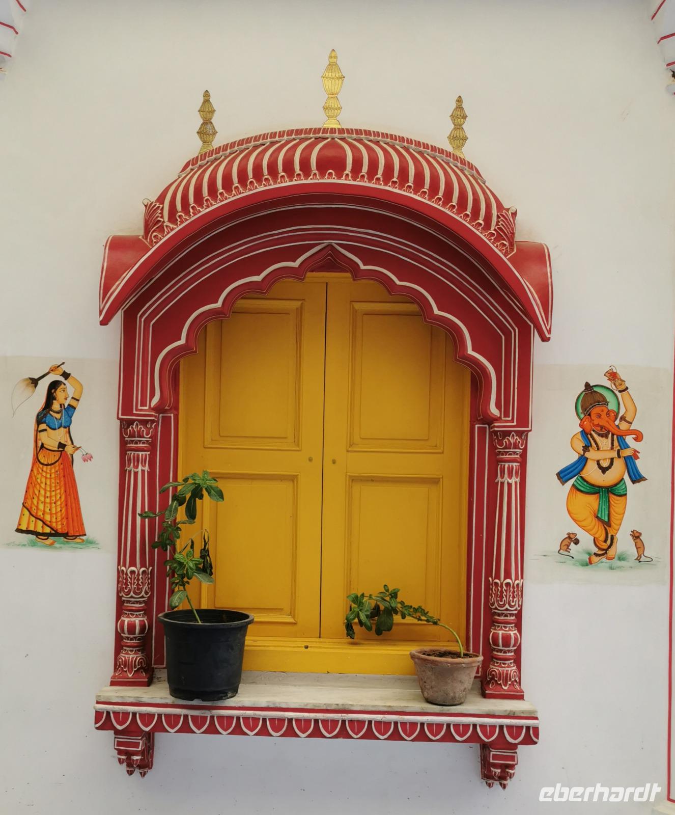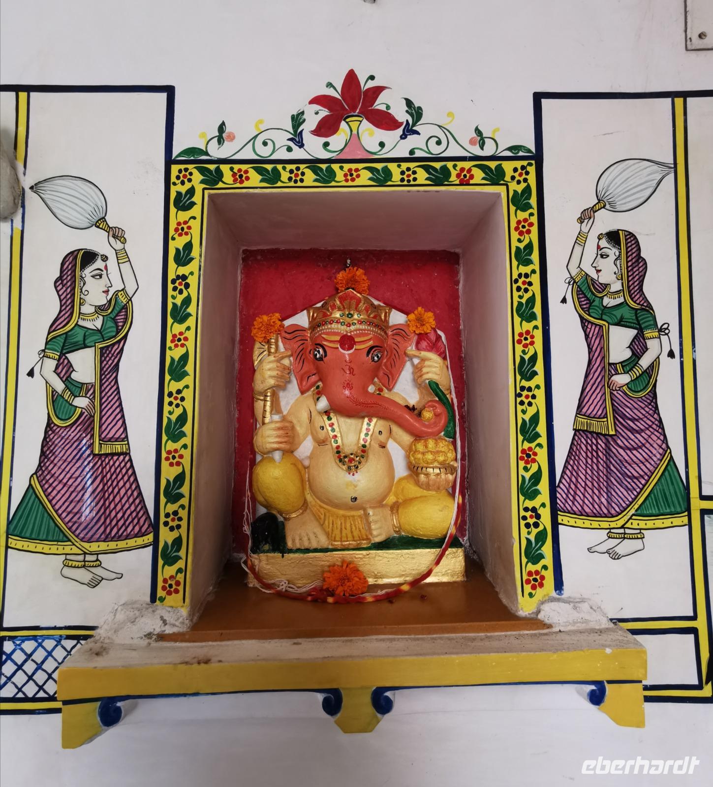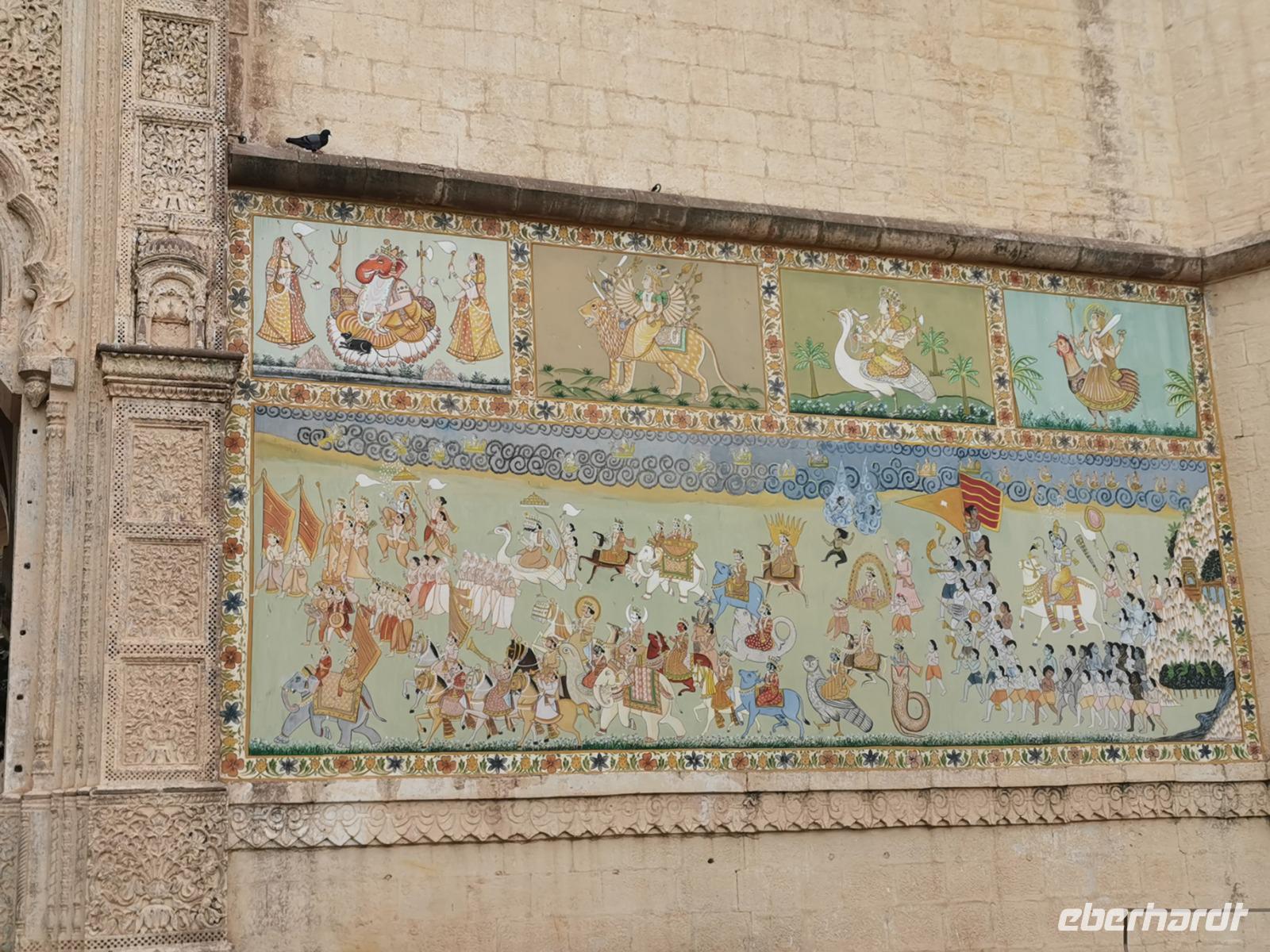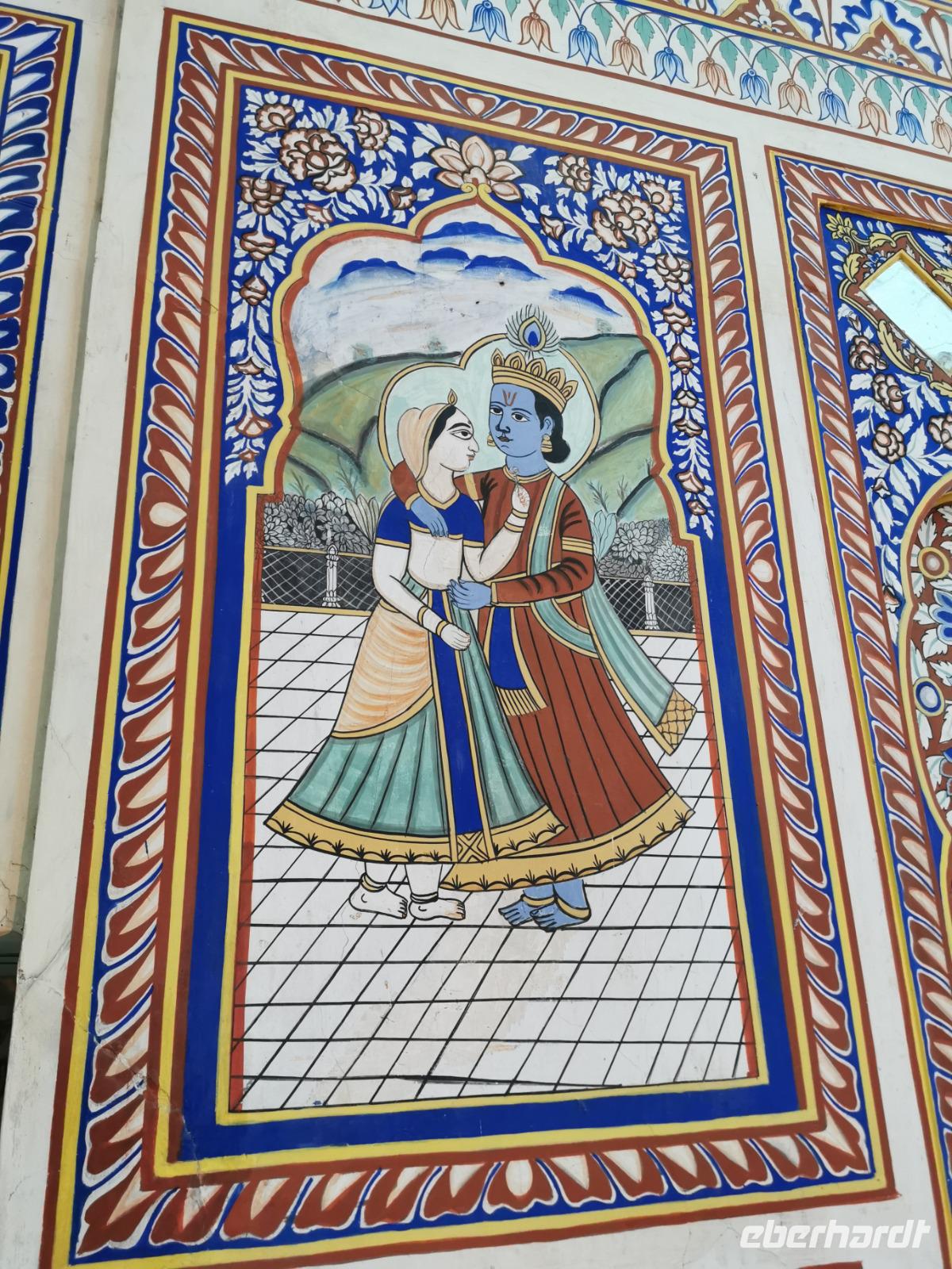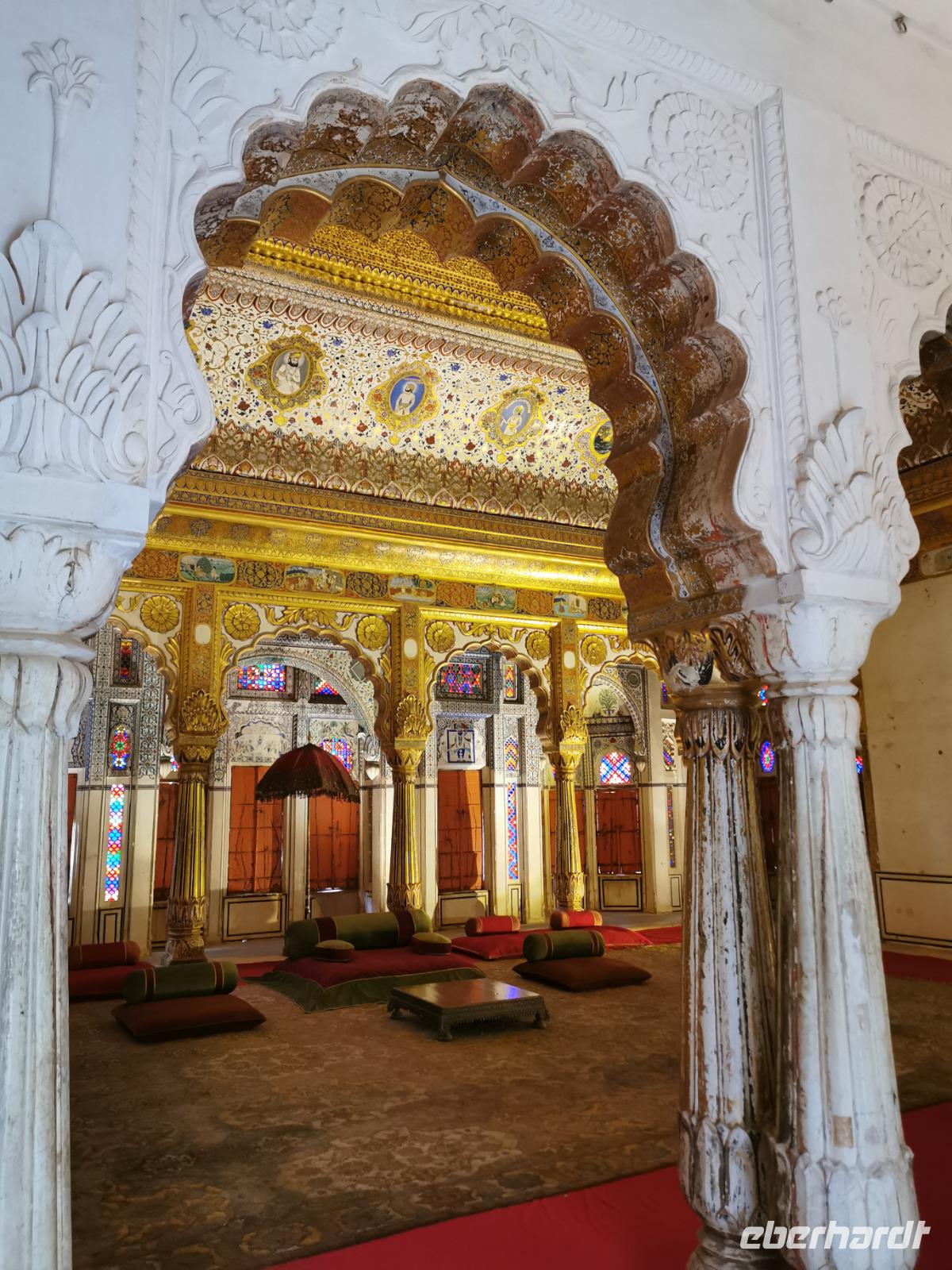 Auf nach der Regenzeit unglaublich holprigen Pisten ging es weiter in die Shekhawati-Region, die besonders durch ihre noch erhaltenen Havelihäuser bekannt ist. Diese wunderschönen mit Miniaturmalerein verzierten Häuser schmücken ganze Straßenzüge und die Innenhöfe lassen die Herzen von uns Europäern höher schlagen. So waren dann auch alle begeistert, daß wir die heutige Nacht und das Abendessen in einem historischen Haveli verbringen durften, welches liebevoll zu einem Hotel umgestaltet worden war.