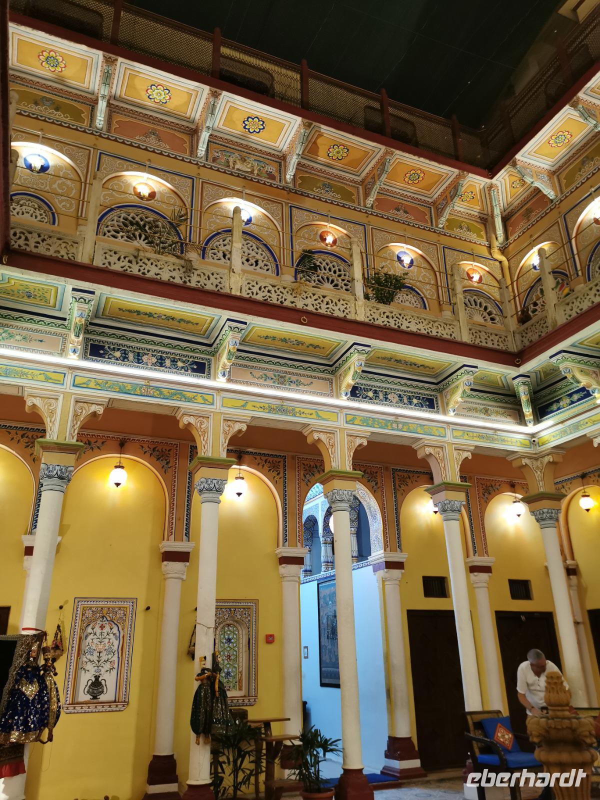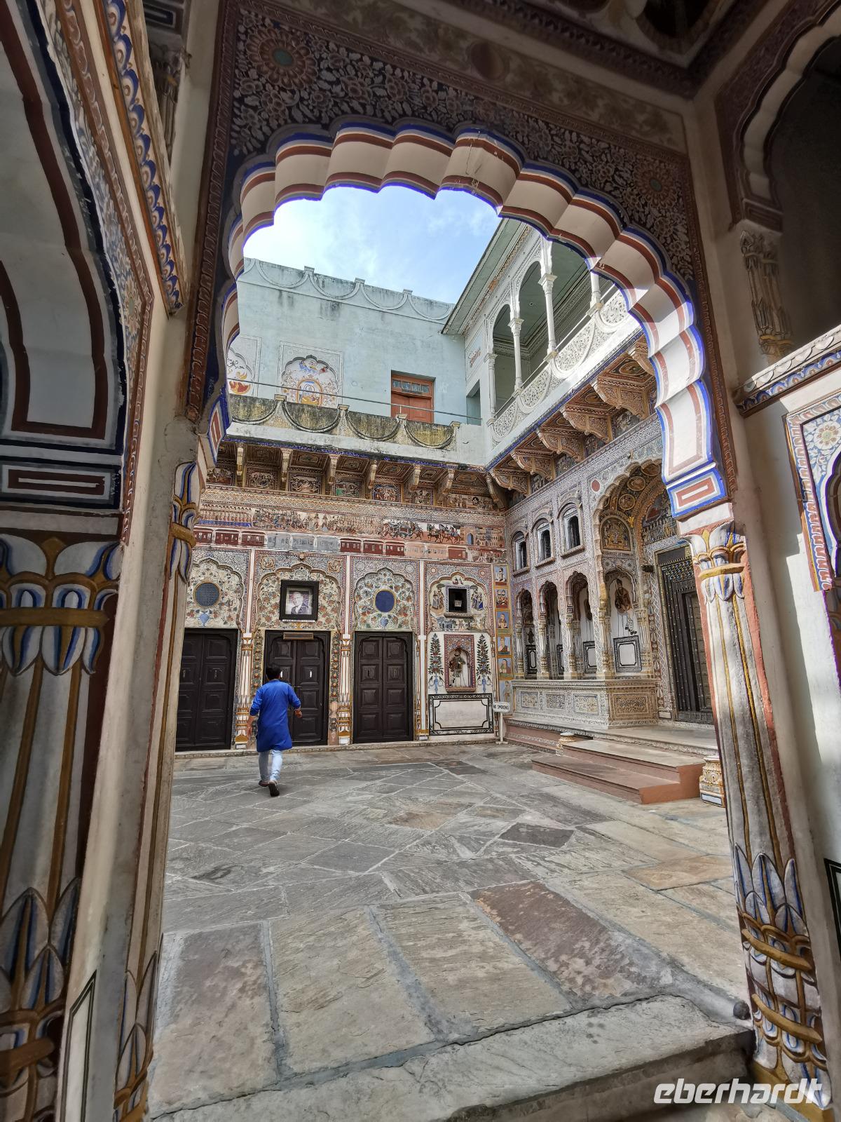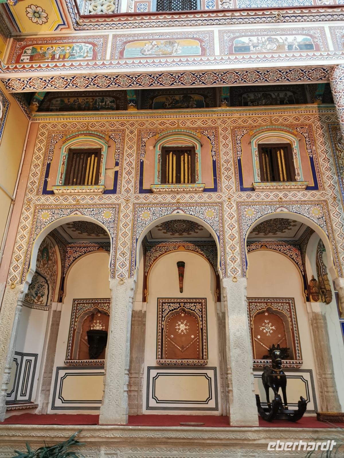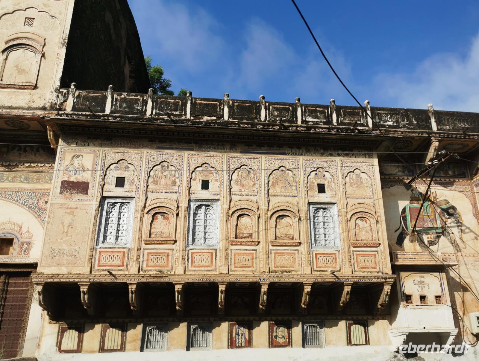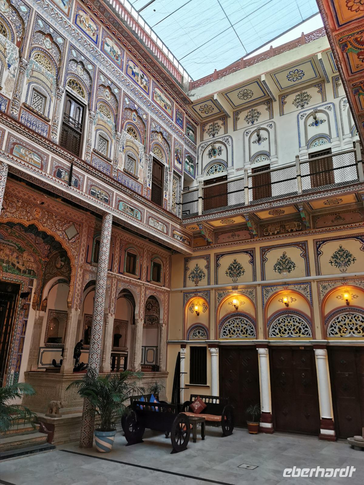 Das Wort Haveli stammt aus der arabischen Sprache und bedeutet so viel wie "umbauter Platz". Für uns Europäer zählen diese Bauten zu den kulturhistorisch bedeutsamsten und schönsten Sehenswürdigkeiten Indiens. Errichtet wurden sie zumeist zwischen 1830 und 1930. Durch eine über und über mit Schnitzereien verzierte riesige Holztür, die von einem bemalten Portal umgeben ist, gelangt man in den ersten Hof. Dieser war in früheren Zeiten den Männern des Hauses vorbehalten und man empfing hier Besucher. Dahinter liegen weitere mit hinduistischen Götterdarstellungen bemalte Höfe, die Frauengemächer, und etliche kleine Räume, die früher als Küche oder Schlafräume dienten.