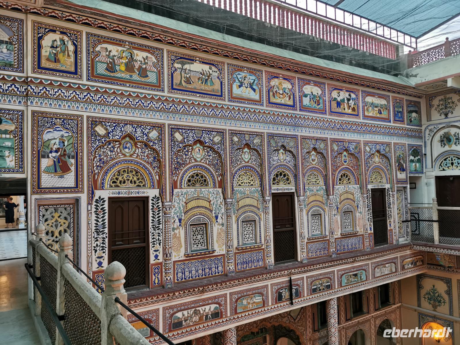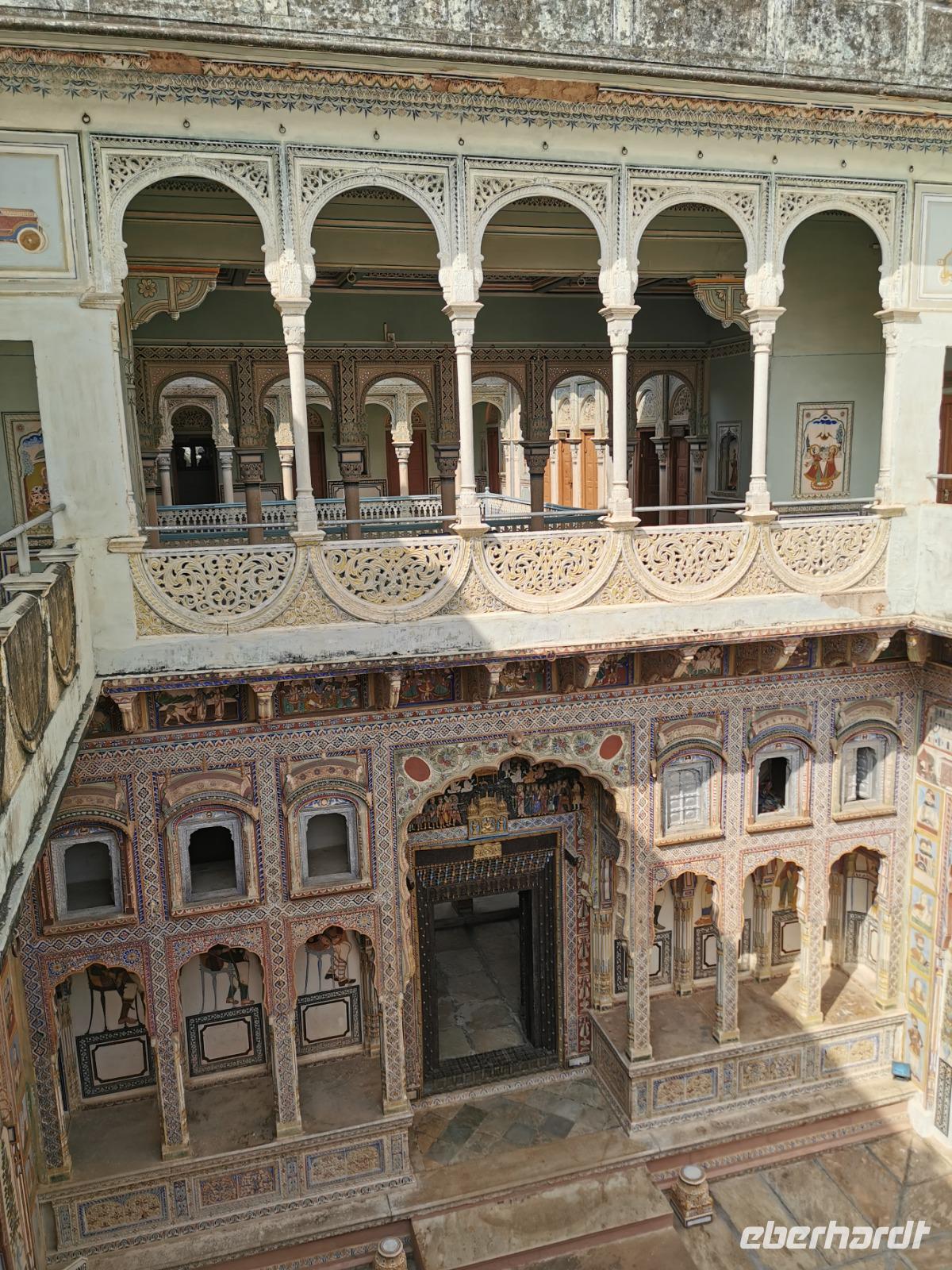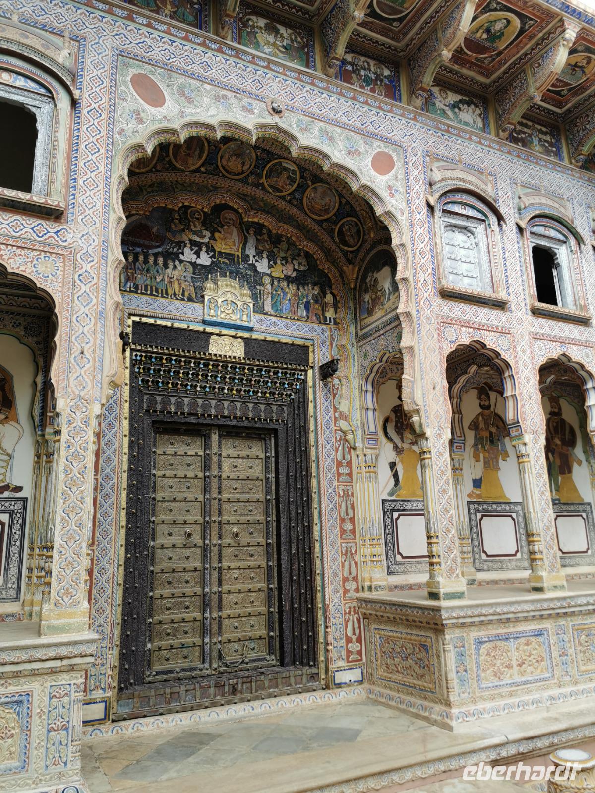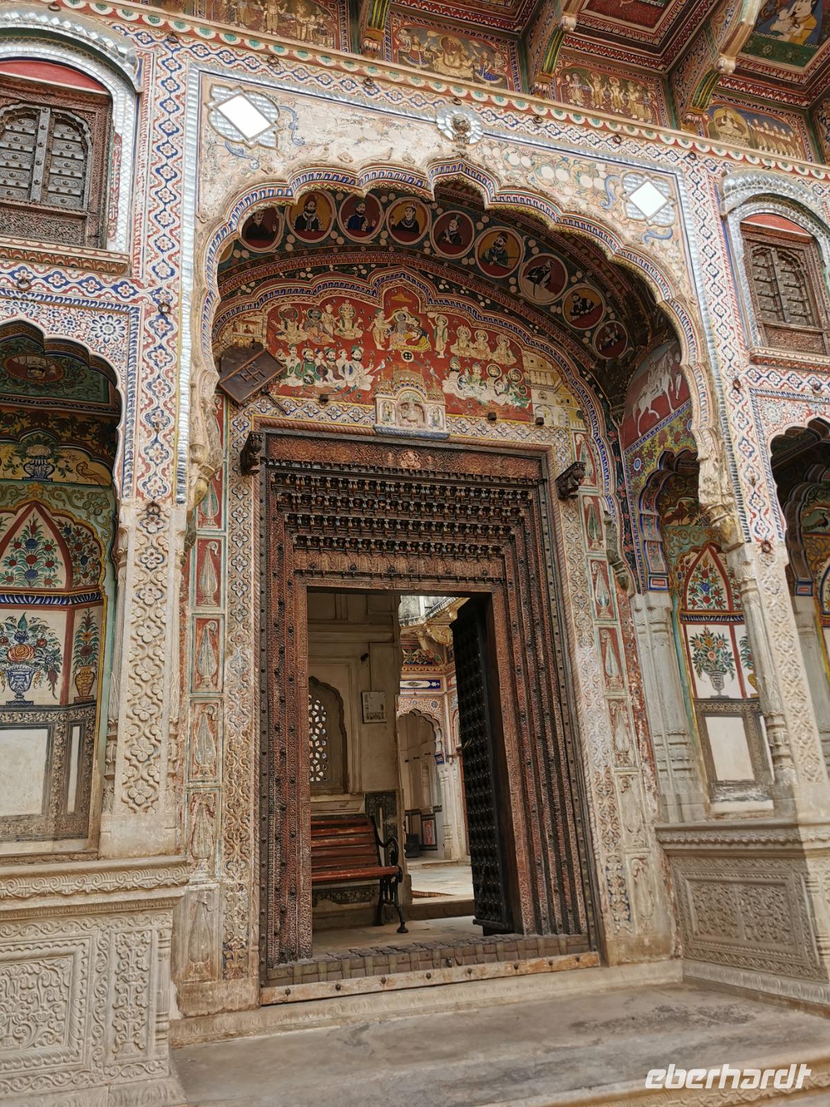 Das Wort Haveli stammt aus der arabischen Sprache und bedeutet so viel wie "umbauter Platz". Für uns Europäer zählen diese Bauten zu den kulturhistorisch bedeutsamsten und schönsten Sehenswürdigkeiten Indiens. Errichtet wurden sie zumeist zwischen 1830 und 1930. Durch eine über und über mit Schnitzereien verzierte riesige Holztür, die von einem bemalten Portal umgeben ist, gelangt man in den ersten Hof. Dieser war in früheren Zeiten den Männern des Hauses vorbehalten und man empfing hier Besucher. Dahinter liegen weitere mit hinduistischen Götterdarstellungen bemalte Höfe, die Frauengemächer, und etliche kleine Räume, die früher als Küche oder Schlafräume dienten.
