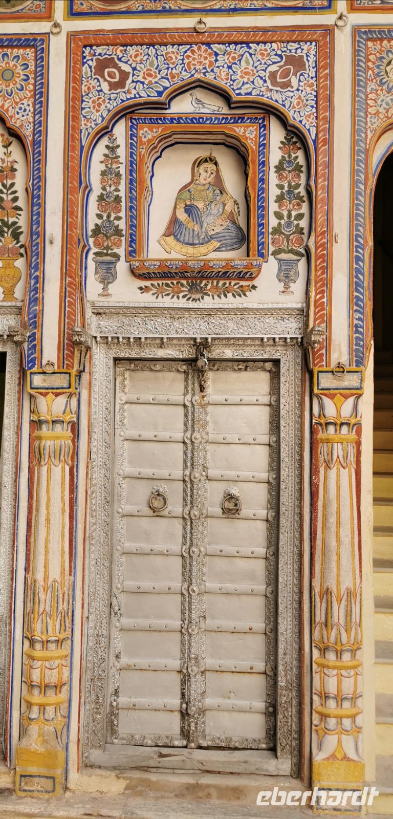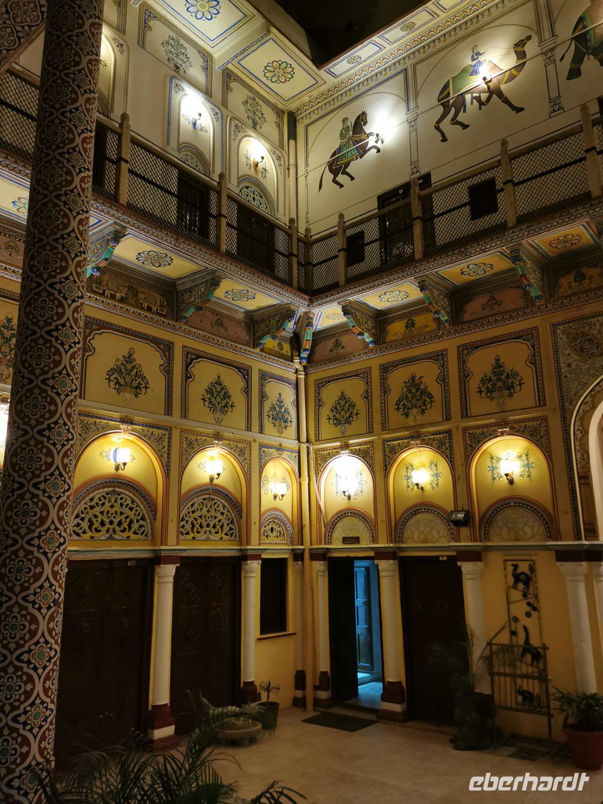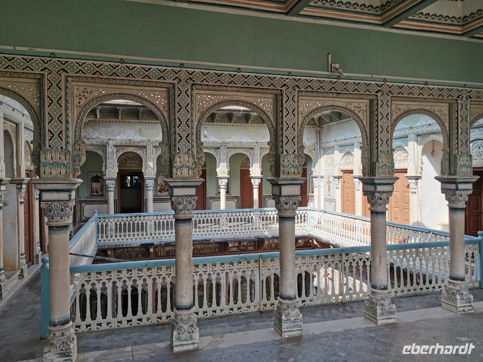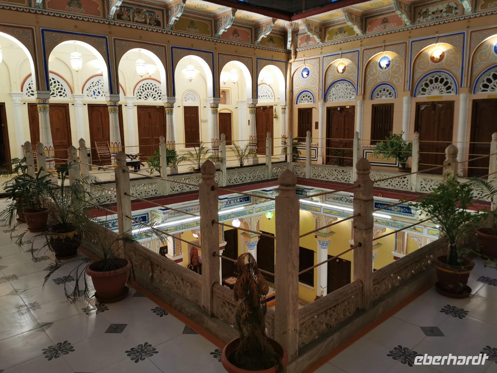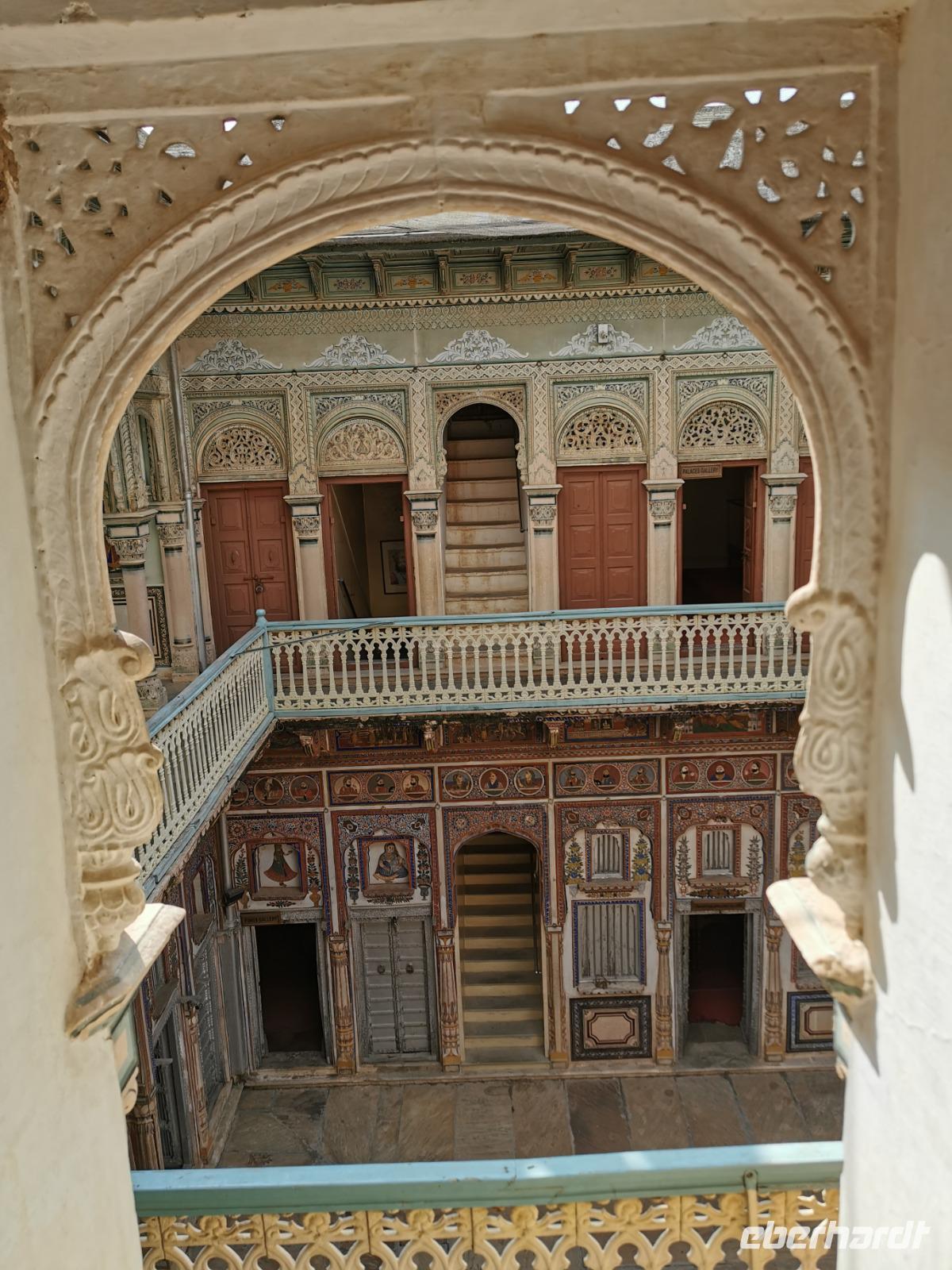 Das Wort Haveli stammt aus der arabischen Sprache und bedeutet so viel wie "umbauter Platz". Für uns Europäer zählen diese Bauten zu den kulturhistorisch bedeutsamsten und schönsten Sehenswürdigkeiten Indiens. Errichtet wurden sie zumeist zwischen 1830 und 1930. Durch eine über und über mit Schnitzereien verzierte riesige Holztür, die von einem bemalten Portal umgeben ist, gelangt man in den ersten Hof. Dieser war in früheren Zeiten den Männern des Hauses vorbehalten und man empfing hier Besucher. Dahinter liegen weitere mit hinduistischen Götterdarstellungen bemalte Höfe, die Frauengemächer, und etliche kleine Räume, die früher als Küche oder Schlafräume dienten.