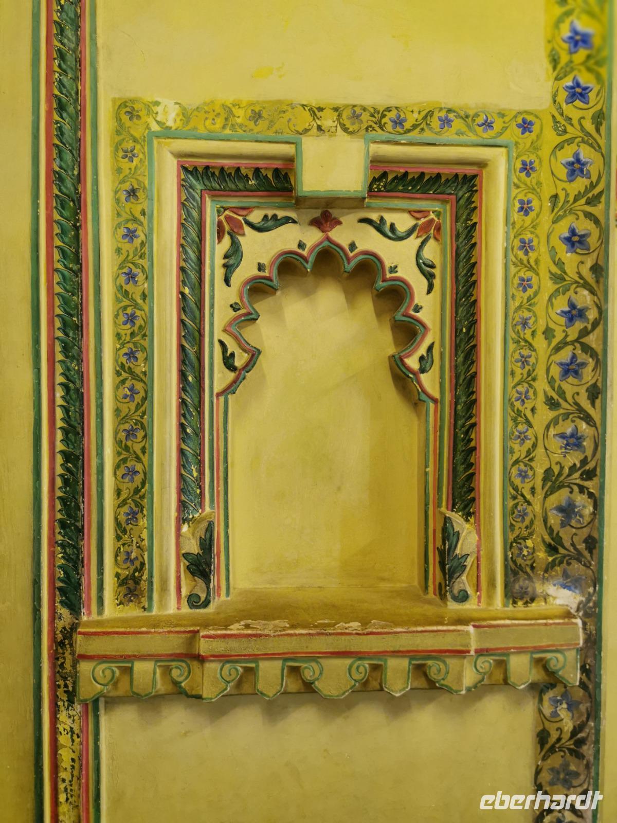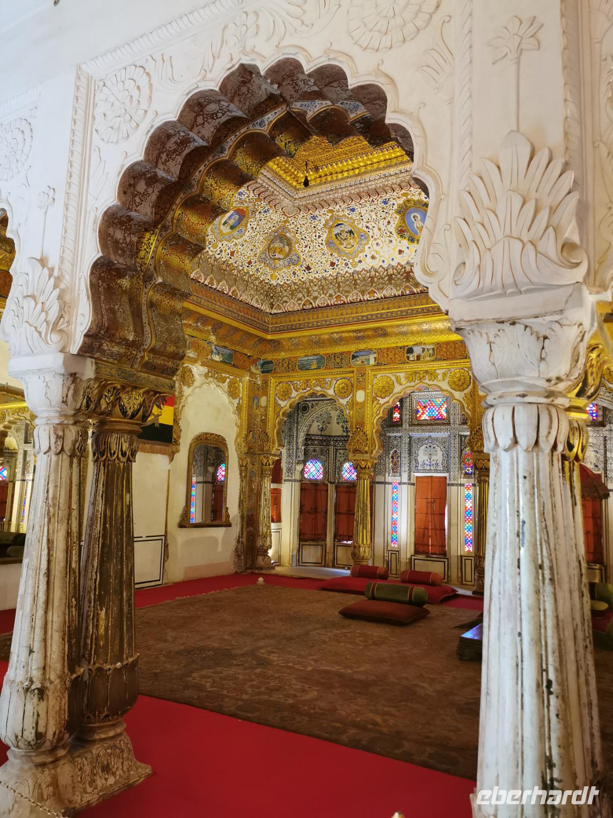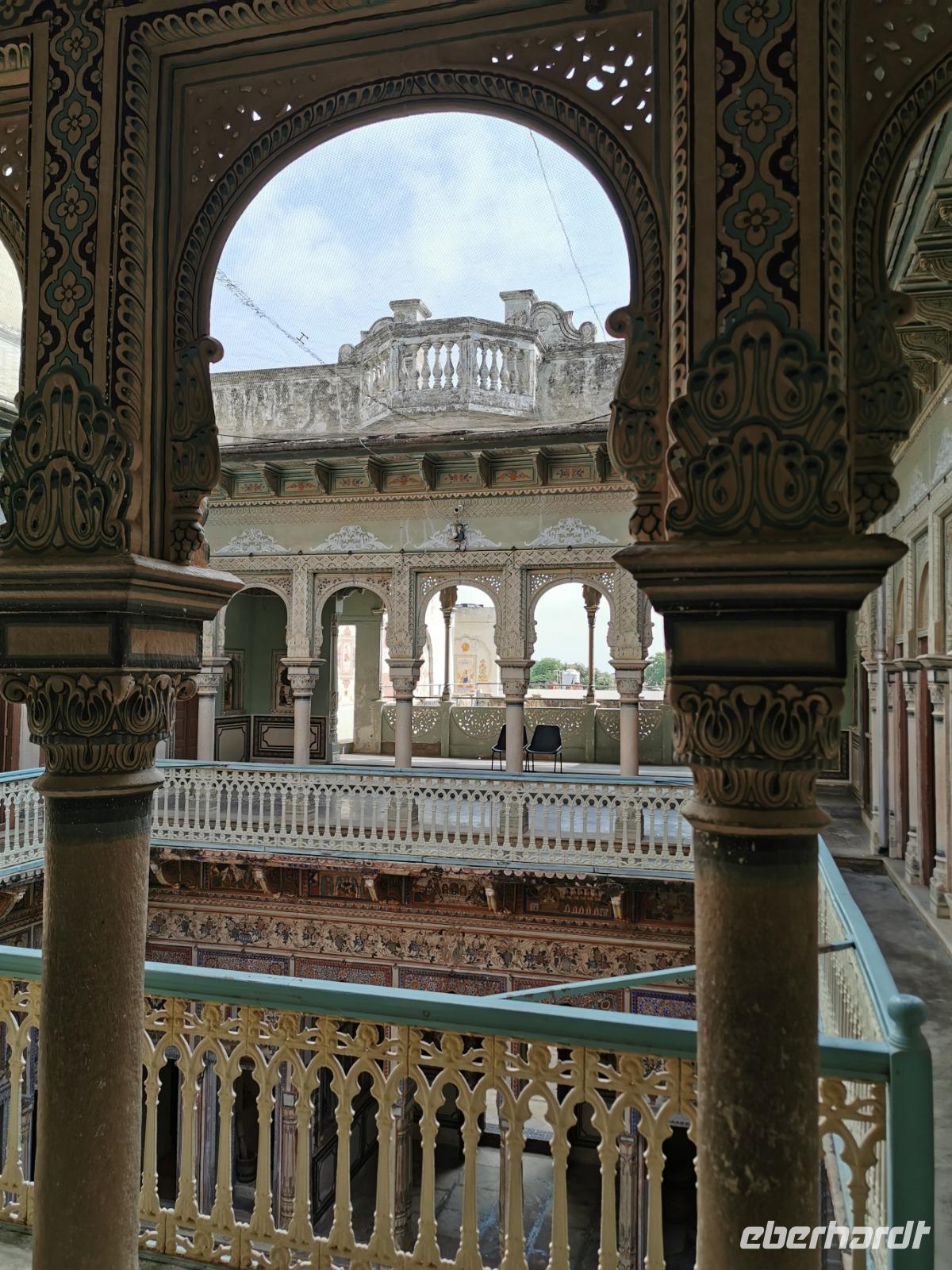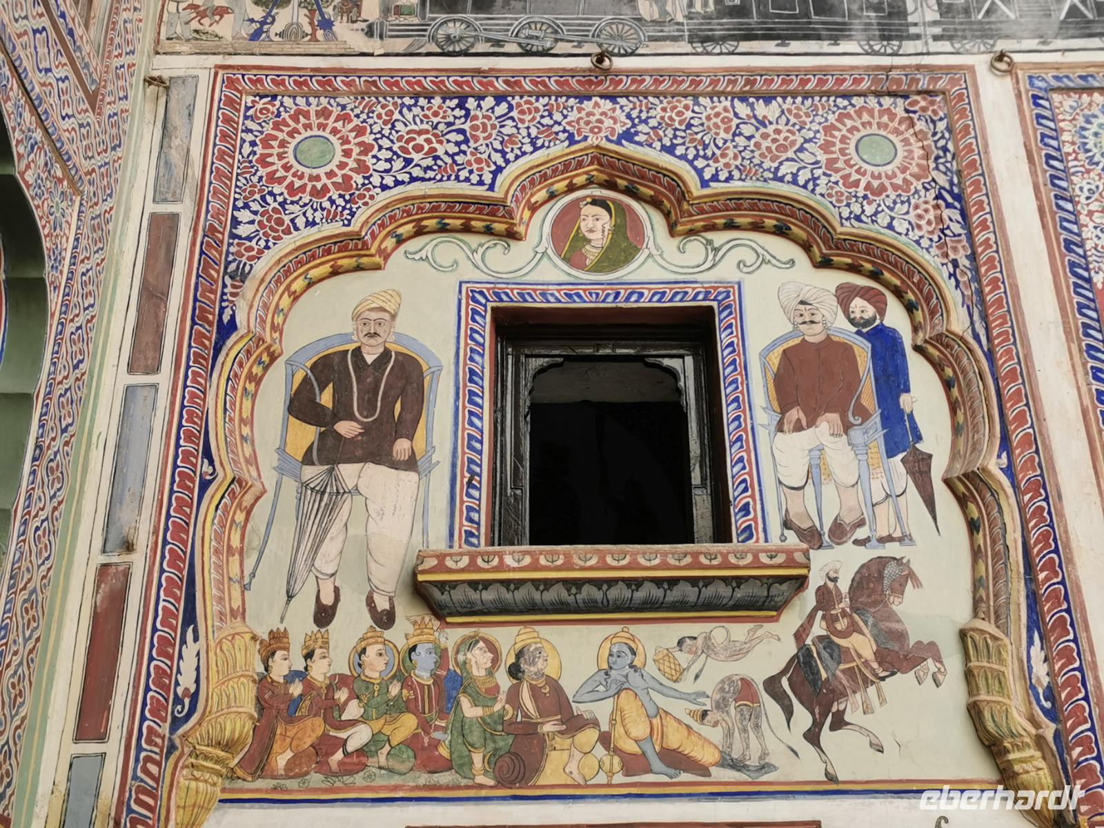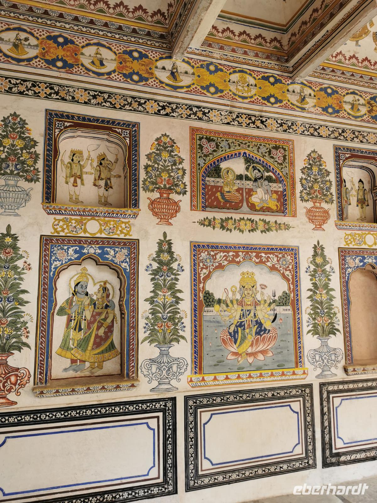 Das Wort Haveli stammt aus der arabischen Sprache und bedeutet so viel wie "umbauter Platz". Für uns Europäer zählen diese Bauten zu den kulturhistorisch bedeutsamsten und schönsten Sehenswürdigkeiten Indiens. Errichtet wurden sie zumeist zwischen 1830 und 1930. Durch eine über und über mit Schnitzereien verzierte riesige Holztür, die von einem bemalten Portal umgeben ist, gelangt man in den ersten Hof. Dieser war in früheren Zeiten den Männern des Hauses vorbehalten und man empfing hier Besucher. Dahinter liegen weitere mit hinduistischen Götterdarstellungen bemalte Höfe, die Frauengemächer, und etliche kleine Räume, die früher als Küche oder Schlafräume dienten.