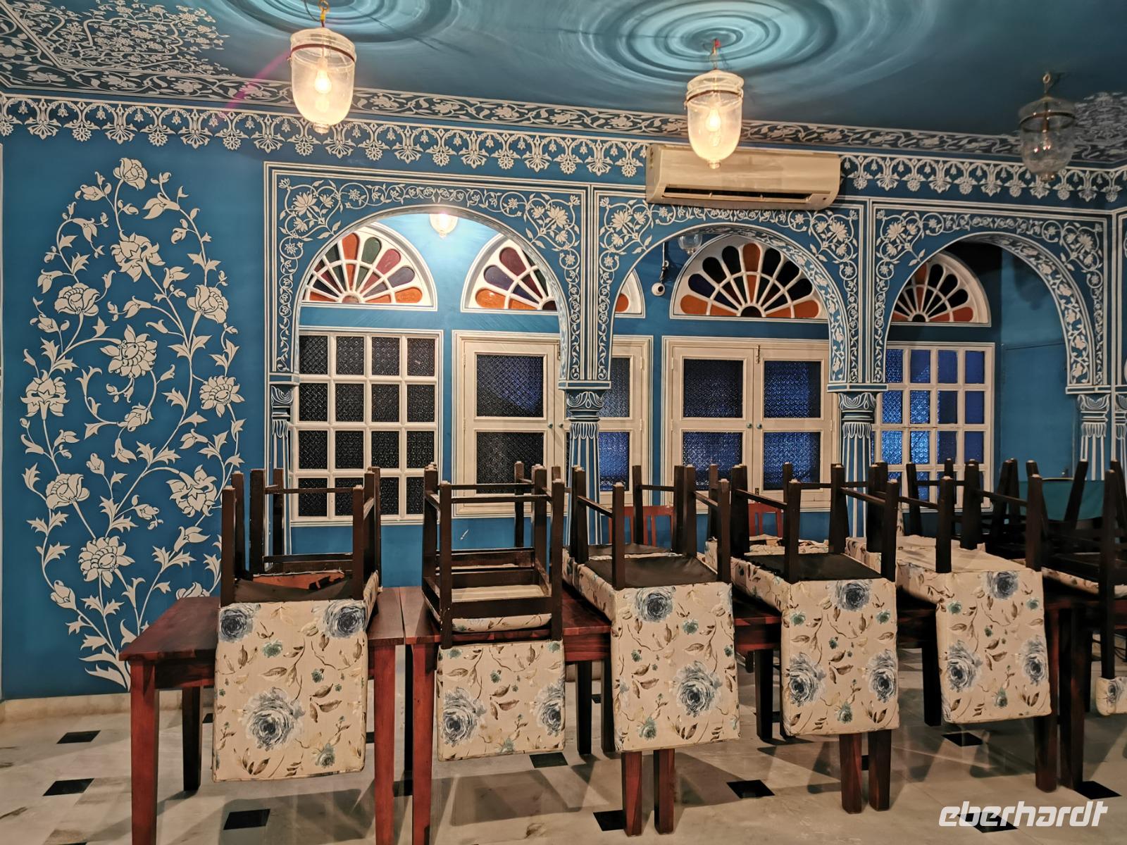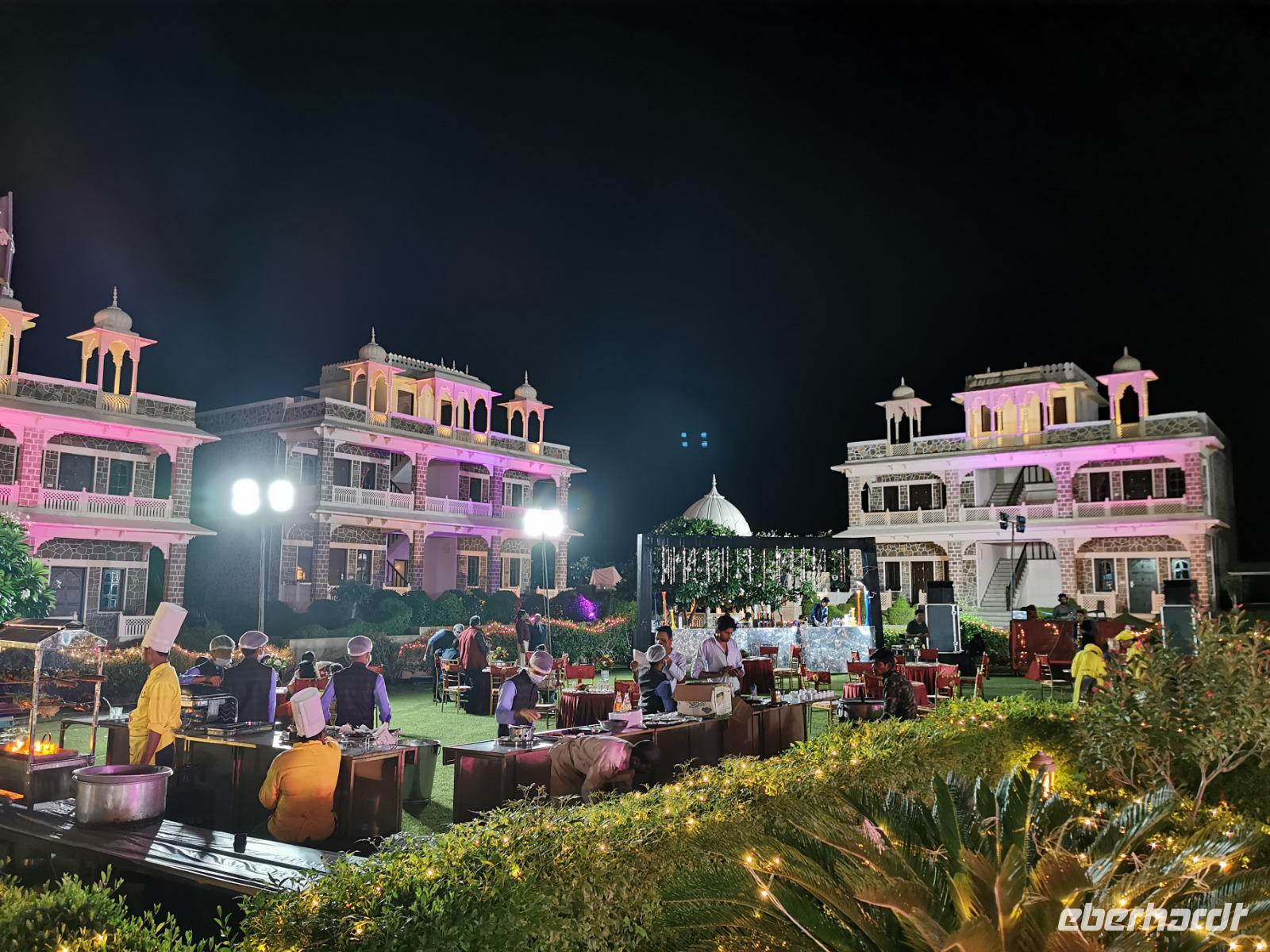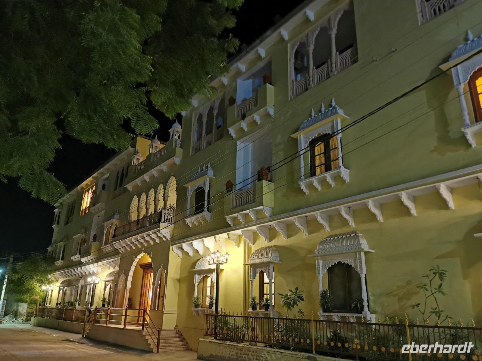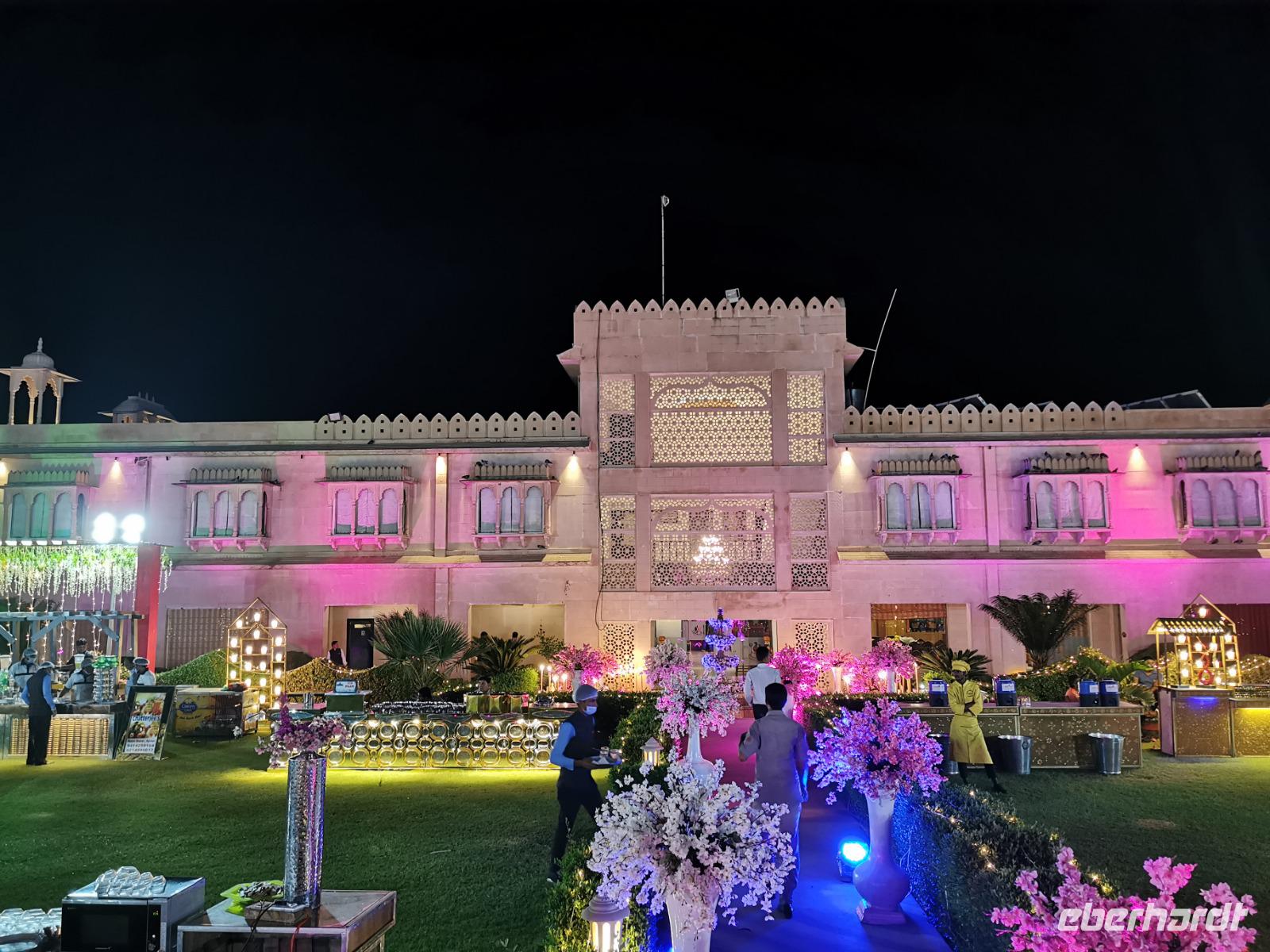 Dabei stellte unser heute zwölf Jahre alt gewordenes Geburtstagskind fest, daß es Hunger hat und so beschlossen wir, ins Hotel zu fahren. Das Bhanwar Singh Palace Hotel gleicht einer Kulisse aus einem Bollywoodfilm, noch dazu hatte sich im hinteren Teil eine Hochzeitsgesellschaft eingemietet, die die Szenerie greller und exotischer erscheinen ließ. In diesem Hotel fühlten wir uns einmal mehr wie die Maharadjas in vergangenen Jahrhunderten.