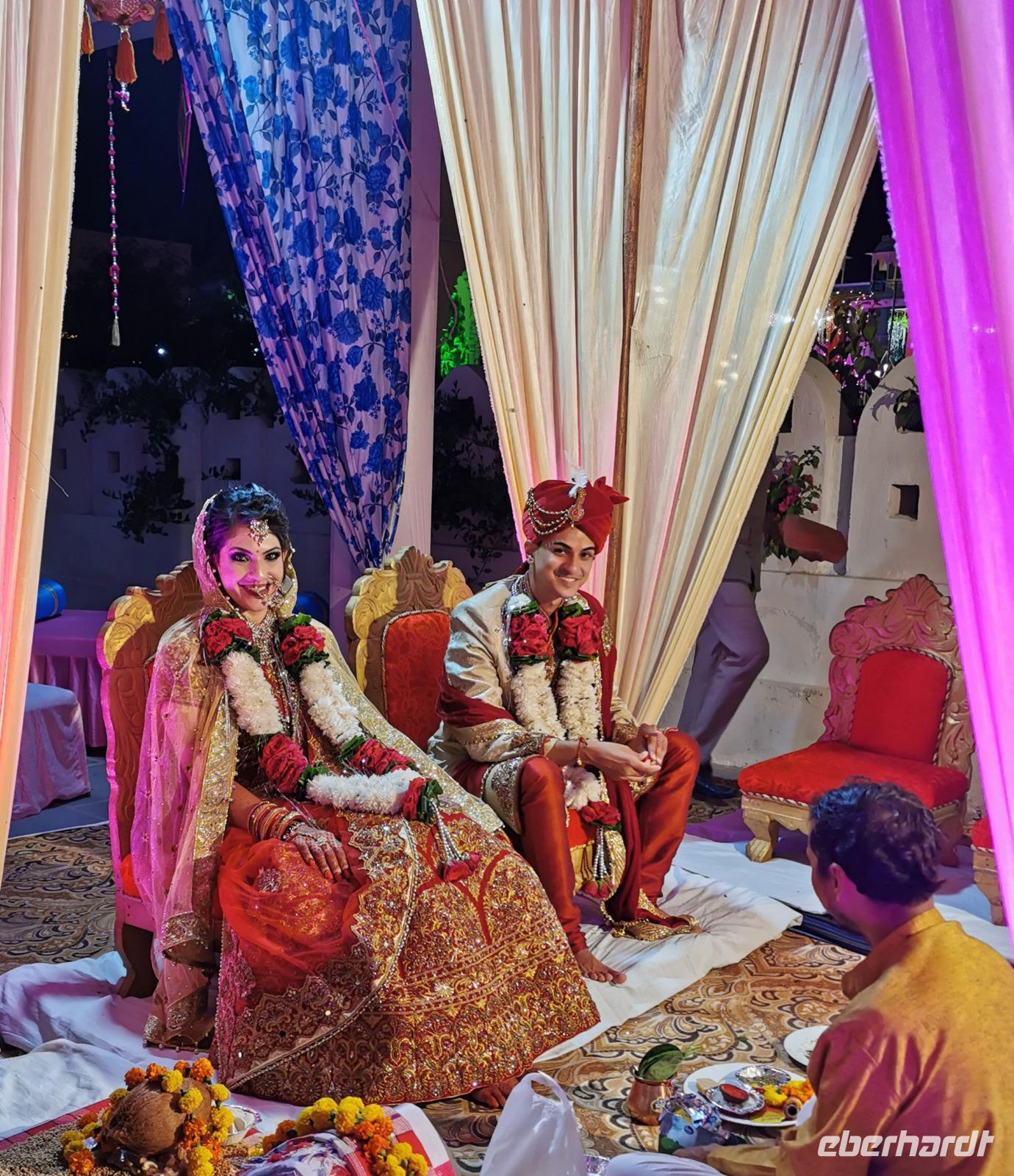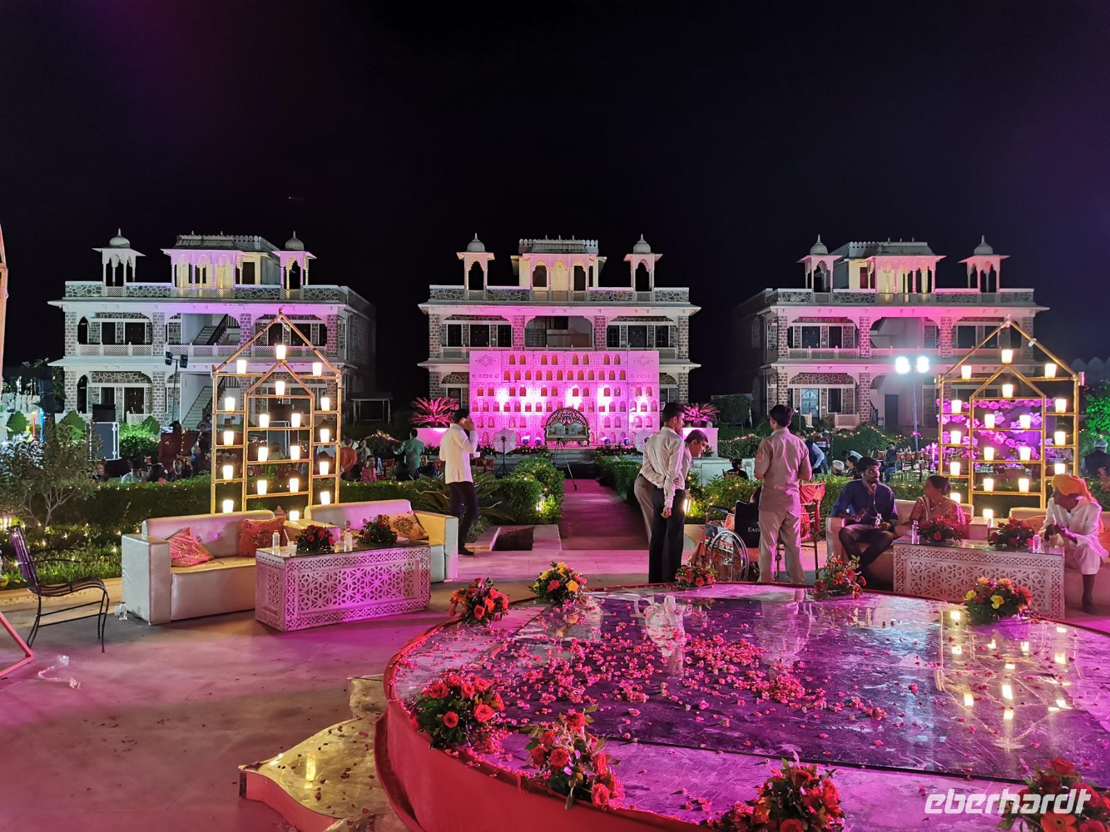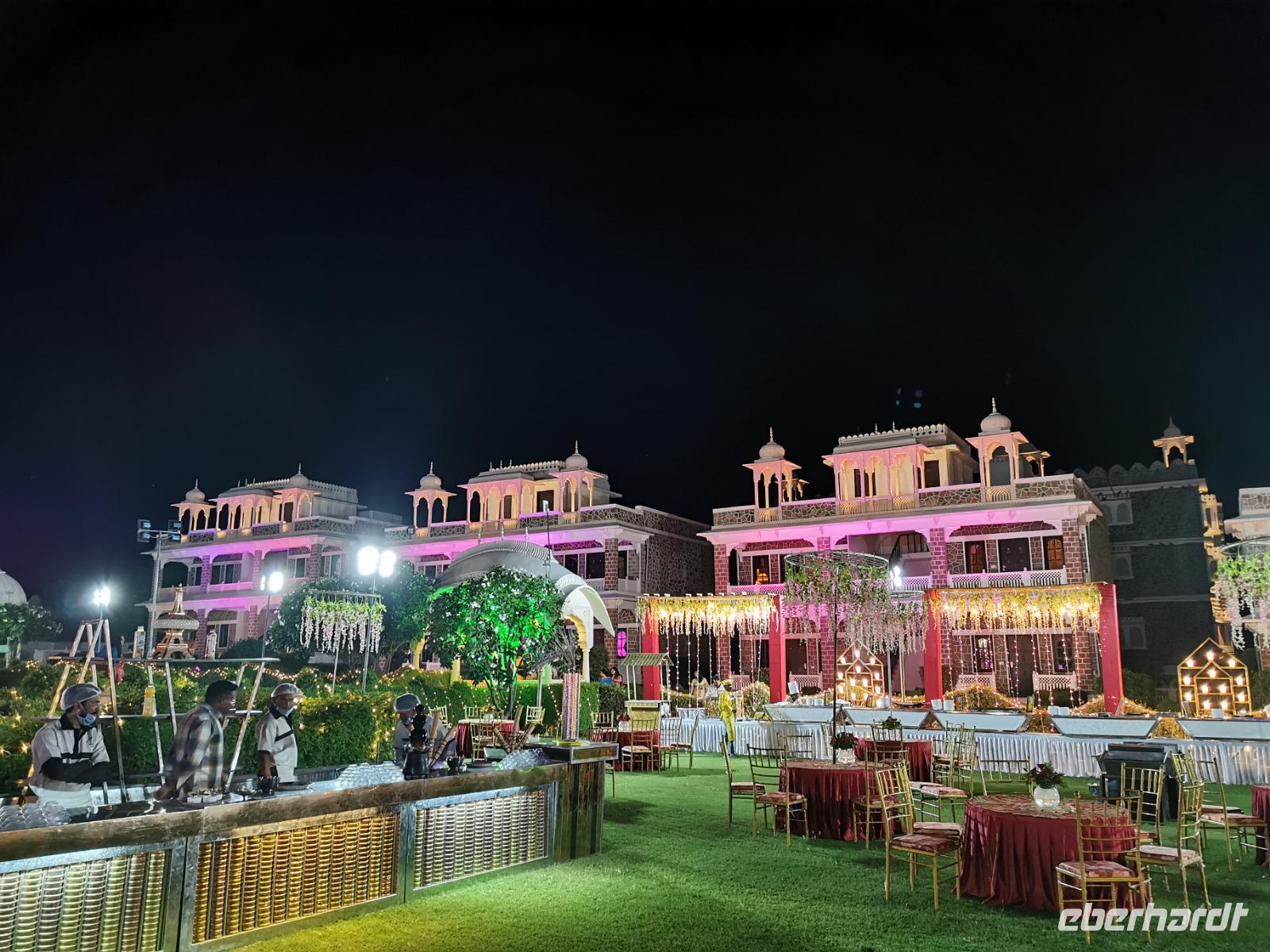 Dabei stellte unser heute zwölf Jahre alt gewordenes Geburtstagskind fest, daß es Hunger hat und so beschlossen wir, ins Hotel zu fahren. Das Bhanwar Singh Palace Hotel gleicht einer Kulisse aus einem Bollywoodfilm, noch dazu hatte sich im hinteren Teil eine Hochzeitsgesellschaft eingemietet, die die Szenerie greller und exotischer erscheinen ließ. In diesem Hotel fühlten wir uns einmal mehr wie die Maharadjas in vergangenen Jahrhunderten.