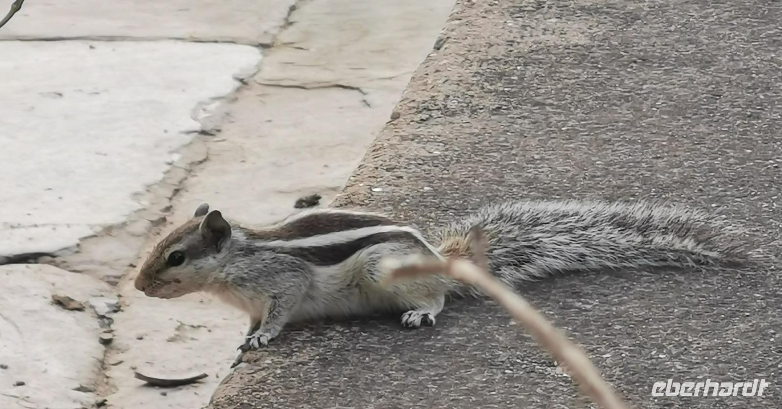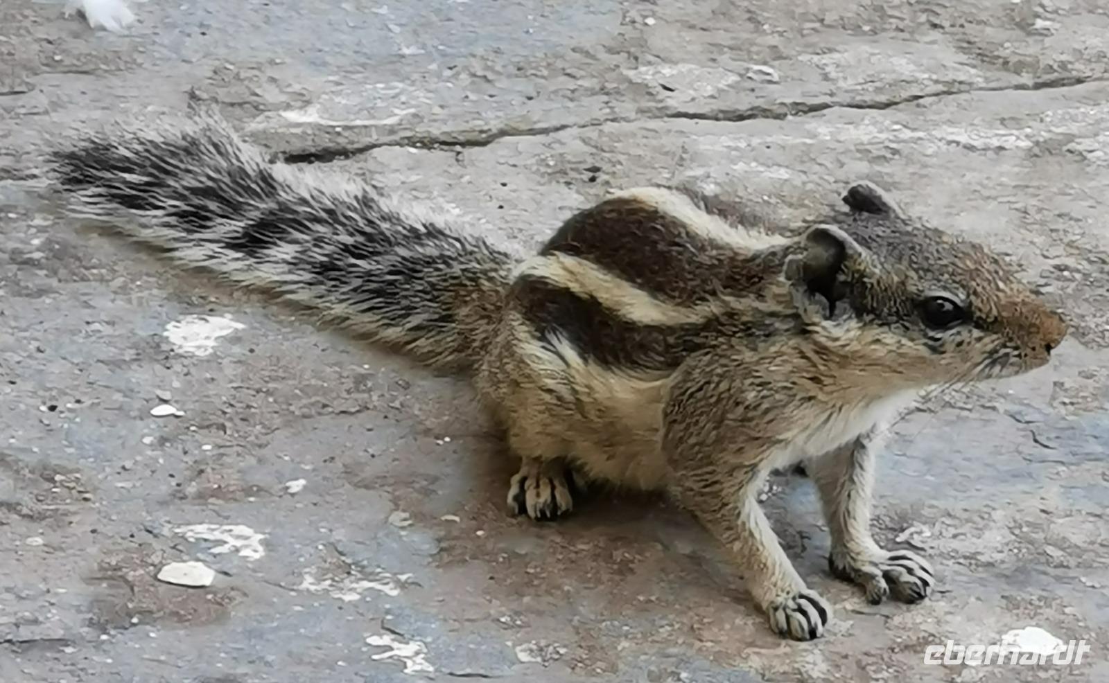 Auf einer kleinen Insel, auf der sich das Lustschloß Jag Mandir befindet, machten wir eine Pause und sahen den frechen Streifenhörnchen zu, wie sie dem Elefantengott Ganesha den geopferten Reis stahlen.