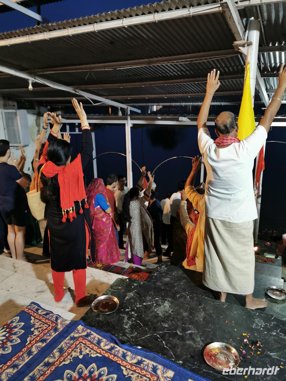 Im Anschluß an dieses schöne Erlebnis durften wir noch einer öffentlichen Puja beiwohnen. Die Hindus beteten gemeinsam am Ufer des Flusses, sprachen Gebete, bekamen ebenfalls die roten Stirnpunkte und am Ende des Gebetes gab es für alle Gläubigen süßen Milchreis, den wir natürlich probieren durften.