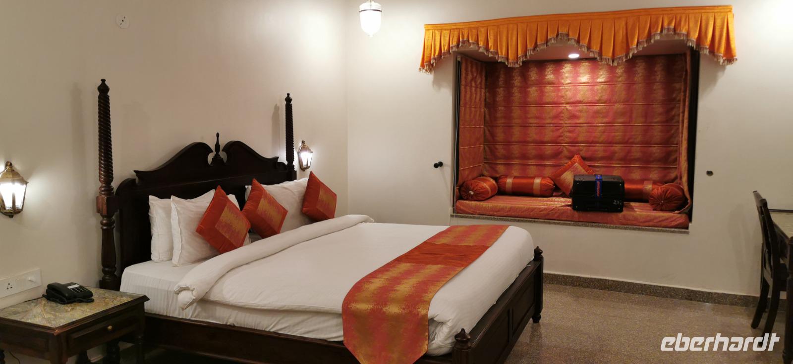 Zur Mittagszeit erreichten wir unser Mount Valley Hotel, welches unweit vom Ranthambore Nationalparkeingang liegt und wurden mit Blumenketten begrüßt. Selbst ein Mittagessen hatte man für uns vorbereitet, so daß wir uns gestärkt zu unserer Safari am frühen Nachmittag aufmachen konnten.