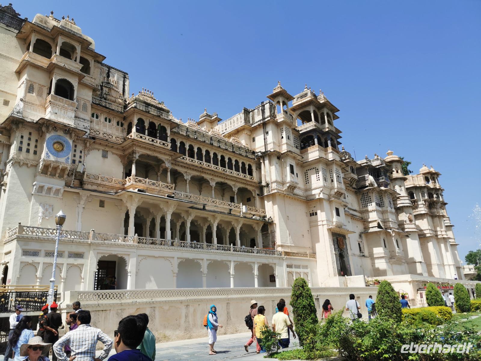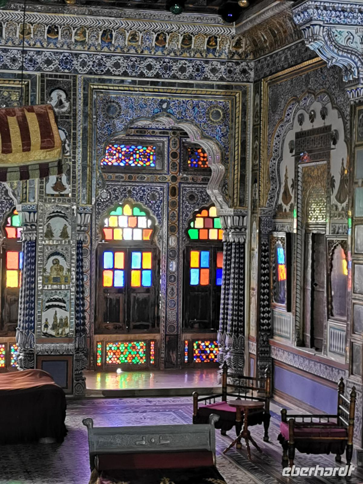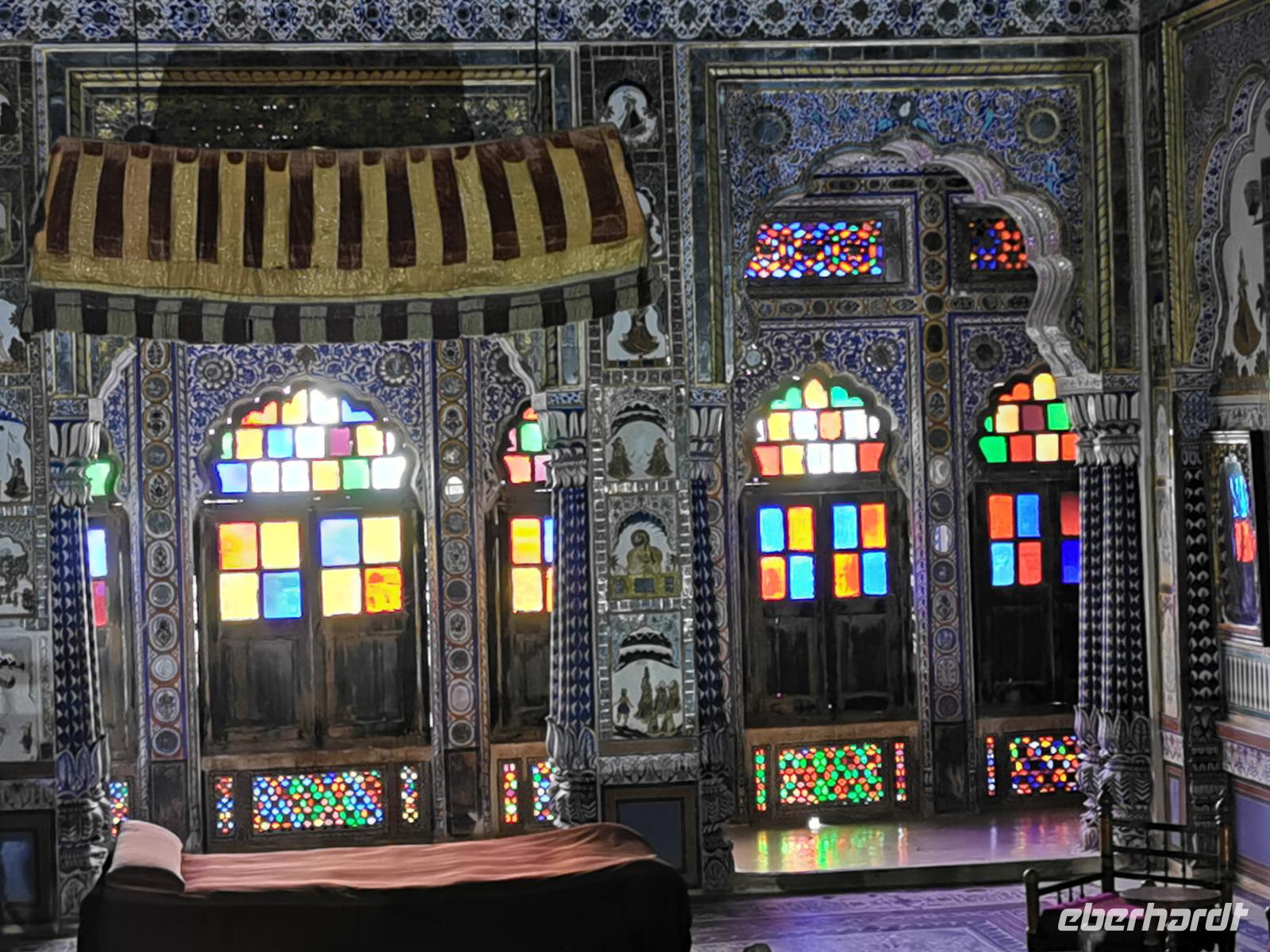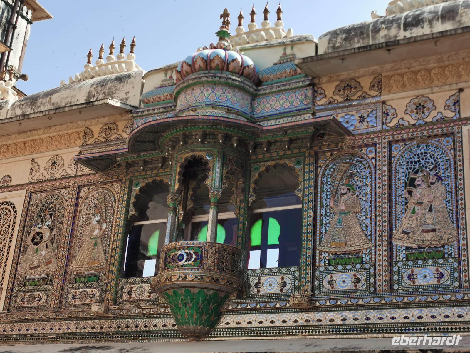 Udaipur, das "Venedig des Ostens" hat einen riesigen Stadtpalast, die ehemalige Residenz des Maharana. Vor über 400 Jahren, genau 1553 wurde dieser Bau von Maharana Udai Singh II. begonnen, immer wieder an- und umgebaut und heute beherbergt er ein riesiges Museum mit Interieur aus der vergangenen Zeit. Wir wandelten zwei Stunden durch die vielen Gemächer mit ihren bunten Wandfarben, sahen verspiegelte Zimmer mit Kuppeln, genossen Ausblicke durch verzierte Fenster auf die schöne Stadt am See und konnten uns gut vorstellen, wie ein Maharana in solch einem Pomp gelebt haben mußte.