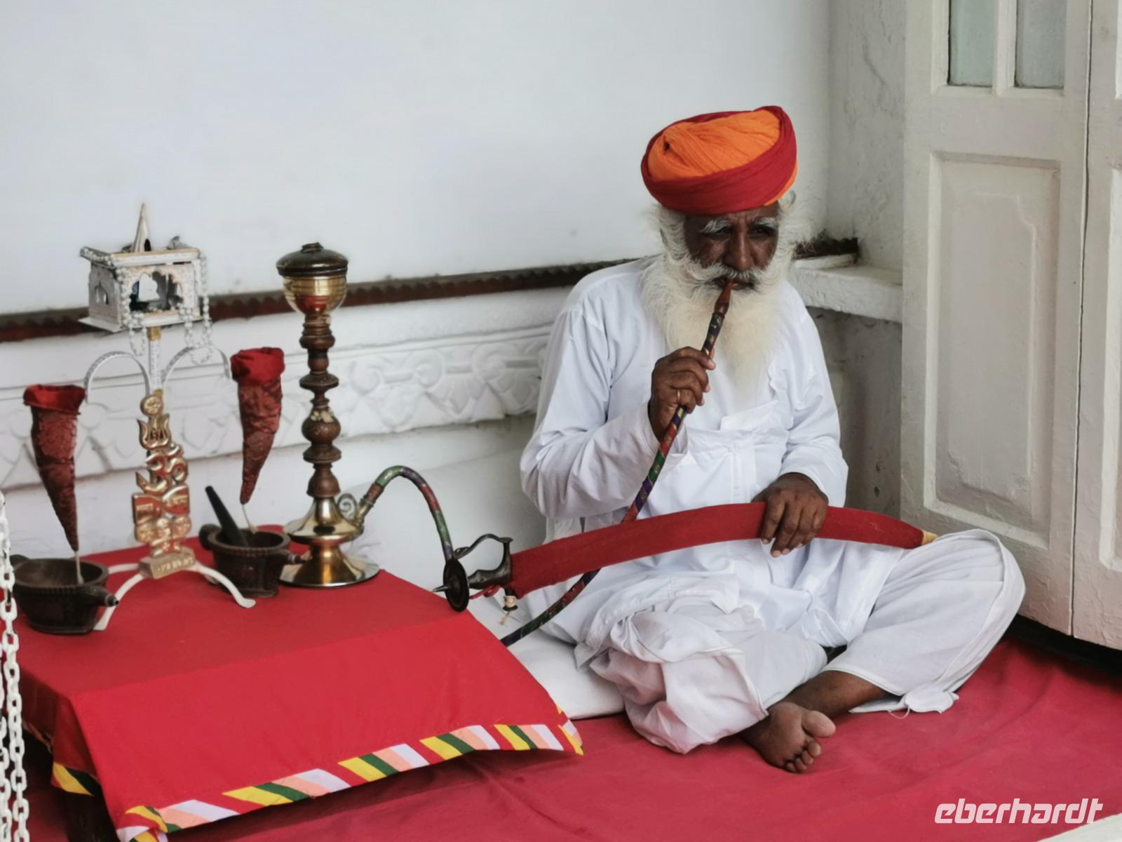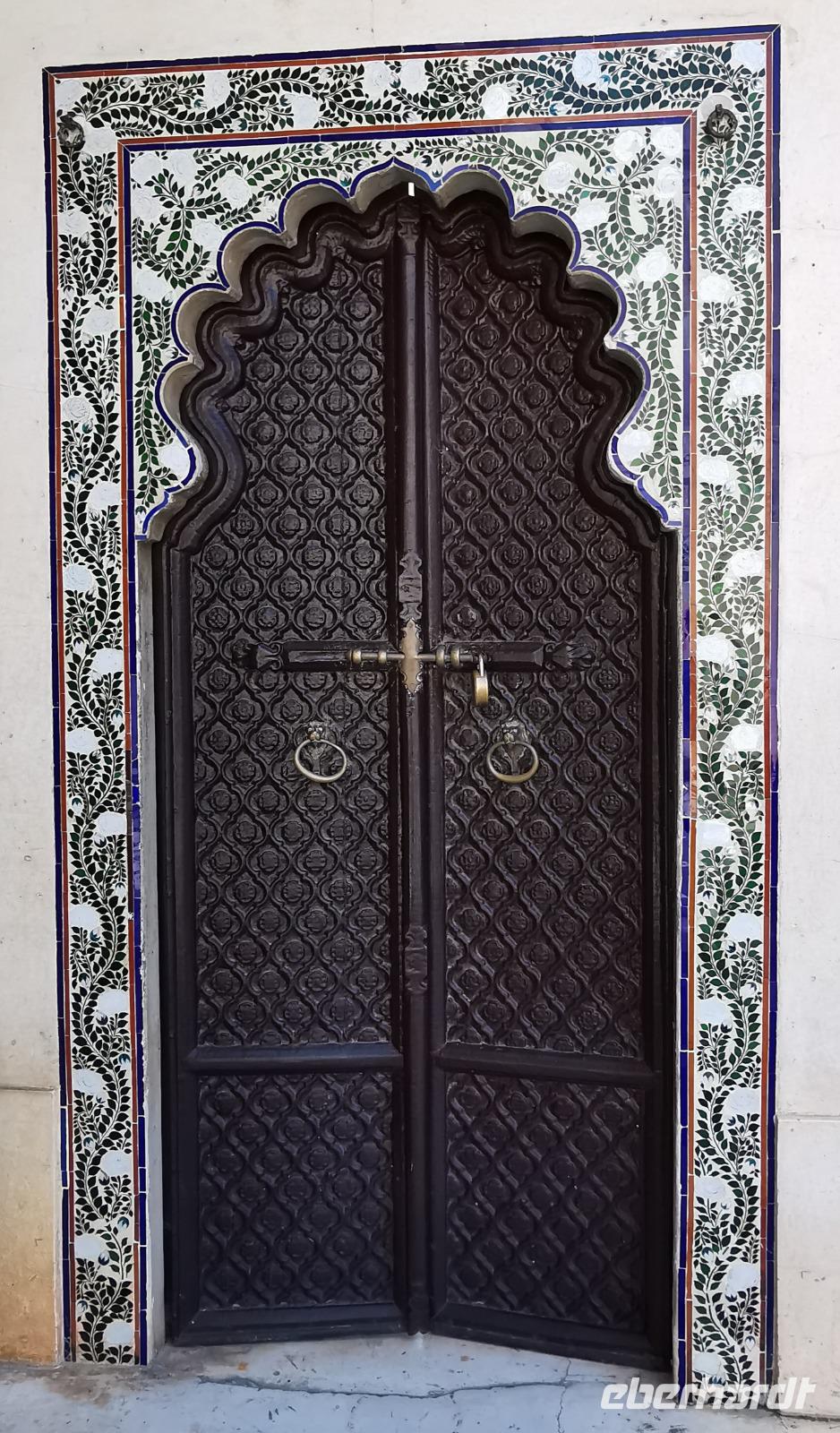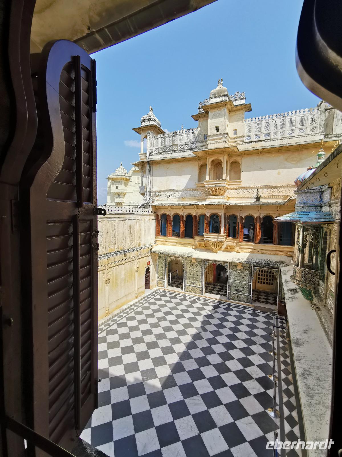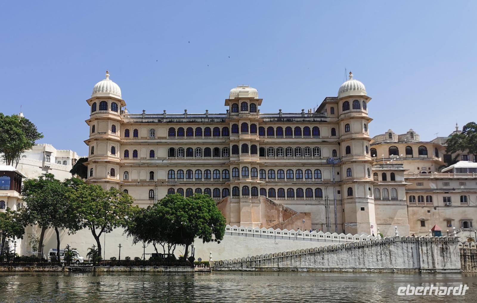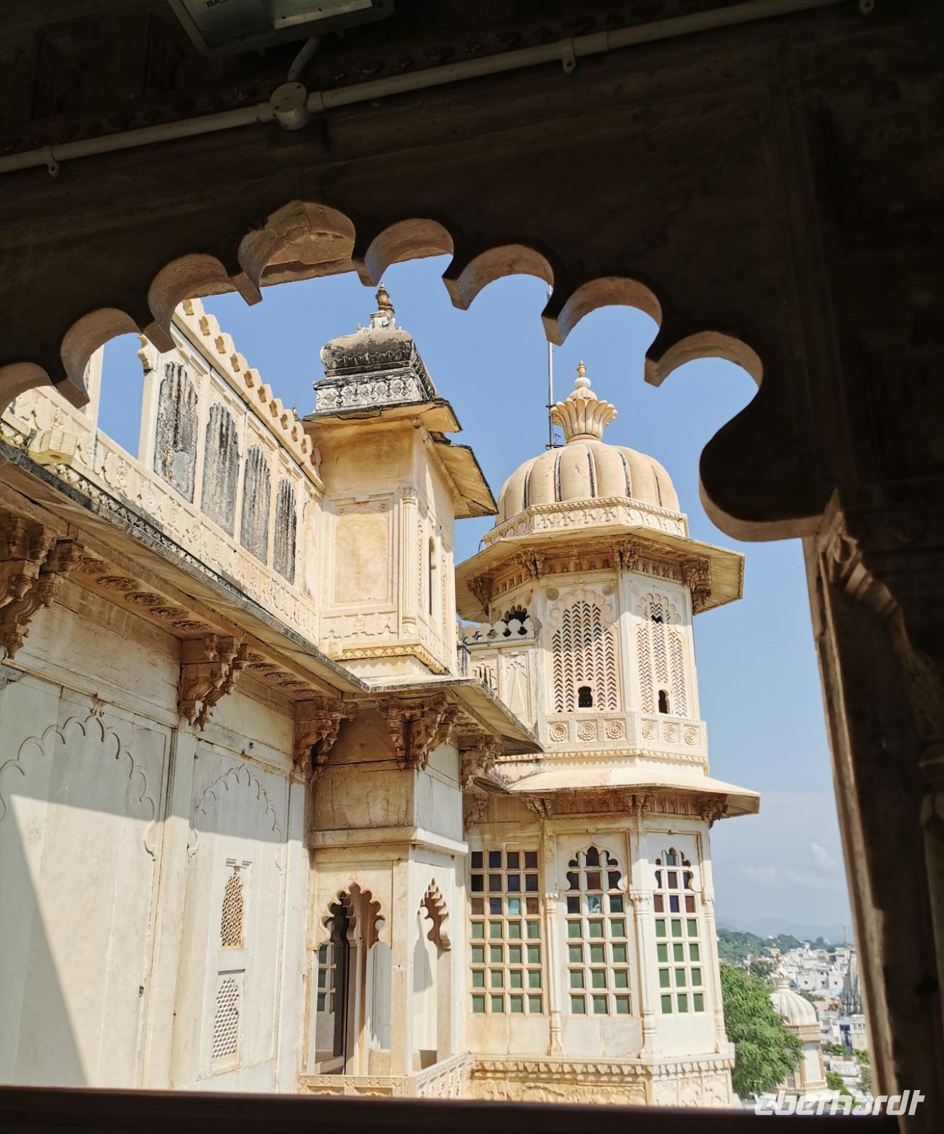 Udaipur, das "Venedig des Ostens" hat einen riesigen Stadtpalast, die ehemalige Residenz des Maharana. Vor über 400 Jahren, genau 1553 wurde dieser Bau von Maharana Udai Singh II. begonnen, immer wieder an- und umgebaut und heute beherbergt er ein riesiges Museum mit Interieur aus der vergangenen Zeit. Wir wandelten zwei Stunden durch die vielen Gemächer mit ihren bunten Wandfarben, sahen verspiegelte Zimmer mit Kuppeln, genossen Ausblicke durch verzierte Fenster auf die schöne Stadt am See und konnten uns gut vorstellen, wie ein Maharana in solch einem Pomp gelebt haben mußte.