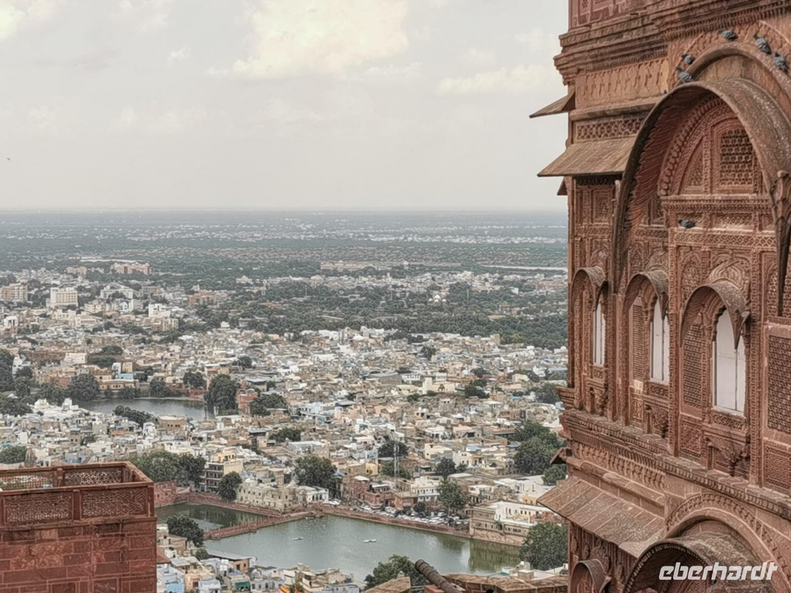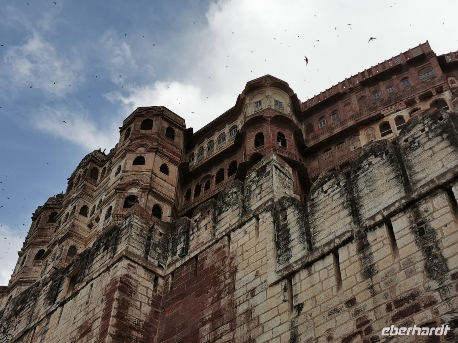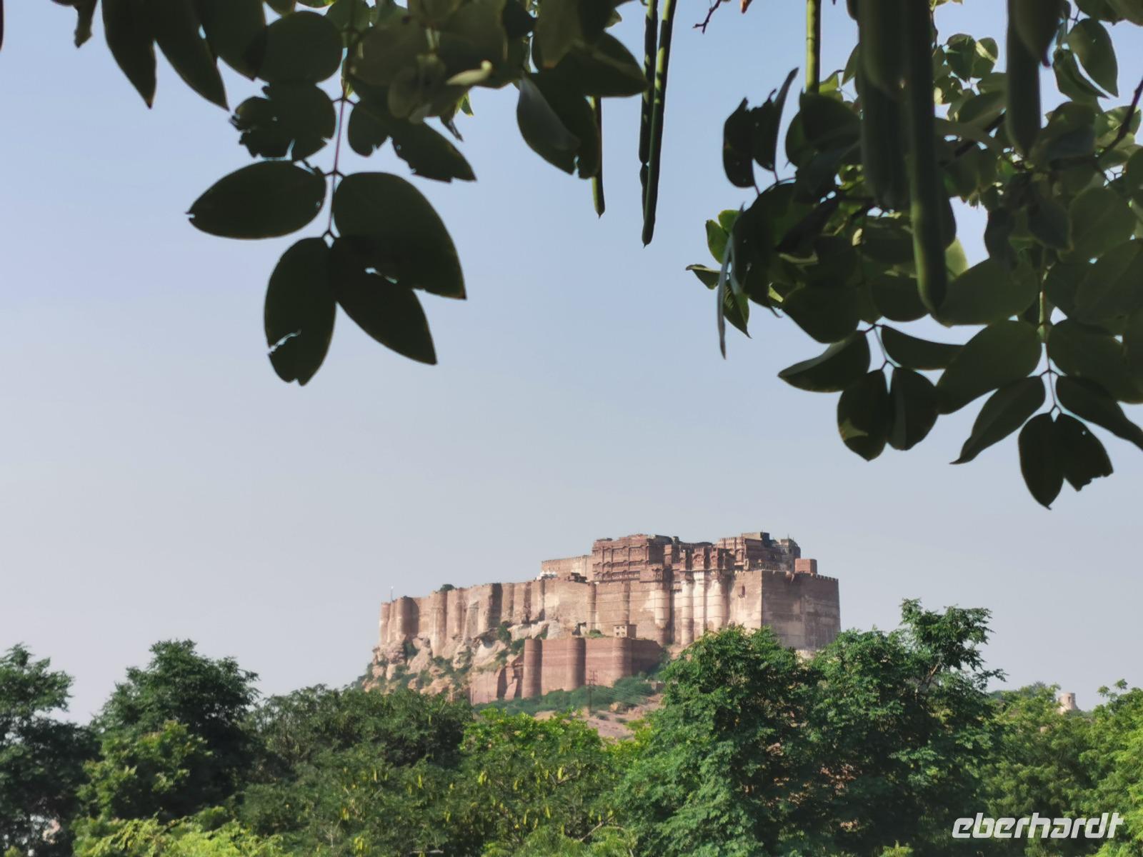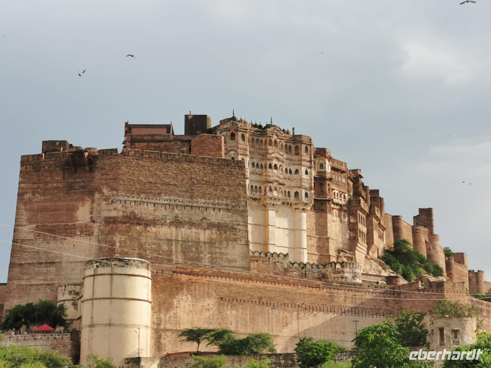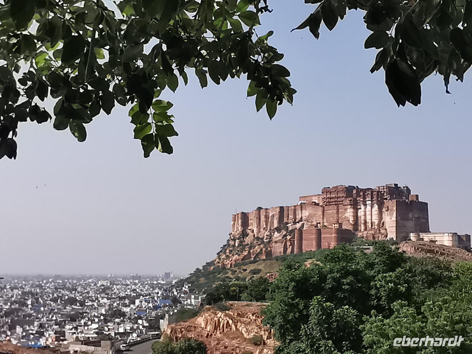 Die Festung Meherangarh thront 123 Meter über der Stadt auf einem Felsen und stammt aus dem Jahre 1459. Die heute zu besichtigenden Teile stammen aus der Periode des Maharaja Jaswant Singh, der von 1638 bis 1678 regierte.