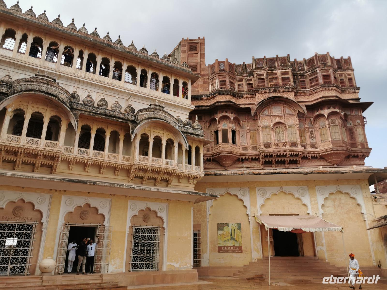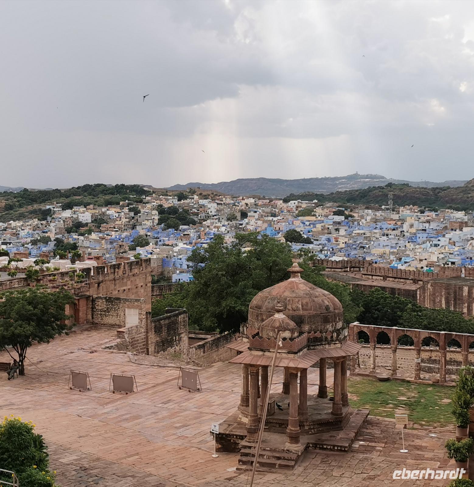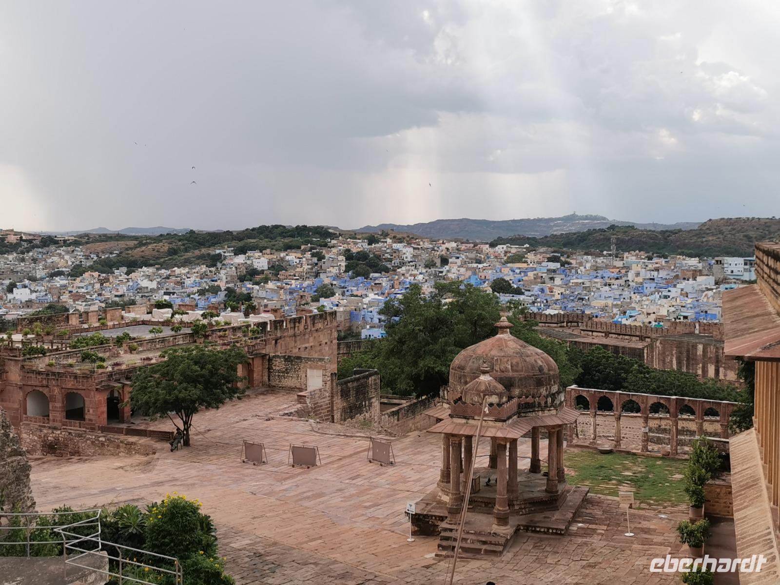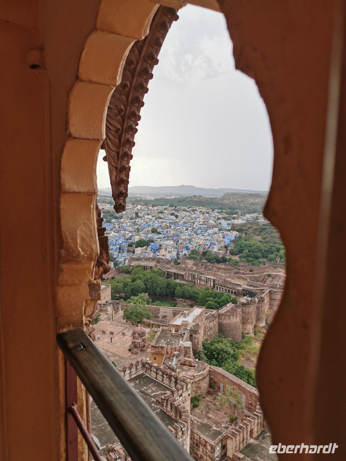 Die Festung Meherangarh thront 123 Meter über der Stadt auf einem Felsen und stammt aus dem Jahre 1459. Die heute zu besichtigenden Teile stammen aus der Periode des Maharaja Jaswant Singh, der von 1638 bis 1678 regierte.